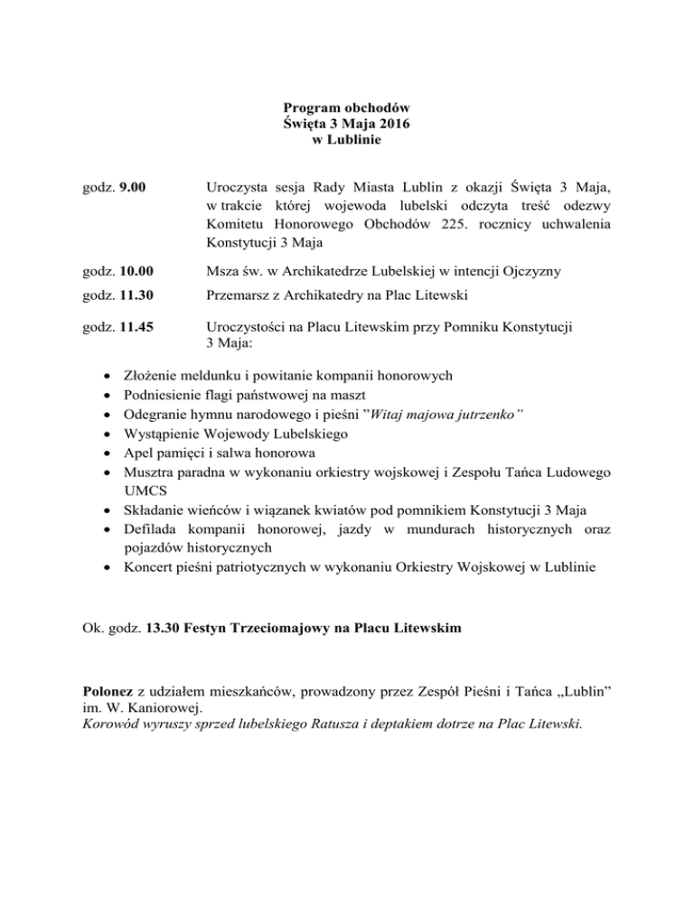 Program obchodów Święta 3 Maja 2016 w Lublinie godz. 9.00 Uroczysta sesja Rady Miasta Lublin z okazji Święta 3 Maja, w trakcie której wojewoda lubelski odczyta treść odezwy Komitetu Honorowego Obchodów 225. rocznicy uchwalenia Konstytucji 3 Maja godz. 10.00 Msza św. w Archikatedrze Lubelskiej w intencji Ojczyzny godz. 11.30 Przemarsz z Archikatedry na Plac Litewski godz. 11.45 Uroczystości na Placu Litewskim przy Pomniku Konstytucji 3 Maja: Złożenie meldunku i powitanie kompanii honorowych Podniesienie flagi państwowej na maszt Odegranie hymnu narodowego i pieśni ”Witaj majowa jutrzenko” Wystąpienie Wojewody Lubelskiego Apel pamięci i salwa honorowa Musztra paradna w wykonaniu orkiestry wojskowej i Zespołu Tańca Ludowego UMCS Składanie wieńców i wiązanek kwiatów pod pomnikiem Konstytucji 3 Maja Defilada kompanii honorowej, jazdy w mundurach historycznych oraz pojazdów historycznych Koncert pieśni patriotycznych w wykonaniu Orkiestry Wojskowej w Lublinie Ok. godz. 13.30 Festyn Trzeciomajowy na Placu Litewskim Polonez z udziałem mieszkańców, prowadzony przez Zespół Pieśni i Tańca „Lublin” im. W. Kaniorowej. Korowód wyruszy sprzed lubelskiego Ratusza i deptakiem dotrze na Plac Litewski. Ponadto: Koncert „Pieśni i Tańców Narodowych” w wykonaniu Zespołu Pieśni i Tańca „Lublin” im. W. Kaniorowej, Zespołu Pieśni i Tańca „Jawor” Uniwersytetu Przyrodniczego, Zespołu Pieśni i Tańca Uniwersytetu Medycznego w Lublinie, Zespołu Tańca Ludowego UMCS oraz Zespołu Pieśni i Tańca Politechniki Lubelskiej; Wspólne śpiewanie polskich pieśni patriotycznych, nauka tańców narodowych oraz warsztaty plastyczne (program przygotowany przez PSPiA Klanza i Zespół Sławiniacy); Wycieczki z przewodnikami PTTK „Lublin w czasach Konstytucji 3 Maja” (wyjście z przewodnikami sprzed Pomnika Konstytucji 3 Maja ok. godz. 14.00); Inne atrakcje dla dzieci i dorosłych, w tym m.in. wystawa pojazdów historycznych z okresu II wojny światowej, wspólne śpiewanie pieśni patriotycznych animowane przez Zespół Sławiniacy oraz Grupę Wokalną „Albertus”, malowanie twarzy w barwach narodowych, wręczenie chorągiewek i balonów, a także waty cukrowej dla dzieci. Fundacja Niepodległości zaprezentuje zabytkowe pojazdy wojskowe prowadzone przez rekonstruktorów z Grupy Edukacji Historycznej. Pojazdy w barwach jednostek 2 Korpusu Polskiego walczącego we Włoszech pod dowództwem gen. Władysława Andersa: Samochód terenowy Willys „Jeep” w barwach 5 Kresowej Dywizji Piechoty; Daimler „Dingo” – wóz dowódcy w barwach 6 Pułku Pancernego „Dzieci Lwowskich” z polskiej 2 Brygady Pancernej; White Scout Car – opancerzony wóz zwiadowczy z 15 Pułku Ułanów Poznańskich; Transporter opancerzony Half-track z baterią czterech najcięższych karabinów maszynowych w barwach 1 Dywizji Pancernej, walczącej w północnej Europie pod dowództwem gen. Stanisława Maczka.