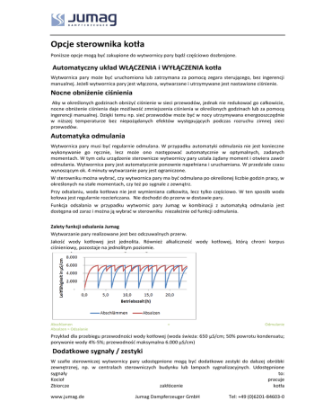 Opcje sterownika kotła Poniższe opcje mogą być zakupione do wytwornicy pary bądź częściowo dozbrojone. Automatyczny układ WŁĄCZENIA i WYŁĄCZENIA kotła Wytwornica pary może być uruchomiona lub zatrzymana za pomocą zegara sterującego, bez ingerencji manualnej. Jeżeli wytwornica pary jest włączona, wytwarzane i utrzymywane jest nastawione ciśnienie. Nocne obniżenie ciśnienia Aby w określonych godzinach obniżyć ciśnienie w sieci przewodów, jednak nie redukować go całkowicie, nocne obniżenie ciśnienia daje możliwość zmniejszenia ciśnienia w określonych godzinach lub za pomocą ingerencji manualnej. Dzięki temu np. sieć przewodów może być w nocy utrzymywana energooszczędnie w niższej temperaturze bez niepożądanych efektów występujących podczas rozruchu zimnej sieci przewodów. Automatyka odmulania Wytwornica pary musi być regularnie odmulana. W przypadku automatyki odmulania nie jest konieczne wykonywanie go ręcznie, lecz może ono następować automatycznie w optymalnych, zadanych momentach. W tym celu urządzenie sterownicze wytwornicy pary ustala żądany moment i otwiera zawór odmulania. Wytwornica pary jest automatycznie ponownie napełniana i uruchamiana. W przedziale czasu wynoszącym ok. 4 minuty wytwarzanie pary jest ograniczone. W sterowniku można wybrać, czy wytwornica pary ma być odmulana po określonej liczbie godzin pracy, w określonych na stałe momentach, czy też po sygnale z zewnątrz. Przy odsalaniu, woda kotłowa nie jest wymieniana całkowita, lecz tylko częściowo. W ten sposób woda kołowa jest regularnie rozcieńczana. Nie dochodzi do przerw w dostawie pary. Funkcja odsalania w przypadku wytwornic pary Jumag w kombinacji z automatyką odmulania jest dostępna od zaraz i można ją wybrać w sterowniku niezależnie od funkcji odmulania. Zalety funkcji odsalania Jumag Wytwarzanie pary realizowane jest bez odczuwalnych przerw. Jakość wody kotłowej jest jednolita. Również alkaliczność wody kotłowej, którą chroni korpus ciśnieniowy, pozostaje na jednolitym poziomie. Abschlamen Absalzen = Odsalanie = Odmulanie Przykład dla przebiegu przewodności wody kotłowej (woda świeża: 650 µS/cm; 50% powrotu kondensatu; porywanie wody 4%-5%; przewodność maksymalna 6.000 µS/cm) Dodatkowe sygnały / zestyki W szafie sterowniczej wytwornicy pary udostępnione mogą być dodatkowe zestyki do dalszej obróbki zewnętrznej, np. w centralach sterowniczych budynku lub lampach sygnalizacyjnych. Udostępnione sygnały to: Kocioł pracuje Zbiorcze zakłócenie kotła www.jumag.de Jumag Dampferzeuger GmbH Tel: +49 (0)6201-84603-0 Przerwa w Zewnętrzne zezwolenie odmulania pracy palnika Zewnętrzna wartość zadana ciśnienia pary Za pomocą opcji „Zewnętrzna wartość zadana ciśnienia pary“ można określić i zmienić ciśnienie pary z zewnątrz. W tym celu przetwarzane są albo sygnały 0-10 V, albo sygnały 4-20 mA. Podłączenie do Ethernetu Urządzenie sterownicze wytwornicy pary może być przygotowane do podłączenia do Ethernetu. Jak w przypadku „dodatkowych zestyków“ dane mogą być odpowiednio przekazane przez Ethernet. Sterowanie sekwencyjne kotłami W przypadku instalacji wielokrotnych kaskadowy układ kotłów optymalizuje rozdzielanie mocy na różne wytwornice pary. Dzięki równomiernemu wykorzystaniu wytwornic pary są one równomiernie użytkowane i możliwe jest optymalne wykorzystanie energii. W przypadku sekwencyjnego sterowania kotłowego następuje zoptymalizowanie obciążenia wytwornic pary. Sterowanie to bierze pod uwagę to, że wszystkie wytwornice pary wykorzystywane są jednolicie, przy czym kocioł z najmiejszą ilością roboczogodzin (jest kotłem nadrzędnym) i jako ostatni przełączany jest w stan czuwania. Jeśli kocioł nadrzędny zostaje wyłączony z ruchu lub jest odmulany, wtedy inny kocioł przejmuje zadania kotła nadrzędnego. Korzyści dla użytkownika: - Moce wytwórcze są mobilizowane tylko wtedy, gdy są właśnie w danej chwili potrzebne. Następuje w ten sposób zmniejszenie strat tytułem czuwania. Wszystkie kotły używane są jednolicie. W ten sposób można dokładnie zaplanować harmonogram serwisowania. W razie zakłócenia wytwornicy pary, inna wytwornica pary przejmuje automatycznie koordynację generowania pary oraz sterowania osprzętem. Dzięki technologii Plug & Steam można łatwo łączyć ze sobą wytwornice pary oraz osprzęt Jumag za pośrednictwem kabla ethernetowego. Funkcja modemu Dzięki tej funkcji istnieje możliwość przesyłu informacji o pracy wytwornicy na komórkę. W ten sposób w przypadku awarii informację otrzyma się natychmiastowo. www.jumag.de Jumag Dampferzeuger GmbH Tel: +49 (0)6201-84603-0 Po przez telefon komórkowy można również załączyć lub wyłączyć wytwornicę. www.jumag.de Jumag Dampferzeuger GmbH Tel: +49 (0)6201-84603-0 www.jumag.de Jumag Dampferzeuger GmbH Tel: +49 (0)6201-84603-0