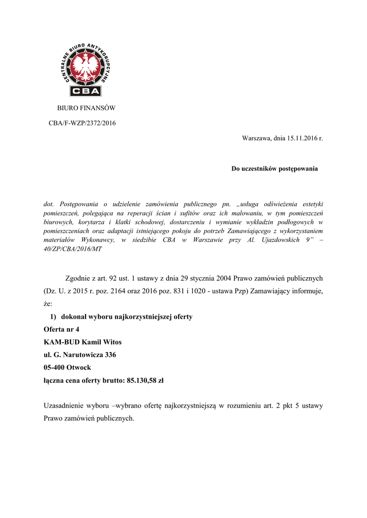 BIURO FINANSÓW CBA/F-WZP/2372/2016 Warszawa, dnia 15.11.2016 r. Do uczestników postępowania dot. Postępowania o udzielenie zamówienia publicznego pn. „usługa odświeżenia estetyki pomieszczeń, polegająca na reperacji ścian i sufitów oraz ich malowaniu, w tym pomieszczeń biurowych, korytarza i klatki schodowej, dostarczeniu i wymianie wykładzin podłogowych w pomieszczeniach oraz adaptacji istniejącego pokoju do potrzeb Zamawiającego z wykorzystaniem materiałów Wykonawcy, w siedzibie CBA w Warszawie przy Al. Ujazdowskich 9” – 40/ZP/CBA/2016/MT Zgodnie z art. 92 ust. 1 ustawy z dnia 29 stycznia 2004 Prawo zamówień publicznych (Dz. U. z 2015 r. poz. 2164 oraz 2016 poz. 831 i 1020 - ustawa Pzp) Zamawiający informuje, że: 1) dokonał wyboru najkorzystniejszej oferty Oferta nr 4 KAM-BUD Kamil Witos ul. G. Narutowicza 336 05-400 Otwock łączna cena oferty brutto: 85.130,58 zł Uzasadnienie wyboru –wybrano ofertę najkorzystniejszą w rozumieniu art. 2 pkt 5 ustawy Prawo zamówień publicznych. W postępowaniu oferty zostały złożone przez następujących Wykonawców: nr oferty Wykonawca 1 Euro-Bud , Iwona Bohatyrowicz, ul.Sasin 2/3, 05-200 Wołomin 2 IMPORT EXPORT HANDEL, Ewa Dudek, ul. Puławska 11, 02-515 Warszawa 3 Usługi Ogólnobudowlane, ul. Słoneczna 33B, 05-200 Wołomin 4 KAM-BUD, Kamil Witos, ul. G. Narutowicza 336, 05-400 Otwock 5 PHU MAGNUM, Agnieszka Ciupa, ul. Rynkowa 12, 08-110 Siedlce 6 „EWITAX” Sp. z o.o., ul. Stawki 1 m. 5, 00-193 Warszawa 7 TOMWID, Przedsiębiorstwo Produkcyjno-Handlowo-Usługowe w branży budowlanej, ul. Powstańców 6 m. 4, 05-200 Wołomin Streszczenie oceny ofert i porównania ofert z punktacją przyznaną Wykonawcom w kryterium: Cena oferty brutto – waga 60%, Termin gwarancji na wykonane prace i użyte materiały – 40%, Termin gwarancji na wykonane prace i użyte materiały Liczba punktów w kryterium „Termin gwarancji na wykonane prace i użyte materiały” Łączna ilość punktów Nr oferty Cena oferty brutto (zł) Liczba punktów w kryterium „cena oferty brutto” 3 91.810,13 55,63 60 miesięcy 40,00 95,63 4 85.130,58 60,00 60 miesięcy 40,00 100,00 6 98.018,70 52,11 60 miesięcy 40,00 92,11 Dyrektor Biura Finansów Centralnego Biura Antykorupcyjnego Daniel Art