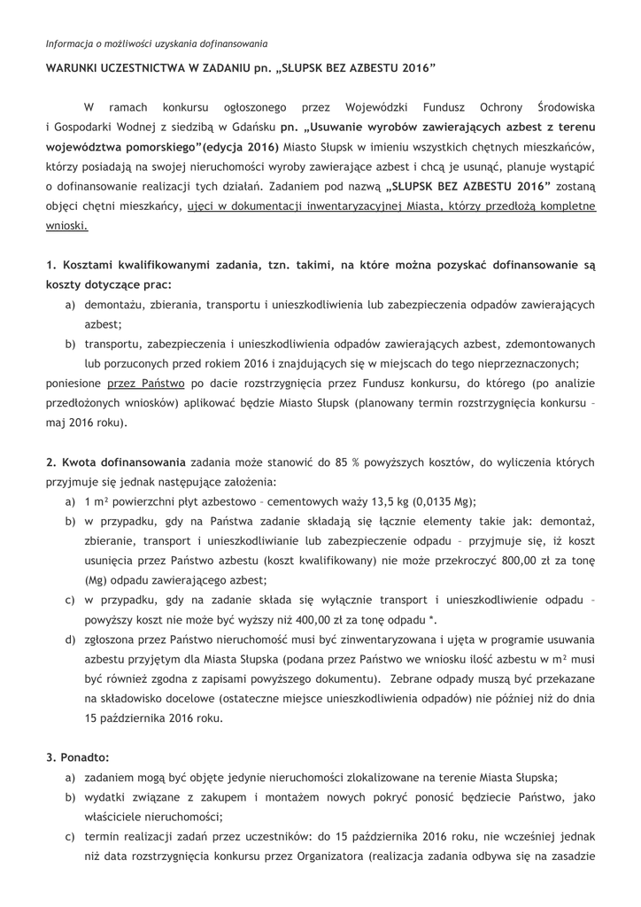 Informacja o możliwości uzyskania dofinansowania WARUNKI UCZESTNICTWA W ZADANIU pn. „SŁUPSK BEZ AZBESTU 2016” W ramach konkursu ogłoszonego przez Wojewódzki Fundusz Ochrony Środowiska i Gospodarki Wodnej z siedzibą w Gdańsku pn. „Usuwanie wyrobów zawierających azbest z terenu województwa pomorskiego”(edycja 2016) Miasto Słupsk w imieniu wszystkich chętnych mieszkańców, którzy posiadają na swojej nieruchomości wyroby zawierające azbest i chcą je usunąć, planuje wystąpić o dofinansowanie realizacji tych działań. Zadaniem pod nazwą „SŁUPSK BEZ AZBESTU 2016” zostaną objęci chętni mieszkańcy, ujęci w dokumentacji inwentaryzacyjnej Miasta, którzy przedłożą kompletne wnioski. 1. Kosztami kwalifikowanymi zadania, tzn. takimi, na które można pozyskać dofinansowanie są koszty dotyczące prac: a) demontażu, zbierania, transportu i unieszkodliwienia lub zabezpieczenia odpadów zawierających azbest; b) transportu, zabezpieczenia i unieszkodliwienia odpadów zawierających azbest, zdemontowanych lub porzuconych przed rokiem 2016 i znajdujących się w miejscach do tego nieprzeznaczonych; poniesione przez Państwo po dacie rozstrzygnięcia przez Fundusz konkursu, do którego (po analizie przedłożonych wniosków) aplikować będzie Miasto Słupsk (planowany termin rozstrzygnięcia konkursu – maj 2016 roku). 2. Kwota dofinansowania zadania może stanowić do 85 % powyższych kosztów, do wyliczenia których przyjmuje się jednak następujące założenia: a) 1 m² powierzchni płyt azbestowo – cementowych waży 13,5 kg (0,0135 Mg); b) w przypadku, gdy na Państwa zadanie składają się łącznie elementy takie jak: demontaż, zbieranie, transport i unieszkodliwianie lub zabezpieczenie odpadu – przyjmuje się, iż koszt usunięcia przez Państwo azbestu (koszt kwalifikowany) nie może przekroczyć 800,00 zł za tonę (Mg) odpadu zawierającego azbest; c) w przypadku, gdy na zadanie składa się wyłącznie transport i unieszkodliwienie odpadu – powyższy koszt nie może być wyższy niż 400,00 zł za tonę odpadu *. d) zgłoszona przez Państwo nieruchomość musi być zinwentaryzowana i ujęta w programie usuwania azbestu przyjętym dla Miasta Słupska (podana przez Państwo we wniosku ilość azbestu w m² musi być również zgodna z zapisami powyższego dokumentu). Zebrane odpady muszą być przekazane na składowisko docelowe (ostateczne miejsce unieszkodliwienia odpadów) nie później niż do dnia 15 października 2016 roku. 3. Ponadto: a) zadaniem mogą być objęte jedynie nieruchomości zlokalizowane na terenie Miasta Słupska; b) wydatki związane z zakupem i montażem nowych pokryć ponosić będziecie Państwo, jako właściciele nieruchomości; c) termin realizacji zadań przez uczestników: do 15 października 2016 roku, nie wcześniej jednak niż data rozstrzygnięcia konkursu przez Organizatora (realizacja zadania odbywa się na zasadzie refundacji poniesionych kosztów, wykonawcę zadania wybiera uczestnik zadania - mieszkaniec, zwrot kosztów następuje po przedłożeniu dokumentów z realizacji zadania i jego rozliczeniu); d) koniecznym będzie również zgłoszenie przez Państwo ww. prac do właściwego organu administracji architektoniczno – budowlanej**, e) udzielenie dotacji przedsiębiorcy następuje zgodnie z przepisami ustawy z dnia 30 kwietnia 2004 roku o postępowaniu w sprawach dotyczących pomocy publicznej (tj. Dz. U. Z 2007r., Nr 59, poz. 404 ze zm.). 4. W przypadku wyrażenia przez Państwo chęci udziału w zadaniu, w celu zakwalifikowania nieruchomości do zadania „SŁUPSK BEZ ABESTU 2016” należy przedłożyć: Wniosek o zakwalifikowanie nieruchomości do zadania pn. „SŁUPSK BEZ AZBESTU 2016”, w którym wskazują Państwo swoją nieruchomość wraz z rodzajem i ilością wyrobów zawierających azbest (można zgłosić każdy rodzaj wyrobu, np. pokrycia dachowe, wiaty, elewacje na budynkach) wraz z załącznikami, tj. z: a) oceną stanu i możliwości bezpiecznego użytkowania wyrobów zawierających azbest; b) kopią: dokonanego zgłoszenia prac polegających na wymianie pokryć eternitowych, o którym mowa w niniejszej informacji oraz oświadczeniem o posiadanym prawie do dysponowania nieruchomością na cele budowlane stanowiącym załącznik do zgłoszenia; c) dokumentacją fotograficzną obiektu, obrazującą jego stan przed rozpoczęciem prac, umożliwiającą porównanie z dokumentacją powykonawczą. DO ZADANIA ZOSTANĄ ZAKWALIFIKOWANE TYLKO KOMPLETNIE PRZEDŁOŻONE WNIOSKI. Po analizie wszystkich zgłoszeń i rozstrzygnięciu konkursu przez Fundusz zostaną Państwo poinformowani o dalszym trybie uczestnictwa w zadaniu. Wojewódzki Fundusz Ochrony Środowiska i Gospodarki Wodnej z siedzibą w Gdańsku zastrzega sobie również prawo unieważnienia konkursu, o czym zostaną poinformowani uczestnicy zadania. * przykład dla obliczenia kwoty dotacji dla powierzchni 1062 m² : planowana ilość odpadu do usunięcia: 1062 m² x 13,5 kg = 14,34 tony odpadu; 14,34 tony odpadu pomnożona przez przyjętą przez Fundusz efektywność kosztową: a) x 800,00 zł/1 tonę = 11.472,00 zł (w przypadku demontażu, transportu, i unieszkodliwienia) (11.472,00 zł to całkowity koszt realizacji zadania – 100%; dotacja w wysokości do 85 % całkowitych kosztów = do 9.751,20 zł) b) x 400,00 zł/1 tonę = 5.736,00 zł (w przypadku transportu, i unieszkodliwienia) (5.736,00 zł to całkowity koszt realizacji zadania – 100%; dotacja w wysokości do 85 % całkowitych kosztów = do 4.875,60 zł) ** Na właścicielu, użytkowniku wieczystym bądź zarządcy nieruchomości (na podstawie § 6 pkt 4 Rozporządzenia Ministra Gospodarki Pracy i Polityki Społecznej z dnia 02 kwietnia 2004 roku) ciąży obowiązek zgłoszenia prac polegających na zabezpieczaniu lub usuwaniu wyrobów zawierających azbest do właściwego organu administracji architektoniczno – budowlanej (w przypadku Miasta Słupska – Pre