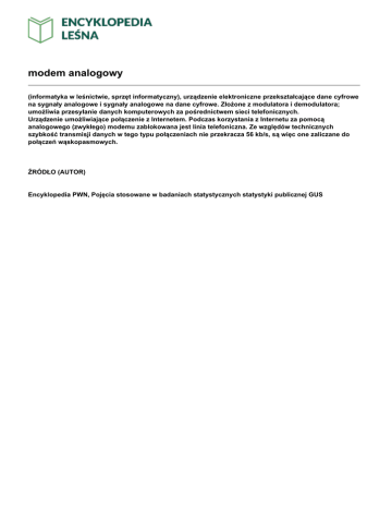 modem analogowy (informatyka w leśnictwie, sprzęt informatyczny), urządzenie elektroniczne przekształcające dane cyfrowe na sygnały analogowe i sygnały analogowe na dane cyfrowe. Złożone z modulatora i demodulatora; umożliwia przesyłanie danych komputerowych za pośrednictwem sieci telefonicznych. Urządzenie umożliwiające połączenie z Internetem. Podczas korzystania z Internetu za pomocą analogowego (zwykłego) modemu zablokowana jest linia telefoniczna. Ze względów technicznych szybkość transmisji danych w tego typu połączeniach nie przekracza 56 kb/s, są więc one zaliczane do połączeń wąskopasmowych. ŹRÓDŁO (AUTOR) Encyklopedia PWN, Pojęcia stosowane w badaniach statystycznych statystyki publicznej GUS