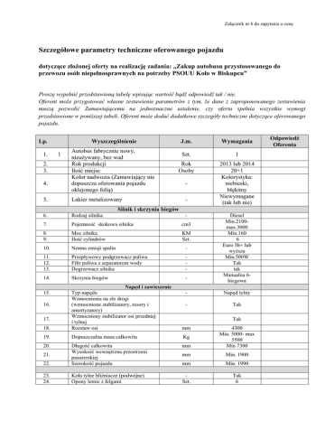 Załącznik nr 6 do zapytania o cenę Szczegółowe parametry techniczne oferowanego pojazdu dotyczące złożonej oferty na realizację zadania: „Zakup autobusu przystosowanego do przewozu osób niepełnosprawnych na potrzeby PSOUU Koło w Biskupcu” Proszę wypełnić przedstawioną tabelę wpisując wartość bądź odpowiedź tak / nie. Oferent może przygotować własne zestawienie parametrów z tym, że dane z zaproponowanego zestawienia muszą pozwolić Zamawiającemu na jednoznaczne ustalenie, czy oferta spełnia wszystkie wymogi przedstawione w poniższej tabeli. Oferent może dodać dodatkowe szczegóły techniczne dotyczące oferowanego pojazdu. Wyszczególnienie Lp. 1. 2. 3. 4. 1 Autobus fabrycznie nowy, nieużywany, bez wad Rok produkcji Ilość miejsc Kolor nadwozia (Zamawiający nie dopuszcza oferowania pojazdu oklejonego folią) J.m. Wymagania Szt. 1 Rok Osoby 2013 lub 2014 20+1 Kolorystyka: niebieski, błękitny Niewymagane (tak lub nie) - 5. Lakier metalizowany - 6. Rodzaj silnika 7. Pojemność skokowa silnika cm3 8. 9. Moc silnika Ilość cylindrów KM Szt. 10. Norma emisji spalin - 11. 12. 13. Przepływowy podgrzewacz paliwa Filtr paliwa z separatorem wody Dogrzewacz silnika - 14. Skrzynia biegów - Silnik i skrzynia biegów - Diesel Min.2100max.3000 Min.160 6 Euro 5b+ lub wyższa Min.500W Tak tak Manualna 6biegowa 18. Napęd i zawieszenie Typ napędu Wzmocnienia na złe drogi (wzmocnione stabilizatory, resory i amortyzatory) Wzmocniony stabilizator osi przedniej i tylnej Rozstaw osi mm 19. Dopuszczalna masa całkowita Kg 20. mm mm Min. 1900 22. Długość całkowita Wysokość wewnętrzna przestrzeni pasażerskiej Szerokość pojazdu 4300 Min. 5000- max 5500 Min 7300 mm Min. 1990 23. 24. Koła tylne bliźniacze (podwójne) Opony letnie z felgami Szt. Tak 6 15. 16. 17. 21. - Napęd tylny - Tak Tak Odpowiedź Oferenta 25. 26. 27. 28. 29. 30. 31. 32. 33. 34. 35. 36. 37. 38. 39. 40. 41. 42. 43. 44. 45. 46. 47. 48. 49. 50. 51. 52. 53. 54. 55. 56. 57. 58. 59. 60. Dodatkowe opony zimowe Szt. Chlapacze przednich i tylnych kół Szt. Pełnowymiarowe koło zapasowe Szt. Zestaw podręcznych narzędzi Kpl. Układ Hamulcowy, Bezpieczeństwo Układ hamulcowy dwuobwodowy, hydrauliczny ze wspomaganiem Hamulce tarczowe wentylowane przód i tył Hamulec postojowy Duo-Servo System ABS System ESP System ASR System EBV System awaryjnego hamowania BAS Wskaźnik zużycia klocków hamulcowych Poduszka powietrzna dla kierowcy Asystent ruszania pod górę Zabezpieczenia Centralny zamek sterowany pilotem Immobiliser Zabezpieczenie drzwi przed otwarciem od wewnątrz Kabina kierowcy System audio- wymagania minimum: radio z Bluetooth, USB, AUX-in, czytnikiem kart SD, i głośnikami: min. 2 w kabinie kierowcy i min. 4 w przedziale pasażerskim, Radio CB+ antena Szyby boczne z przodu (kierowcy i pasażera) sterowane elektrycznie Lusterka zewnętrzne podgrzewane Kierunkowskazy w lusterkach Fotel kierowcy komfortowy, hydrauliczny, resorowany, z podłokietnikami i zagłówkiem, podgrzewany Fotel kierowcy i pasażera, tapicerowany w kolorze siedzeń Tak Tak Tak Tak Tak Tak Tak Tak Tak Tak Tak Tak Tak Tak Tak Tak Tak Tak Tak Tak Tak Tak, manualna lub elektroniczna Klimatyzacja fabryczna samochodu Nadwozie Światła halogenowe z funkcją doświetlania zakrętów Światła przeciwmgłowe przód i tył Światła do jazdy dziennej Główny wyłącznik akumulatora Certyfikowany ogranicznik prędkości 100km/h Tachograf cyfrowy z menu w języku polskim Czujniki wspomagające parkowanie tyłem Zbiornik paliwa Dodatkowy stopień przy tylnym zderzaku Wyposażenie Przeszklenie przedziału pasażerskiego: szyby podwójne, 6 4 1 1 Tak Tak Tak Tak Tak Tak Tak L Min. 75l Tak Tak 61. 62. 63. 64. 65. 66. 67. 68. 69. 70. 71. 72. 73. 74. 75. 76. 77. 78. 79. przyciemniane, termoizolacyjne Firanki przeciwsłoneczne na prowadnicach Tak Niewymagane (tak lub nie) Szyby w drzwiach tylnych Izolacja dźwiękowo-termiczna przestrzeni pasażerskiej Pokrycie ścian, słupków tapicerką miękką Podłoga płaska, wyłożona sklejką wodoodporną, pokryta wykładziną antypoślizgową, a w przejściu pomiędzy fotelami wyłożona dodatkowo wykładziną Fotele w przestrzeni pasażerskiej: komfortowe, turystyczne, z regulacją oparcia, podłokietniki po stronie zewnętrznej, z zagłówkami, z uchwytami bocznymi po stronie przejścia, pojedyncze; w tym 4 fotele powinny mieć mocowanie ISOFIX do fotelików dziecięcych Możliwość wyboru kolorystyki siedzeń i materiału Trójpunktowe pasy bezpieczeństwa na wszystkie fotele pasażerów i kierowcy Wszystkie fotele w przestrzeni pasażerskiej mocowane w systemie szynowym umożliwiającym w łatwy i szybki sposób przesuwanie foteli Część foteli z szybkim montażem i demontażem (np. na nogach NMI, Martech), aby umożliwić montaż wózków inwalidzkich Komplet atestowanych pasów zabezpieczających wózki inwalidzkie, mocowanie wózków czteropunktowe w systemie szynowym Pasy zabezpieczające osobę niepełnosprawną na wózku inwalidzkim, (dwupunktowe krzyżowe) Najazdy do wprowadzania wózków inwalidzkich, składane Wejście do autobusu przez drzwi przesuwane Sterowanie elektryczne zamykaniem i otwieraniem drzwi przesuwanych z dodatkowym sterowaniem z pozycji kierowcy oraz elektrycznym domykaniem drzwi przesuwnych Oświetlenie stopnia wejściowego w drzwiach przesuwanych Dodatkowy uchwyt-poręcz ułatwiający wsiadanie, po prawej stronie drzwi przesuwanych Dodatkowy mały uchwyt-poręcz ułatwiający wsiadanie, przy drzwiach przednich pasażera Poręcz zabezpieczająca pasażera, przed pierwszym fotelem przy drzwiach przesuwanych Tak Tak Tak Tak Tak Tak Tak Ilość foteli Min. 7 foteli kpl. Na 2 wózki Kpl. Dla 2 osób Tak Tak Tak Tak Tak Tak Tak 80. 81. 82. 83. 84. 85. 86. 87. 88. 89. 90. 91. 92. 93. 94. 95. 96. 97. Przegroda za fotelem kierowcy/ ścianka Ogrzewanie niezależne od pracy kW silnika, lewa i prawa strona. Klimatyzacja przestrzeni pasażerskiej, rozprowadzenie ce