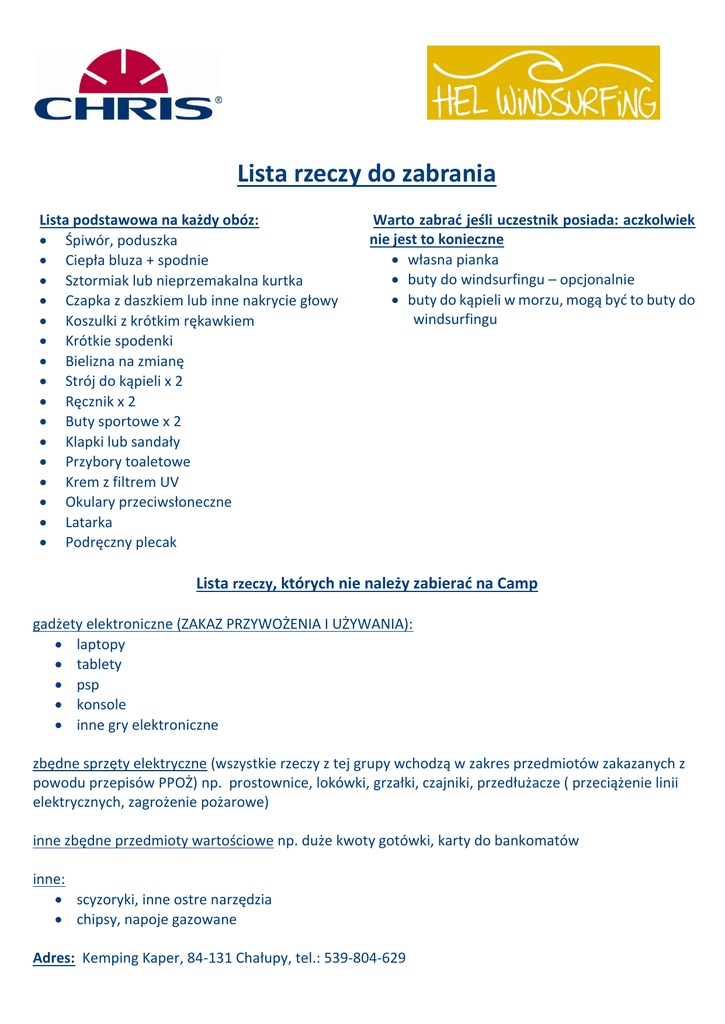 Lista rzeczy do zabrania Lista podstawowa na każdy obóz: Śpiwór, poduszka Ciepła bluza + spodnie Sztormiak lub nieprzemakalna kurtka Czapka z daszkiem lub inne nakrycie głowy Koszulki z krótkim rękawkiem Krótkie spodenki Bielizna na zmianę Strój do kąpieli x 2 Ręcznik x 2 Buty sportowe x 2 Klapki lub sandały Przybory toaletowe Krem z filtrem UV Okulary przeciwsłoneczne Latarka Podręczny plecak Warto zabrać jeśli uczestnik posiada: aczkolwiek nie jest to konieczne własna pianka buty do windsurfingu – opcjonalnie buty do kąpieli w morzu, mogą być to buty do windsurfingu Lista rzeczy, których nie należy zabierać na Camp gadżety elektroniczne (ZAKAZ PRZYWOŻENIA I UŻYWANIA): laptopy tablety psp konsole inne gry elektroniczne zbędne sprzęty elektryczne (wszystkie rzeczy z tej grupy wchodzą w zakres przedmiotów zakazanych z powodu przepisów PPOŻ) np. prostownice, lokówki, grzałki, czajniki, przedłużacze ( przeciążenie linii elektrycznych, zagrożenie pożarowe) inne zbędne przedmioty wartościowe np. duże kwoty gotówki, karty do bankomatów inne: scyzoryki, inne ostre narzędzia chipsy, napoje gazowane Adres: Kemping Kaper, 84-131 Chałupy, tel.: 539-804-629 Kontakt z dzieckiem: telefoniczny - najlepiej w porze posiłków. Godziny podane będą na stronie internetowej www.chris.com.pl w pierwszy poniedziałek po rozpoczęciu turnusu. UWAGA! Na obóz przyjmowane są dzieci zdrowe. Jeśli dziecko w dniu wyjazdu jest chore ( ma gorączkę, przyjmuje leki) prosimy o dowóz dziecka kilka dni później. Prosimy również o sprawdzenie głowy dziecka pod kątem wszawicy. To pozwoli na uniknięcie rozprzestrzeniania się chorób zakaźnych i wszy wśród innych uczestników. Z racji ograniczonego miejsca w lukach bagażowy bardzo prosimy o zabieranie bagażu o wadze około 20 kg i walizek o rozmiarze M (średnia) o maksymalnych wymiarach 45x25x65. Zakwaterowanie: prosimy o podanie nazwisk dzieci do wspólnego zakwaterowania na karcie kwalifikacyjnej lub poprzez kontakt mailowy lub telefoniczny z BOK, nie później niż na dwa tygodnie przed rozpoczęciem obozu. Przy realizacji zakwaterowania bierzemy pod uwagę datę przyjęcia zgłoszenia. Informujemy również, że w miarę możliwości staramy się zrealizować w tym zakresie wszystkie Państwa prośby.