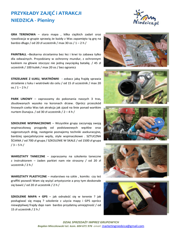 PRZYKŁADY ZAJĘĆ i ATRAKCJI NIEDZICA - Pieniny GRA TERENOWA – stara mapa , kilka ciężkich zadań oraz rywalizacja w grupie sprawią że każdy z Was zapamięta tą grę na bardzo długo / od 20 zł uczestnik / max 30 os / 1 – 2 h / PAINTBALL –Bezkarna strzelanina bez łez i krwi to zabawa tylko dla odważnych. Przyodziany w ochronny mundur, z ochronnym kaskiem na głowie stoczysz nie jedną zwycięską batalię. / 45 zł uczestnik / 100 kulek / max 20 os / bez ogranicz STRZELANIE Z ŁUKU, WIATRÓWKI - zobacz jaką frajdę sprawia strzelanie z łuku i wiatrówki do celu / od 15 zł uczestnik / max 20 os / 1 – 2 h / PARK LINOWY – zapraszamy do pokonania naszych 3 tras, zbudowanych wysoko na koronach drzew. Oprócz przeszkód linowych czeka Was tak atrakcja jak zjazd na linie ponad wartkim nurtem Dunajca. / od 30 zł uczestnik / 2 – 4 h / SZKOLENIE WSPINACZKOWE – Wszystkie grupy zaczynają swoją wspinaczkową przygodę od podstawowych węzłów oraz najprostszych dróg, następnie poznajemy techniki asekuracyjne, bardziej specjalistyczne węzły, style wspinaczkowe . SZTUCZNA ŚCIANA / od 700 zł grupa / SZKOLENIE W SKALE / od 1500 zł grupa /3–5h/ WARSZTATY TANECZNE – zapraszamy na szkolenia taneczne z instruktorem – żaden parkiet nam nie straszny / od 20 zł uczestnik / 2 h / WARSZTATY PLASTYCZNE – malarstwo na szkle , komiks czy też graffiti pozwoli Wam się wyżyć artystycznie a przy tym doskonale się bawić / od 20 zł uczestnik / 2 h / SZKOLENIE MAPA + GPS – jak odnaleźć się w terenie ? jak posługiwać się mapą ? szkolenie z użycia mapy i GPS oprócz niewątpliwej frajdy daje nam bardzo przydatną umiejętność / od 15 zł uczestnik / 2 h / DZIAŁ SPRZEDAŻY IMPREZ GRUPOWYCH Bogdan Mieczkowski tel. kom. 604 671 976 email: [email protected] SURVIVAL – jak rozpalić ognisko bez użycia zapałek ? Jak się zamaskować , czy też zbudować schronienie, o tym dowiecie się podczas szkolenia survivalowego / od 15 zł uczestnik / 1,5 – 2,5 h KARAOKE – Śpiewać każdy może – daj upust swojemu talentowi, zapraszamy na karaoke / od 15 zł uczestnik / 2 h / SZKOLENIE PIERWSZEJ POMOCY – profesjonalny kurs szkolenia pierwszej pomocy przeprowadzony przez ratownika medycznego / od 15 zł uczestnik / 1,5 h / SZKOLENIE LAWINOWE / ZIMA / - jak czuje się człowiek zasypany lawiną ? Co to jest sonda lawinowa ? Tego wszystkiego dowiecie się na szkoleniu lawinowym / od 15 zł uczestnik / 2 – 3 h / PRELEKCJE PODRÓŻNICZE – extremalne USA, dziki Kaukaz czy też zimna Norwegia, przedstawimy Wam naszą pasję – podróże, którą postaramy się Was zarazić / 300 zł grupa / 1,5 h / SZKOLENIE ROWEROWE / PODSTAWY DOWNHILL – zapraszamy na szkolenie jazdy downhillowej, i jazdy terenowej / od 20 zł / uczestnik / 2 – 4 h / OFFROAD – poczuj frajdę jazdy samochodem 4 x 4, który zawiezie Was dosłownie wszędzie / 250 zł / 1 h / 1 samochód / w każdym samochodzie znajduje się instruktor – do samochodu wchodzi max 4 uczestników , możliwość odbycia krótszych przejażdżek i rotacji uczestników / IZBA REGIONALNA W SROMOWCACH – wypiekanie chleba, wyrób i pieczenie moskoli, warsztaty tkackie, robienie kwiatów i ozdób z papieru i bibuły / 500 zł grupa/ 2 godz. / max 30 os WARSZTATY LEPIENIA Z GLINY – tradycyjne pokazy garncarskie, ćwiczenia z kołem garncarskim, wyroby z gliny świeczników i wazoników / 700 zł grupa / 3 godz. /max 30 os zajęcia przeprowadzane są przez instruktorów firmy MOUNTAIN TOUCH ul. Pod Sadami 5a, 34-460 Szczawnica http://www.mountain-touch.pl/ DZIAŁ SPRZEDAŻY IMPREZ GRUPOWYCH Bogdan Mieczkowski tel. kom. 604 671 976 email: [email protected]