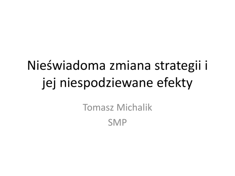 Nieświadoma zmiana strategii i jej niespodziewane efekty Tomasz Michalik SMP Teza • Pracując w dużej organizacji pracownicy są zobowiązani do realizacji jej celów strategicznych, są też z wyników skrupulatnie rozliczani. Im wyżej w organizacji tym odpowiedzialność jest coraz większa. Czy jednak pracując w takiej firmie mam wpływ na decyzję podjętą w stosunku do obszaru który mnie żywotnie dotyczy i nadal pozostać lojalnym? Wyzwania Grupy Advanced Ceramics and Modules • Wyzwania w postaci rosnącej konkurencji z Dalekiego Wschodu uruchomiły proces silnej erozji cen nawet do 20% w skali roku • Na rynku istniała silna nadprodukcja podzespołów do lamp kineskopowych, w skali Świata około 25% mocy wytwórczych nie było wykorzystanych • Technologia CRT rozpoczęła walkę z LCD co przełożyło się na konieczność szybkiej reakcji i wdrażania większych ekranów i obrazu o lepszej niż LCD jakości. Czas wdrożenia nowego ekranu skrócił się ponad 2x. • Grupa posiadała Zakłady na całym Świecie, każdy zaopatrujący lokalne rynki Strategia (niejawna) Grupy Advanced Ceramics and Modules • Obniżyć koszt wytworzenia kg materiału poprzez koncentrację produkcji w dwóch centrach Światowych do których zostaną przeniesione linie produkcyjne z lokalnych Zakładów – Wymieniono kierownictwo we wszystkich Zakładach należących do Grupy w celu łatwiejszego przebiegu projektów – Uruchomiono Grupę zajmującą się kupnem i sprzedażą nieruchomości, tak aby na transakcjach sprzedaży opuszczonych hal i ziemi zajmowanej przez Zakłady nie stracić kapitału – Tam gdzie to było możliwe oddano nieruchomości w ręce firm leasingowych • Wykupić udziały, lub poprzez agresywna politykę cenową doprowadzić do zamknięcia lokalnej konkurencji, zwiększony wolumen produkcji doprowadzi do dalszego zmniejszenia kosztów jednostkowych – W wyniku tego zakupiono w Polsce Zakład w Skierniewicach produkujący dla Polkoloru. Celem było przeniesienie wolumenu ze Skierniewic do Zakładu w UK – Rozpoczęto batalię cenową z Zakładami na Ukrainie i napływającą do Europy konkurencją Chińską • Koncentracja Zakładów także przyśpieszy wdrożenia i umożliwi łatwiejszy rozwój dojrzałej wtedy już technologii – Utworzono 3 Międzynarodowe Grupy Produktowe w celu łatwiejszej koordynacji projektów relokacyjnych oraz wdrożeniowych Rezultat dla Skierniewic • • • • • Grupa wraz ze wsparciem lokalnego Zespołu Projektowego nie zdołała zatwierdzić wszystkich wyrobów dla Piaseczna pochodzących z produkcji Zakładów w UK. Dla serii produktów opracowano materiał który spełniał wymagania klienta i został przez niego zaakceptowany i sprawdzony. Technologia jego wytwarzania okazała się nie możliwa do wdrożenia w UK bez poniesienia znaczących inwestycji kapitałowych. Uruchomiono w Zakładzie w Skierniewicach całą serię Projektów racjonalizatorskich oraz system zbierania sugestii pracowniczych. W rezultacie wyniki operacyjne oraz koszty kg wyrobu w Polsce były korzystniejsze aniżeli w innych Zakładach grupy licząc także Chiny. Nowe wyroby były realizowane na czas a poziom technicznych kompetencji porównywalny do tych w Zakładach w UK i ciągle się rozwijał poprzez współpracę w obrębie koncernu jak i z uczelniami w kraju jak i poza nim W rezultacie nastąpiło odwrócenie roli i zapadła decyzja o koncentracji produkcji w Polsce a nie w UK. Okazało się to w wyniku tańsze aniżeli przeniesienie Technologii produkcji materiału F810 z Polski do UK. Udział niższych kosztów robocizny nie był głównym kryterium (tylko 7% kosztów stanowiła robocizna w UK, gdy w Skierniewicach same oszczędności racjonalizatorskie sięgały 15% rocznie) Technologia CRT przegrała z LCD a Zakład w Skierniewicach był ostatnim w Grupie produkującym wyroby do samego końca …. Produkcja AGD w międzynarodowej firmie z Polskim lokalnym Zarządem • • • • Silny nacisk na obniżenie kosztów jednostkowych wywierany przez głównego Klienta, w wyniku czego Zarząd opracował strategię zwiększenia marży i zysków poprzez wyjście do nowych Klientów i wdrożenie wyrobów o większej wartości dodanej jak również i cenie Zarząd opracował listę potencjalnych nowych klientów, wzmocniono organizację poprzez wprowadzenia Business Development Managera i jego nowego Zespołu. Zespół sprzedażowy opracował plan uruchomień dla potencjalnych nowych klientów z którego wynikał konflikt o moce wytwórcze z produkcją dla obecnego (Główny klient zajmował ok 85% mocy wytwórczych) . Poinformowano głównego klienta o nowej strategii z naciskiem na zmniejszanie jego udziału w sprzedaży. Główny klient w rezultacie obiecał wsparcie nowej Strategii Główny klient Zakładów naciskał na kontrolę kosztów, co roku zwalniał jeden duży projekt do realizacji aby podtrzymać wolumen a co za tym idzie niskie koszty jednostkowe. Także sugerował rozwój kompetencji technicznych i Zarządzania Projektami aby zwiększyć retencję nowych uruchomień. Lokalny Zespół Projektowy miał bardzo dobre stosunki z klientem zarówno komercyjne jak i techniczne. Wsparcie Głównego klienta polegało na wstrzymaniu nowych uruchomień i przekierowaniu ich do konkurencji. Rezultat AGD • • • • • • Przez okres 2 lat Dział Sprzedaży nie pozyskał żadnego znaczącego nowego klienta. Rozdrobnione nowe wdrożenia okazały się produkcją wyrobów których nikt nie chciał produkować przeważnie z powodu błędów konstrukcyjnych. Ich uruchomienie pochłaniało dużą ilość zasobów, nadgodzin, kosztów napraw i modernizacji form, zakup nowych urządzeń. Aby zwiększyć efektywność sprzedażową Zarząd zatrudnił dodatkowe osoby do Działu Sprzedaży. Pomysłem Zarządu na chwilową poprawę wyników stały się opcję walutowe co dodatkowo negatywnie wpłynęło na wynik firmy. Po każdym okresie rozliczenio