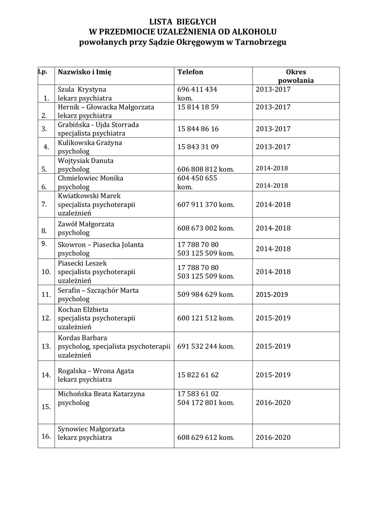 LISTA BIEGŁYCH W PRZEDMIOCIE UZALEŻNIENIA OD ALKOHOLU powołanych przy Sądzie Okręgowym w Tarnobrzegu lLp. 1. 2. 3. 4. 5. 6. 7. 8. 9. 10. 11. 12. 13. 14. 15. Nazwisko i Imię Telefon Szula Krystyna lekarz psychiatra Hernik – Głowacka Małgorzata lekarz psychiatra Grabińska - Ujda Storrada specjalista psychiatra Kulikowska Grażyna psycholog Wojtysiak Danuta psycholog Chmielowiec Monika psycholog Kwiatkowski Marek specjalista psychoterapii uzależnień Zawół Małgorzata psycholog 696 411 434 kom. 15 814 18 59 Skowron – Piasecka Jolanta psycholog Piasecki Leszek specjalista psychoterapii uzależnień Serafin – Szcząchór Marta psycholog Kochan Elżbieta specjalista psychoterapii uzależnień Kordas Barbara psycholog, specjalista psychoterapii uzależnień Okres powołania 2013-2017 2013-2017 15 844 86 16 2013-2017 15 843 31 09 2013-2017 606 808 812 kom. 604 450 655 kom. 2014-2018 607 911 370 kom. 2014-2018 608 673 002 kom. 2014-2018 17 788 70 80 503 125 509 kom. 2014-2018 17 788 70 80 503 125 509 kom. 2014-2018 509 984 629 kom. 2015-2019 600 121 512 kom. 2015-2019 691 532 244 kom. 2015-2019 Rogalska – Wrona Agata lekarz psychiatra 15 822 61 62 2015-2019 Michońska Beata Katarzyna psycholog 17 583 61 02 504 172 801 kom. 2016-2020 608 629 612 kom. 2016-2020 Synowiec Małgorzata 16. lekarz psychiatra 2014-2018