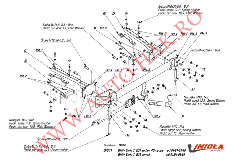 G Śruba M12x40-8.8 ; Bolt Podkł. okr. pow. 13 ; Plain Washer F Śruba M10x35-8.8 ; Bolt Podkł. spręż.10,2 ; Spring Washer Podkł. okr. pow. 10,5 ; Plain Washer D Pkt. 2 . K A Pkt. 1 Śruba M12x40-8.8 ; Bolt C Pkt. 1 -H E O T Pkt. 4 Pkt. 5 Pkt. 2 . W Pkt. 3 Nakrętka M10 ; Nut Podkł. spręż.10,2 ; Spring Washer Podkł. okr. pow. 10,5 ; Plain Washer W U A Pkt. 6 H W Nr katalogowy B/001 Pkt. 4 Pkt. 3 Pkt. 5 Pkt. 6 Śruba M 8x20-8.8 ; Bolt Pkt. 2 H Nakrętka M12 ; Nut Podkł. spręż.12,2 ; Spring Washer Podkł. okr. 13 ; Plain Washer Pkt. 7 Śruba M12x70-8.8 ; Bolt Śruba M10x110-8.8 ; Bolt Podkł. okr. pow. 10,5 ; Plain Washer A O R B Nakrętka M12 ; Nut Podkł. spręż.12,2 ; Spring Washer Podkł. okr. 13 ; Plain Washer Marka BMW Seria 3 E36 sedan, 4D coupe od 01/91-03/98 BMW Seria 3 E36 combi od 01/91-08/99 ZESTAW ŚRUBOWY: FASTENING MEANS: Gniazdo 7-biegunowe 12V z ruchomymi bolcami Symbol SWW 1135-812 Oznaczenie zacisku 31 L R 54 58L 58R + Zacisk do łączenia przewodów do masy pojazdu do świateł kierunku jazdy lewych do świateł kierunku jazdy prawych do świateł hamowania do świateł pozycyjnych lewych do świateł pozycyjnych prawych tylne światła przeciwmgłowe Moment skręcający dla śrub i nakrętek (8.8) Torgue settings for nuts and bolts (8.8) M8 25 Nm M12 M10 55 Nm M14 M16 195 Nm • • • • • • • • • • • • • • • • • BMW SERIA 3 E 36 sed., com. 01/91 - 08/99 NO CAT. B/001 Kolory Biały , white śółty , yellow zielony, green czerwony, red czarny, black brązowy, brown niebieski , blue • W W W 10szt 8szt O T • • • • • • • • • • O R 10szt 4szt − ∅ x36 8szt −∅22x85 8szt Unscrew the bumper and disassemble the shock absorbers with the bumper fitting handles (they will not be used any more). Disassemble the shields of the rear belt and floor in the boot. Find four marked places in the boot, on the left and right metal clamps. Drill the holes ø 11 (straight through the metal clamps) in these places. Insert the element G in the right and left metal clamps. Put the plate E and F on the protruding bolts of the bottom of the metal clamp and screw with the nuts M10 (point 2). Insert the elements C and D in the left and right metal clamps and screw to the metal clamps, through the holes, with bolts M10x35 8.8 (point 1). Drill the holes ø 12,5 through the rear belt of the car, through the holes in the element D from the right side (point 3). Put the main bar A to the rear belt and screw with bolts M12x40 8.8 (point 3 and 4), through the holes of the assembled elements CE i GD. Cut out the fragment in the lower part of the bumper to place handles of the ball. Screw the bumper on the fitting handles (point 5). The height of the bumper is regulated by the sleeves in the handles (point 6). Fix the ball and electric plate with bolts M12x70 8.8. Tighten all the bolts according to the torque settings- see the table. Connect the electric wires. -H 85 Nm 135 Nm . -M12 -M10 -M12 -M10 • U A 2szt 4szt 8szt 2szt 10szt 8szt . K A INSTRUKCJA MONTAśU: FITTING INSTRUCTION: Deșurubați bara de protecție și demontați amortizoarele cu bara de protecție montarea mânere. Demontați scuturile centura spate și podea în portbagaj. Găsiți patru locuri marcate în portbagaj, la elementele de prindere din metal stânga și dreapta. Găurile Ø 11 (direct prin clemele de metal) în aceste locuri. Introduceți elementul G în dreapta și stânga clemele de metal. Pune placa de E și F pe șuruburile proeminente in partea de jos a clemei de metal și șurub cu nuci M10 (punctul 2). Introduceți elementele C și D din clemele metalice stânga și din dreapta și înșurubați la clemele metalice, prin găurile, cu șuruburi M10x35 8.8 (punct 1). Perforați găurile Ø 12,5 prin centura din spate a masinii, prin găurile din elementul D din partea dreapta (punctul 3). Puneți principal bara de la A la centura spate și înșurubați cu șuruburi M12x40 8.8 (punctele 3 și 4), prin orificiile din elementele asamblate CE i HG nr. Tăiați fragmentul în partea inferioară a barei de protecție a plasa mânere din mingea. Înșurubați bara de protecție pe mânerele de montare (punctul 5). Înălțimea a barei de protecție este reglementată de mâneci în mânerele (punctul 6). Fixați mingea și placa electrica cu șuruburi M12x70 8.8. Strângeți toate șuruburile conform cuplul setările vezi in tabel. Conectați cablurile electrice. -M12x70 8.8 -M10x35 8.8 -M12x35 8.8 -M8x20 8.8 -M12 -M10 O R S.C. AUTO GEDAL IMPEX S.R.L. Zaczep posiada tabliczkę znamionową obowiązującą uŜytkownika w zakresie prawidłowego i bezpiecznego obciąŜenia. BMW SERIA 3 E 36 com. 95 – 08/99 BMW SERIA 3 E 36 sed. 01/91 – 03/98 BMW SERIA 3 E 36 4 d Coupe 01/91 - 03/98 R = 1800 kg ⇓ S = 80 kg 2. 3. 4. 5. U A Producent zobowiązuje się do wymiany wadliwego wyrobu w okresie 12 miesięcy od daty zakupu lub 24 miesięcy od daty produkcji, w terminie 14-dniowym. Wymianę wadliwego wyrobu dokonuje się w miejscu zakupu lub bezpośrednio u producenta. Nie podlega reklamacji gwarancyjnej zaczep kulowy, którego uszkodzenie nastąpiło: a) wskutek wypadku, b) wskutek nieprzestrzegania zasad prawidłowej obsługi, eksploatacji, konserwacji podanych w instrukcji. Karta gwarancyjna bez daty sprzedaŜy , pieczęci sklepu lub warsztatu montującego, nie moŜe słuŜyć jako podstawa do reklamacji. W skutek nie prawidłowego zamontowania zaczepu. . W W W D = 9,30 kN -H W czasie całej eksploatacji naleŜy poszczególne elementy zaczepu utrzymywać w naleŜytym stanie technicznym (właściwie dokręcone elementy złączone, całość konstrukcji zabezpieczona przed działaniem korozji). Przyczepa musi być połączona z zaczepem kulowym dodatkowym złączem o odpowiedniej wytrzymałości (łańcuch, linka z zapięciem). Carlig remorcare BMW Seria 3 E 36 COMBI tip semidemontabil Hakpol 1. . K A WARUNKI EKSPLOATACJI Tel: +40 745.805.990 / +40 737.122.471 Email: