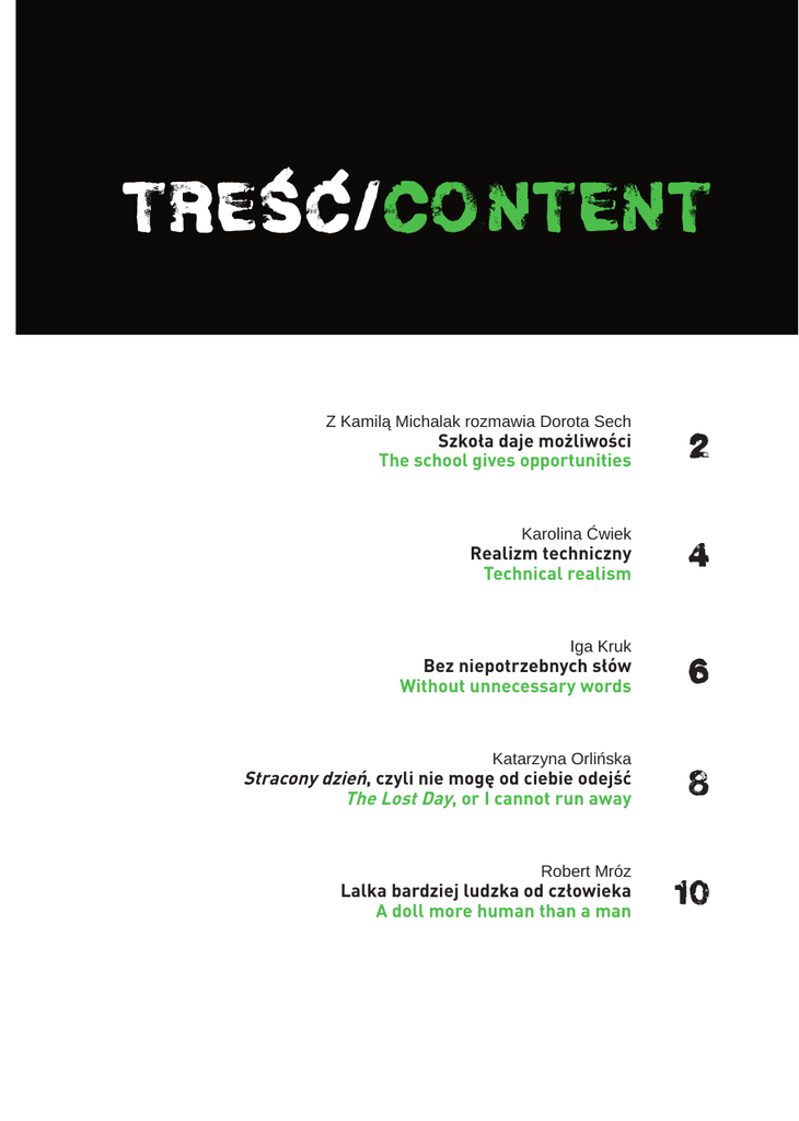 TRESC/CONTENT Z Kamilą Michalak rozmawia Dorota Sech Szkoła daje możliwości The school gives opportunities 2 Karolina Ćwiek 4 Realizm techniczny Technical realism Iga Kruk Bez niepotrzebnych słów Without unnecessary words Katarzyna Orlińska 6 Stracony dzień, czyli nie mogę od ciebie odejść The Lost Day, or I cannot run away 8 Robert Mróz 10 Lalka bardziej ludzka od człowieka A doll more human than a man Dorota Sech Szkoła daje możliwości Wywiad z Kamilą Michalak, studentką wydziału reżyserii Akademii Teatralnej, rozmawia Dorota Sech - Prezentowany podczas festiwalu spektakl Laboratorium podróży (off) opiera się przede wszystkim na ruchu, cielesności. Nie padają żadne słowa. Czy trudno jest pracować z aktorem, gdy nie można podeprzeć się tekstem? - Czy jest tekst, czy go nie ma, pozostaje zawsze jakaś idea, jakaś konstrukcja. Jest coś, o czym chcemy opowiadać i co do tego musimy być zgodni. Później trzeba dojść do sposobu, w jaki chcemy o tym opowiadać - słowem, gestem czy wszystkimi innymi narzędziami, które przynależą scenie. W zasadzie troszkę trudniej pracuje się bez tekstu, ale jest to bardzo dobre ćwiczenie. - Tego typu spektakle, gdzie sens zostaje podany przez ruch i gest, kojarzą się przede wszystkim z teatrem tańca, pantomimą. Czy uważasz, że Akademia Teatralna dobrze przygotowuje aktora do pracy z własnym ciałem? - To kwestia indywidualna. Jeżeli ktoś tego chce, rozwija się w tym kierunku. Jest coraz bardziej świadomy swego ciała, poznaje różne techniki tańca. Szkoła daje takie możliwości, ale trzeba je samodzielnie rozwijać, jak na przykład Kamil Dominiak (występuje w spektaklu Laboratorium podróży przyp. red.), który od początku chciał iść w tę stronę i widać tego efekty. Natomiast reszta aktorów również zachowuje świadomość swojego ciała, choć już na innej zasadzie. Przy spektaklu wyszliśmy z założenia, żeby nie udawać tancerzy, skoro nimi nie jesteśmy, ale wydobyć indywidualny sposób poruszania się i zrobić z tego walor. Mam nadzieję, że osiągnęliśmy zamierzony efekt. - A co z organizacją przestrzeni? Może ona bardzo dużo podpowiedzieć, pomóc aktorowi. Czy tworząc spektakl, korzystałaś z tego, co 2 już mieliście na scenie, czy wcześniej była ona dokładnie zaplanowana i historia została włożona w tę wykreowaną już rzeczywistość? - Zazwyczaj staramy się adaptować powierzchnię już zastaną. Wykorzystujemy jej zalety, jak i to, co wydaje się być jej wadami. Także w tym przypadku korzystaliśmy z tego, co nam daje przestrzeń – na przykład mała kameralna sala, dwa wejścia. Teraz, gdziekolwiek będziemy pokazywać ten spektakl, największym wyzwaniem dla mnie jest to, żeby w nową, nie oryginalną przestrzeń, wpleść tę historię. Wiem jednak, że takie odświeżenie spektaklu może wyjść tylko na dobre. - Laboratorium podróży będzie pokazywane w trakcie MFST ITSelF. Co dla Ciebie znaczy udział w Festiwalu? - To okazja, aby zagrać ten spektakl jeszcze raz, w nowych warunkach. Przede wszystkim jest to prestiż. Zazwyczaj egzaminy, które przygotowujemy na Akademii, są pokazywane tylko jeden raz, natomiast ten spektakl ma już ponad rok, a wciąż jest grany i żyje. Za każdym razem jest to inny spektakl. W innej przestrzeni robi się jakby coś nowego, dodają się piętra znaczeń. Sama nie wiem, jaki tym razem będzie wydźwięk, ale myślę, że będzie ciekawie. - Czy po zakończeniu studiów chciałabyś kontynuować przygodę z tego rodzaju teatrem? - Spektakl powstał pod opieką profesora Piotra Cieplaka. Bardzo dużo wyniosłam z tego egzaminu. W moich kolejnych pracach jest bardzo dużo z myślenia, jakiego nauczył mnie profesor. To procentuje. 30.06.2011 Dorota Sech, translated by Monika Riegel The School gives opportunities Interview with Kamila Michalak, student of the Directing Department at the Aleksander Zelwerowicz Theatre Academy - The spectacle Laboratory of Journey presented during the Festival (off fringe) is based primarily on the movement, corporeality. There are no words at all. Is it difficult to work with an actor when one cannot lean on the text? - No matter whether there is a text or not, what always remains is an idea, a construction. There is something we want to express and in what we have to be unanimous. Later on we should operate a method of telling it – with words, gestures, or all the other tools which belong to the stage. In fact it is slightly more difficult to work without the text, yet it is a very good exercise. - The spectacles of this kind in which the sense is given by the movement and gesture are associated generally with the dance theatre or a pantomime. Do you think the Theatre Academy can prepare an actor to work with his own body properly? - It is an individual matter. If somebody wants to, he can develop in this field. He is more and more conscious of his own body and becomes familiar with different techniques of dance. The school gives such opportunities, yet we have to develop it individually, like in case of Kamil Dominiak (who acts in the Laboratory of Journey – critic’s note), who chose this direction at the beginning and the effects are visible now. As for the other actors, they are aware of their body as well, though in a different way. While making the spectacle we assumed not to pretend the dancers if we are not, yet to find our individual means of movement and make it our virtue. I hope we have reached the goal. - How was the organization of the space? 1 2 3 4 5 6 7 It can tell many things, it can help an actor. While making the spectacle, did you use the things being already on the stage, or was it planned thoroughly before and the story was only put into this created reality? - Usually we try to adapt the existing area. We take advantage of it and use its drawbacks. Also in this point we made benefit of what was given by the space – for instance a small intimate