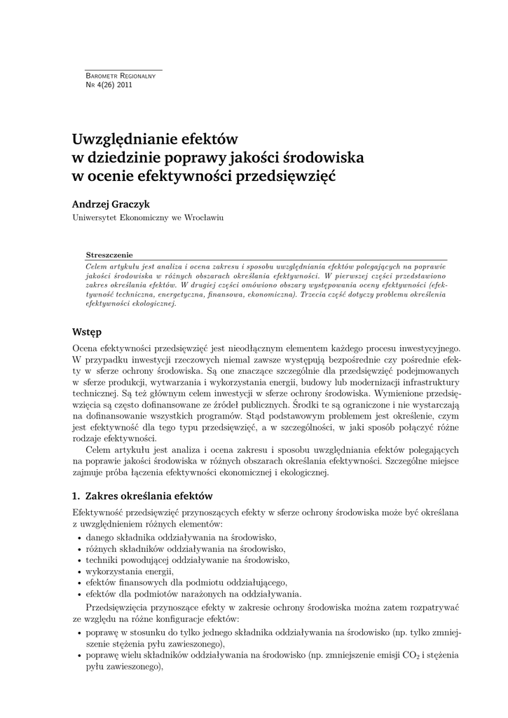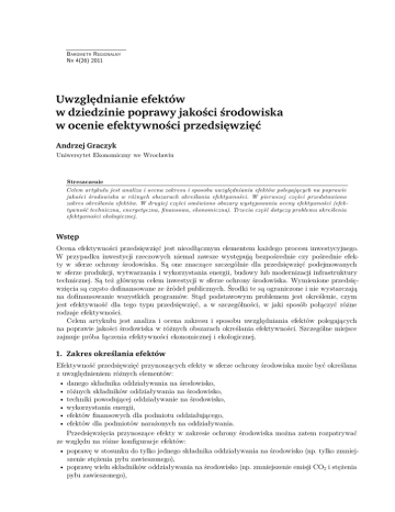 Barometr Regionalny Nr 4(26) 2011 Uwzględnianie efektów w dziedzinie poprawy jakości środowiska w ocenie efektywności przedsięwzięć Andrzej Graczyk Uniwersytet Ekonomiczny we Wrocławiu Streszczenie Celem artykułu jest analiza i ocena zakresu i sposobu uwzględniania efektów polegających na poprawie jakości środowiska w różnych obszarach określania efektywności. W pierwszej części przedstawiono zakres określania efektów. W drugiej części omówiono obszary występowania oceny efektywności (efektywność techniczna, energetyczna, finansowa, ekonomiczna). Trzecia część dotyczy problemu określenia efektywności ekologicznej. Wstęp Ocena efektywności przedsięwzięć jest nieodłącznym elementem każdego procesu inwestycyjnego. W przypadku inwestycji rzeczowych niemal zawsze występują bezpośrednie czy pośrednie efekty w sferze ochrony środowiska. Są one znaczące szczególnie dla przedsięwzięć podejmowanych w sferze produkcji, wytwarzania i wykorzystania energii, budowy lub modernizacji infrastruktury technicznej. Są też głównym celem inwestycji w sferze ochrony środowiska. Wymienione przedsięwzięcia są często dofinansowane ze źródeł publicznych. Środki te są ograniczone i nie wystarczają na dofinansowanie wszystkich programów. Stąd podstawowym problemem jest określenie, czym jest efektywność dla tego typu przedsięwzięć, a w szczególności, w jaki sposób połączyć różne rodzaje efektywności. Celem artykułu jest analiza i ocena zakresu i sposobu uwzględniania efektów polegających na poprawie jakości środowiska w różnych obszarach określania efektywności. Szczególne miejsce zajmuje próba łączenia efektywności ekonomicznej i ekologicznej. 1. Zakres określania efektów Efektywność przedsięwzięć przynoszących efekty w sferze ochrony środowiska może być określana z uwzględnieniem różnych elementów: • danego składnika oddziaływania na środowisko, • różnych składników oddziaływania na środowisko, • techniki powodującej oddziaływanie na środowisko, • wykorzystania energii, • efektów finansowych dla podmiotu oddziałującego, • efektów dla podmiotów narażonych na oddziaływania. Przedsięwzięcia przynoszące efekty w zakresie ochrony środowiska można zatem rozpatrywać ze względu na różne konfiguracje efektów: • poprawę w stosunku do tylko jednego składnika oddziaływania na środowisko (np. tylko zmniejszenie stężenia pyłu zawieszonego), • poprawę wielu składników oddziaływania na środowisko (np. zmniejszenie emisji CO2 i stężenia pyłu zawieszonego), 40 Andrzej Graczyk • poprawę jednego lub wielu składników oddziaływania na środowisko oraz poprawę w zakresie poziomu techniki (np. zmniejszenie emisji CO2 i stężenia pyłu zawieszonego oraz wzrost sprawności lub bezpieczeństwa użytkowania instalacji), przy stałości pozostałych elementów, • poprawę jednego lub wielu składników oddziaływania na środowisko, poprawę w zakresie poziomu techniki oraz w zakresie sprawności energetycznej (np. zmniejszenie emisji CO2 i stężenia pyłu zawieszonego, wzrost sprawności lub bezpieczeństwa użytkowania instalacji oraz energooszczędności), przy stałości pozostałych elementów, • poprawę jednego lub wielu składników oddziaływania na środowisko, poprawę w zakresie poziomu techniki, w zakresie sprawności energetycznej oraz w dziedzinie korzyści finansowych podmiotu oddziałującego na środowisko (np. zmniejszenie emisji CO2 i stężenia pyłu zawieszonego, wzrost sprawności lub bezpieczeństwa użytkowania instalacji, energooszczędności i wzrost zysku podmiotu oddziałującego na środowisko), przy stałości pozostałych elementów, • poprawę jednego lub wielu składników oddziaływania na środowisko, poprawę w zakresie poziomu techniki, w zakresie sprawności energetycznej, w dziedzinie korzyści finansowych podmiotu oddziałującego na środowisko oraz korzyści dla podmiotów narażonych na oddziaływania na środowisko (np. zmniejszenie emisji CO2 i stężenia pyłu zawieszonego, wzrost sprawności lub bezpieczeństwa użytkowania instalacji, energooszczędności, wzrost zysku podmiotu oddziałującego na środowisko oraz zmniejszenie uciążliwości środowiskowych podmiotów korzystających ze środowiska), przy stałości pozostałych elementów. Rozróżnienie tych efektów powinno być uwzględniane w przypadku różnych źródeł finansowania preferencyjnego z zastosowaniem środków publicznych. Można wówczas uwzględnić rozdzielenie tych efektów i odrębną ocenę efektywności dla poszczególnych obszarów. Efekty w sferze ochrony środowiska mogą być wówczas traktowane jako cel główny przedsięwzięcia lub jeden z wielu celów równorzędnych, ewentualnie jako cel uboczny. Jeśli efekty przedsięwzięć mają bezpośrednie i/lub pośrednie znaczenie dla poprawy jakości środowiska, zmniejszenia zużycia jego zasobów itp., to zwykle przewiduje się różne formy wsparcia publicznego. Władze publiczne i odpowiednie podmioty odpowiedzialne za udzielanie pomocy publicznej powinny przy rozpatrywaniu wniosków o dofinansowanie kierować się wskazaniami zawartymi w ustawie Prawo ochrony środowiska (POŚ) 1. Zapisy ustawy wskazują na to, co należy uwzględniać w kontekście efektów istotnych dla społeczeństwa. W odniesieniu do aspektu ekologicznego i technicznego w art. 3 p. 10 ustawie Prawo ochrony środowiska wykorzystać można pojęcie najlepszych dostępnych technik. Rozumie się przez to najbardziej efektywny oraz zaawansowany poziom rozwoju technologii i metod prowadzenia danej działalności, wykorzystywany jako podstawa ustalania granicznych wielkości emisyjnych, mających na celu eliminowanie emisji lub, jeżeli nie jest to praktycznie możliwe, ograniczanie emisji i wpływu na środowisko jako całość, z tym że pojęcie: •„technika” oznacza zarówno stosowaną technologię