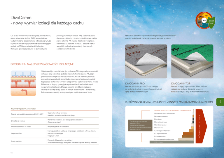 DivoDamm - nowy wymiar izolacji dla każdego dachu Od lat 60. w budownictwie stosuje się poliuretanową piankę sztywną (w skrócie PUR) jako wyjątkowo wydajny materiał izolacyjny, który odznacza się tym, że w porównaniu z tradycyjnymi materiałami izolacyjnymi posiada o 67% lepsze właściwości izolacyjne. Rozwijane generacje produktu to pianka sztywna poliizocyjanurowa (w skrócie PIR). Złożona budowa chemiczna - łańcuchy i struktury pierścieniowe, nadają piance sztywnej PIR wysoką stabilność i wyjątkową odporność. Są odporne na nacisk i działanie niemal wszystkich budowlanych substancji chemicznych a także niezwykle trwałe. Płyty DivoDamm Pro i Top montowane są na całej powierzchni dachu powyżej krokwi, dzięki czemu eliminowane są mostki termiczne. DivoDamm - najlepsze właściwości izolacyjne Wysokowydajny materiał izolacyjny poliuretan PIR osiąga najlepsze wartości izolacyjne przy niewielkiej grubości materiału. Pianka sztywna PIR, dzięki przewodnictwu ciepła do wartości WLS 024, ma tak niewielką zdolność przewodnictwa ciepła, jak niemal żaden inny materiał izolacyjny i wartość ta pozostaje zachowana w trakcie całego okresu użytkowania. Pianka twarda PIR odznacza się przy tym wyjątkowymi właściwościami technicznymi i wspaniałym ekobilansem. Dlatego produkty DivoDamm nadają się idealnie do trwałej izolacji dachu w nowym budownictwie i do renowacji. Poliuretanowe materiały izolacyjne osiągają zwykle żywotność 50 lat. DIVODAMM PRO DIVODAMM TOP Element izolujący o grubości 50 mm nadający się zarówno do użycia w nowym budownictwie jak i przy dachach remontowanych. Element izolujący o grubości od 80 do 160 mm nadający się zarówno do użycia w nowym budownictwie jak i przy dachach remontowanych. porównanie Braas DivoDamm z innymi materiałami izolacyjnymi NAJWAŻNIEJSZE WŁAŚCIWOŚCI Optymalna izolacja termiczna Niewielka grubość materiału izolacyjnego Dodatkowe warstwy Membrana wierzchnia jako izolacja przeciwdeszczowa Odporna na wilgoć Wysoka odporność na nacisk Płyty nadające się do chodzenia Odporność PIR Na rozpuszczalniki, substancje zmiękczające oraz środki ochrony drewna Na masy uszczelniające Na grzyby i pleśń Prosta obróbka 66 Prosta obróbka zwykłymi narzędziami Wielkoformatowe płyty izolacyjne o niewielkim ciężarze ułatwiają transport 2,6 cm twarda pianka polistyrenowa 3,4 cm wełny mineralne 3,4 cm korek Twarda pianka poliuretanowa o grubości 1,9 cm ma takie same właściwości termoizolacyjne, jak ściana betonowa o grubości 153 cm 3,8 cm szkło piankowe 9,0 cm beton porowy 9,8 cm drewno 15,8 cm cegła wielkoporowa 37,1 cegła kratkowana 39,8 cm słomo-glina RÓWNE STRATY CIEPŁA Stopnie przewodnictwa cieplnego l 0,024-0,029 TWARDA PIANKA POLIURETANOWA O GRUBOŚCI 1,9 CM 32,5 cm cegła wapienno-krzemowa 153,0 cm beton 67 5