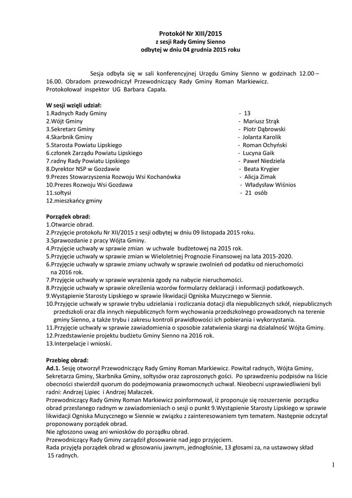 Protokół Nr XIII/2015 z sesji Rady Gminy Sienno odbytej w dniu 04 grudnia 2015 roku Sesja odbyła się w sali konferencyjnej Urzędu Gminy Sienno w godzinach 12.00 – 16.00. Obradom przewodniczył Przewodniczący Rady Gminy Roman Markiewicz. Protokołował inspektor UG Barbara Capała. W sesji wzięli udział: 1.Radnych Rady Gminy 2.Wójt Gminy 3.Sekretarz Gminy 4.Skarbnik Gminy 5.Starosta Powiatu Lipskiego 6.członek Zarządu Powiatu Lipskiego 7.radny Rady Powiatu Lipskiego 8.Dyrektor NSP w Gozdawie 9.Prezes Stowarzyszenia Rozwoju Wsi Kochanówka 10.Prezes Rozwoju Wsi Gozdawa 11.sołtysi 12.mieszkańcy gminy - 13 - Mariusz Strąk - Piotr Dąbrowski - Jolanta Karolik - Roman Ochyński - Lucyna Gaik - Paweł Niedziela - Beata Krygier - Alicja Zimak - Władysław Wiśnios - 21 osób Porządek obrad: 1.Otwarcie obrad. 2.Przyjęcie protokołu Nr XII/2015 z sesji odbytej w dniu 09 listopada 2015 roku. 3.Sprawozdanie z pracy Wójta Gminy. 4.Przyjęcie uchwały w sprawie zmian w uchwale budżetowej na 2015 rok. 5.Przyjęcie uchwały w sprawie zmian w Wieloletniej Prognozie Finansowej na lata 2015-2020. 6.Przyjęcie uchwały w sprawie zmiany uchwały w sprawie zwolnień od podatku od nieruchomości na 2016 rok. 7.Przyjęcie uchwały w sprawie wyrażenia zgody na nabycie nieruchomości. 8.Przyjęcie uchwały w sprawie określenia wzorów formularzy deklaracji i informacji podatkowych. 9.Wystąpienie Starosty Lipskiego w sprawie likwidacji Ogniska Muzycznego w Siennie. 10.Przyjęcie uchwały w sprawie trybu udzielania i rozliczania dotacji dla niepublicznych szkół, niepublicznych przedszkoli oraz dla innych niepublicznych form wychowania przedszkolnego prowadzonych na terenie gminy Sienno, a także trybu i zakresu kontroli prawidłowości ich pobierania i wykorzystania. 11.Przyjęcie uchwały w sprawie zawiadomienia o sposobie załatwienia skargi na działalność Wójta Gminy. 12.Przedstawienie projektu budżetu Gminy Sienno na 2016 rok. 13.Interpelacje i wnioski. Przebieg obrad: Ad.1. Sesję otworzył Przewodniczący Rady Gminy Roman Markiewicz. Powitał radnych, Wójta Gminy, Sekretarza Gminy, Skarbnika Gminy, sołtysów oraz zaproszonych gości. Po sprawdzeniu podpisów na liście obecności stwierdził quorum do podejmowania prawomocnych uchwał. Nieobecni usprawiedliwieni byli radni: Andrzej Lipiec i Andrzej Małaczek. Przewodniczący Rady Gminy Roman Markiewicz poinformował, iż proponuje się rozszerzenie porządku obrad przesłanego radnym w zawiadomieniach o sesji o punkt 9.Wystąpienie Starosty Lipskiego w sprawie likwidacji Ogniska Muzycznego w Siennie w związku z zainteresowaniem tym tematem. Następnie odczytał proponowany porządek obrad. Nie zgłoszono uwag ani wniosków do porządku obrad. Przewodniczący Rady Gminy zarządził głosowanie nad jego przyjęciem. Rada przyjęła porządek obrad w głosowaniu jawnym, jednogłośnie, 13 głosami za, na ustawowy skład 15 radnych. 1 Ad.2.Nie zgłoszono uwag do protokołu Nr XII/2015 z sesji odbytej w dniu 09 listopada 2015 roku. Przewodniczący Rady Gminy Roman Markiewicz zarządził głosowanie nad przyjęciem protokołu. Rada przyjęła protokół Nr XII/2015 w głosowaniu jawnym, jednogłośnie, 13 głosami za, na ustawowy skład 15 radnych. Ad.3.Wójt Gminy Mariusz Strąk przedstawił sprawozdanie z pracy w okresie pomiędzy sesjami informując o następujących sprawach: -wydano pięć zarządzeń; -skierowano do Rady Gminy sześć projektów uchwał; -zamontowano piec grzewczy w świetlicy w Wierzchowiskach Pierwszych, obecnie trwają prace przy budowie instalacji odprowadzającej ścieki, z szambem; -prowadzone są prace rozbiórkowe starego budynku po szkole w Wierzchowiskach Pierwszych. Nie zgłoszono pytań ani uwag do sprawozdania Wójta. Ad.4.Skarbnik Gminy Jolanta Karolik przedstawiła projekt uchwały w sprawie zmian w Uchwale budżetowej na 2015 rok. Omówiła kolejno zamiany po stronie dochodów i wydatków. Uwag ani pytań nie zgłoszono. Przewodnicząca Komisji Budżetowej Cecylia Małaczek poinformowała, iż Komisja zaopiniowała pozytywnie projekt uchwały. Przewodniczący Rady Gminy Roman Markiewicz zarządził głosowanie nad przyjęciem uchwały. Rada przyjęła uchwałę Nr XIII/71/2015 w głosowaniu jawnym, jednogłośnie, 13 głosami za, na ustawowy skład 15 radnych. Ad.5. Skarbnik Gminy Jolanta Karolik omówiła zmiany w Wieloletniej Prognozie Finansowej Gminy Sienno na lata 2015-2020. Wskazała, iż zmiany wynikają ze zmian wprowadzonych w uchwale budżetowej. Nie zgłoszono uwag ani pytań. Przewodnicząca Komisji Budżetowej Cecylia Małaczek poinformowała, iż Komisja zaopiniowała pozytywnie projekt uchwały. Przewodniczący Rady Gminy Roman Markiewicz zarządził głosowanie nad przyjęciem uchwały. Rada przyjęła uchwałę Nr XIII//72/2015 w głosowaniu jawnym, jednogłośnie, 13 głosami za, na ustawowy skład 15 radnych. Ad.6.Sekretarz Gminy Piotr Dąbrowski omówił projekt uchwały w sprawie zmiany uchwały w sprawie zwolnień od podatku od nieruchomości na 2016 rok. Poinformował, iż projekt uchwały dotyczy wprowadzenia zmian do uchwały przyjętej przez Radę Gminy w dniu 9 listopada br. Po przesłaniu uchwały, R.I.O zwróciło uwagę, że zmieniła się interpretacja obowiązujących przepisów i konieczne jest uściślenie zapisów w uchwale. Po uściśleniu zapis w § 1 ustęp 2 przyjmie brzmienie „ Zwolnienia, o których mowa w ust. 1 pkt. 1, 2 i 3 nie obejmują budynków i gruntów zajętych na prowadzenie działalności gospodarczej.”. Ten zapis spowoduje zwolnienie z podatku od nieruchomości budowli i budynków wykorzystywanych przez ZUK na działalność w zakresie wodociągu, kanalizacji, dostarczania ciepła. Uchwała nie zmienia nic w dochodach gminy, uściśla jedynie zwolnienia. Nie zgłoszono pytań ani uwag do projektu uchwały. Przewodnicząca Komisji Budżetowej Cecylia Małaczek poinformowała, iż komisja zaopiniowała pozytywnie projekt uchwały. Przewod