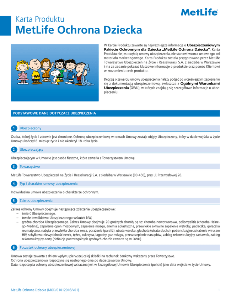 Karta Produktu MetLife Ochrona Dziecka W Karcie Produktu zawarte są najważniejsze informacje o Ubezpieczeniowym Pakiecie Ochronnym dla Dziecka „MetLife Ochrona Dziecka”. Karta Produktu nie jest częścią umowy ubezpieczenia, nie stanowi wzorca umownego ani materiału marketingowego. Karta Produktu została przygotowana przez MetLife Towarzystwo Ubezpieczeń na Życie i Reasekuracji S.A. z siedzibą w Warszawie i ma za zadanie pokazać kluczowe informacje o produkcie oraz pomóc Klientowi w zrozumieniu cech produktu. Decyzję o zawarciu umowy ubezpieczenia należy podjąć po wcześniejszym zapoznaniu się z dokumentacją ubezpieczeniową, zwłaszcza z Ogólnymi Warunkami Ubezpieczenia (OWU), w których znajdują się szczegółowe informacje o ubezpieczeniu. PODSTAWOWE DANE DOTYCZĄCE UBEZPIECZENIA 1. Ubezpieczony Osoba, której życie i zdrowie jest chronione. Ochroną ubezpieczeniową w ramach Umowy zostaje objęty Ubezpieczony, który w dacie wejścia w życie Umowy ukończył 6. miesiąc życia i nie ukończył 18. roku życia. 2. Ubezpieczający Ubezpieczającym w Umowie jest osoba fizyczna, która zawarła z Towarzystwem Umowę. 3. Towarzystwo MetLife Towarzystwo Ubezpieczeń na Życie i Reasekuracji S.A. z siedzibą w Warszawie (00-450), przy ul. Przemysłowej 26. 4. Typ i charakter umowy ubezpieczenia Indywidualna umowa ubezpieczenia o charakterze ochronnym. 5. Zakres ubezpieczenia Zakres ochrony Umowy obejmuje następujące zdarzenia ubezpieczeniowe: –– śmierć Ubezpieczonego, –– trwałe inwalidztwo Ubezpieczonego wskutek NW, –– groźna choroba Ubezpieczonego. Zakres Umowy obejmuje 20 groźnych chorób, są to: choroba nowotworowa, poliomyelitis (choroba Heinego-Medina), zapalenie opon mózgowych, zapalenie mózgu, anemia aplastyczna, przewlekłe aktywne zapalenie wątroby, padaczka, gorączka reumatyczna, nabyta przewlekła choroba serca, porażenie (paraliż), utrata wzroku, głuchota (utrata słuchu), potransfuzyjne zakażenie wirusem HIV, schyłkowa niewydolność nerek, tężec, cukrzyca, łagodny guz mózgu, przeszczepienie narządów, zabieg rekonstrukcyjny zastawek, zabieg rekonstrukcyjny aorty (definicje poszczególnych groźnych chorób zawarte są w OWU). 6. Początek ochrony ubezpieczeniowej Umowa zostaje zawarta z dniem wpływu pierwszej całej składki na rachunek bankowy wskazany przez Towarzystwo. Ochrona ubezpieczeniowa rozpoczyna się następnego dnia po dacie zawarcia Umowy. Data rozpoczęcia ochrony ubezpieczeniowej wskazana jest w Szczegółowej Umowie Ubezpieczenia (polisie) jako data wejścia w życie Umowy. MetLife Ochrona Dziecka (MOD/01012016/V01) 1 7. Koniec ochrony ubezpieczeniowej Umowa wygasa w każdym z następujących przypadków: a) w dniu śmierci Ubezpieczonego lub b) z dniem rozwiązania Umowy w związku z wypowiedzeniem Umowy przez Ubezpieczającego, lub c) z chwilą wypłaty 100% sumy ubezpieczenia z tytułu groźnej choroby lub trwałego inwalidztwa wskutek NW, lub d) z powodu nieopłacenia składki, z upływem okresu karencji, nie wcześniej jednak niż dnia następnego po upływie 7 dni od daty otrzymania wezwania do zapłaty składki, lub e) odstąpienia od Umowy z dniem otrzymania przez Towarzystwo wniosku o odstąpienie od Umowy, lub f) w rocznicę Umowy następującą bezpośrednio po 21. urodzinach Ubezpieczonego. 8. Kontynuacja ubezpieczenia Umowa zawierana jest na okres, za który Ubezpieczający opłacił składkę oraz następujący po nim okres karencji (30 dni). W przypadku zmiany warunków, na jakich Umowa może być przedłużana, Towarzystwo powiadomi o tym Ubezpieczającego w terminie nie później niż 30 dni przed datą, do której Ubezpieczający jest zobowiązany opłacić kolejną składkę. Opłacenie przez Ubezpieczającego składki w wysokości zaoferowanej przez Towarzystwo jest równoznaczne z zaakceptowaniem warunków, na jakich Umowa jest przedłużana. W przypadku niezaakceptowania przez Ubezpieczającego zmienionych warunków Umowy nie będzie ona przedłużana i wygaśnie z końcem okresu karencji. Towarzystwo może nie wyrazić zgody na przedłużenie Umowy na kolejne okresy. W takim przypadku Towarzystwo powiadomi o tym Ubezpieczającego w terminie nie później niż 30 dni przed datą, do której Ubezpieczający jest zobowiązany opłacić kolejną składkę. 9. Wznowienie ochrony ubezpieczeniowej Brak możliwości wznowienia Umowy oraz ochrony ubezpieczeniowej. 10. Świadczenia z tytułu ubezpieczenia i podmioty uprawnione do ich otrzymania Świadczenie na wypadek śmierci Ubezpieczonego: Towarzystwo wypłaci Uposażonemu, w przypadku śmierci Ubezpieczonego, świadczenie w wysokości sumy ubezpieczenia z tego tytułu. Świadczenie na wypadek trwałego inwalidztwa wskutek NW: –– W przypadku całkowitego i trwałego inwalidztwa – Towarzystwo wypłaci Ubezpieczonemu świadczenie w wysokości sumy ubezpieczenia z tego tytułu. –– W przypadku częściowego i trwałego inwalidztwa – Towarzystwo wypłaci Ubezpieczonemu świadczenie określone w Tabeli norm oceny procentowej trwałego inwalidztwa wskutek nieszczęśliwego wypadku jako procentowa wartość sumy ubezpieczenia z tego tytułu. Świadczenie na wypadek groźnej choroby Ubezpieczonego: Towarzystwo wypłaci Ubezpieczonemu świadczenie określone w Tabeli groźnych chorób w wysokości sumy ubezpieczenia lub części sumy ubezpieczenia na wypadek groźnej choroby Ubezpieczonego, pod warunkiem że: –– groźna choroba została rozpoznana, procedury diagnostyczne mające na celu jej rozpoznanie zostały rozpoczęte lub której leczenie rozpoczęło się w okresie obowiązywania Umowy, nie wcześniej niż po upływie 90 dni od daty wejścia w życie Umowy i –– Ubezpieczony pozostanie przy życiu w ciągu 30 dni od daty zdiagnozowania groźnej choroby. 11. Suma ubezpieczenia oraz wysokość składki 1. Wysokość składki dla poszczególnych wariantów ochrony jest określona w poniższej tabeli. 2. Składka może być 