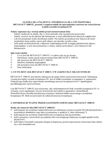 ULOTKA DLA PACJENTA: INFORMACJA DLA UŻYTKOWNIKA BETAFACT 1000 IU, proszek i rozpuszczalnik do sporządzania roztworu do wstrzykiwań Ludzki czynnik krzepnięcia IX Należy zapoznać się z treścią ulotki przed zastosowaniem leku - Należy zachować tę ulotkę, aby w razie potrzeby móc ją ponownie przeczytać. - Należy zwrócić się do lekarza lub farmaceuty w razie jakichkolwiek dalszych wątpliwości. - Lek ten przepisano ściśle określonej osobie. Nie należy go przekazywać innym.Lek może zaszkodzić innej osobie, nawet jeśli objawy jej choroby są takie same. - Jeśli nasili się którykolwiek z objawów niepożądanych lub wystąpią jakiekolwiek objawy niepożądane, w tym niewymienione w ulotce, należy powiedzieć o tym lekarzowi lub farmaceucie. Spis treści ulotki: 1. Co to jest lek BETAFACT 1000 IU i w jakim celu się go stosuje 2. Informacje ważne przed zastosowaniem leku BETAFACT 1000 IU 3. Jak stosować lek BETAFACT 1000 IU 4. Możliwe działania niepożądane 5. Jak przechowywać lek BETAFACT 1000 IU 6. Inne informacje 1. CO TO JEST LEK BETAFACT 1000 IU I W JAKIM CELU SIĘ GO STOSUJE BETAFACT 1000 IU jest lekiem należącym do grupy leków przeciwkrwotocznych. Substancją czynną jest ludzki czynnik krzepnięcia IX. Jest to białko normalnie występujące w organizmie. Funkcją tego białka jest zapewnianie normalnego procesu krzepnięcia krwi i zapobieganie przedłużającemu się krwawieniu. Lek BETAFACT 1000 IU jest stosowany, aby zrekompensować brak czynnika krzepnięcia IX i w związku z tym zapobiegać i leczyć krwawienia (krwotoki) u pacjentów z hemofilią B. Hemofilia B jest chorobą dziedziczną związaną z brakiem białka nazywanego czynnikiem krzepnięcia IX. Brak ten prowadzi do zaburzeń procesu krzepnięcia. 2. INFORMACJE WAŻNE PRZED ZASTOSOWANIEM LEKU BETAFACT 1000 IU Kiedy nie stosować leku BETAFACT 1000 IU: jeśli pacjent ma uczulenie (nadwrażliwość) na substancję czynną (czynnik IX) lub którykolwiek z pozostałych składników tego leku (wymienione w punkcie 6 „Inne informacje”); jeśli pacjent ma uczulenie (nadwrażliwość) na heparynę lub jej pochodne; jeśli u pacjenta w przeszłości po podaniu leku zawierającego heparynę wystąpił spadek liczby płytek krwi; jeśli lekarz stwierdził u pacjenta alergię na heparynę, przed rozpoczęciem stosowania leku należy się z nim skontaktować. Kiedy zachować szczególną ostrożność stosując lek BETAFACT 1000 IU W następujących sytuacjach lekarz powinien ocenić potencjalne korzyści wynikające z leczenia lekiem BETAFACT 1000 IU w odniesieniu do ryzyka wystąpienia powikłań: 1- przypadku uwagi na brak doświadczenia klinicznego u dzieci poniżej 6 roku życia, u pacjentów uprzednio nieleczonych. 2- przypadku uwagi na istniejące ryzyko nieprawidłowego tworzenia się skrzepów we krwi (powikłania związane z chorobą zakrzepowo-zatorową) u pacjentów z oznakami degradacji skrzepów krwi (fibrynoliza); u pacjentów, u których we krwi obwodowej tworzą się liczne skrzepy (zespół rozsianego wykrzepiania wewnątrznaczyniowego); u noworodków; u pacjentów krótko po zabiegu chirurgicznym; u pacjentów, u których krzepnięcie krwi jest nieprawidłowo wysokie; u pacjentów z chorobą wątroby. Lekarz może skierować pacjenta na badania krwi w celu wykrycia oznak tych powikłań najszybciej jak jest to możliwe. Ryzyko wystąpienia reakcji alergicznej Z uwagi na ryzyko wystąpienia reakcji alergicznych (patrz punkt 4. „Możliwe działania niepożądane”) wywołanych podaniem czynnika IX, pierwsze podanie leku BETAFACT 1000 IU musi odbyć się pod nadzorem medycznym, umożliwiającym w razie konieczności odpowiednie leczenie reakcji alergicznych. Lekarz poinformuje pacjenta o możliwych objawach reakcji alergicznej (patrz punkt 4. „Możliwe działania niepożądane”). Jeżeli jeden z tych objawów wystąpi, należy natychmiast przerwać leczenie i skontaktować się z lekarzem w celu rozpoczęcia odpowiedniego leczenia, zależnego od typu i nasilenia reakcji. Po wielokrotnym leczeniu lekiem BETAFACT 1000 IU, układ immunologiczny może reagować na czynnik IX wytworzeniem inhibitorów (przeciwciała specyficzne względem czynnika IX). Pojawienie się takich inhibitorów może obniżyć skuteczność leczenia. Lekarz musi regularnie przeprowadzać badania krwi w celu sprawdzenia czy pojawiają się inhibitory i w celu określenia ich ilości. Wykazano istnienie związku pomiędzy obecnością inhibitora czynnika IX i reakcjami alergicznymi. Z tego względu: jeśli u pacjenta występuje reakcja alergiczna po zastosowaniu czynnika IX, konieczne jest przeprowadzenie badań na obecność inhibitorów; jeśli stwierdzona zostanie obecność inhibitorów czynnika IX, istnieje większe ryzyko wystąpienia ciężkich reakcji alergicznych podczas wstrzykiwania czynnika IX. Przyjmowanie innych leków Należy powiedzieć lekarzowi lub farmaceucie o wszystkich przyjmowanych aktualnie lub ostatnio lekach, również tych, które pacjent planuje przyjmować. Dotyczy to również leków wydawanych bez recepty. Do chwili obecnej nie stwierdzono interakcji pomiędzy lekiem BETAFACT 1000 IU a innymi produktami leczniczymi. Ciąża i karmienie piersią Nie poddano ocenie bezpieczeństwa stosowania leku BETAFACT 1000 IU u kobiet w ciąży lub karmiących piersią. Jeżeli pacjentka jest w ciąży lub karmi piersią, lekarz powinien dokonać oceny korzyści wynikających z leczenia lekiem BETAFACT 1000 IU. Potencjalne korzyści ze stosowania leku powinny przewyższać istniejące ryzyko. Przed zastosowaniem tego leku należy poradzić się lekarza lub farmaceuty. Prowadzenie pojazdów i obsługiwanie maszyn: Nie przeprowadzono badań dotyczących wpływu leku na zdolność prowadzenia pojazdów i obsługiwania maszyn. Ważne informacje o niektórych składnikach leku BETAFACT 1000 IU Lek BETAFACT 1000 IU zawiera sód. Lek ten zawiera około 2,6 mg sodu na mililitr substancji (52