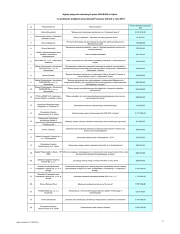 Wykaz pożyczek udzielonych przez WFOŚiGW w Opolu - na podstawie podjętych przez Zarząd Funduszu Uchwał w roku 2014 Lp. Pożyczkobiorca Nazwa zadania Kwota udzielonej pożyczki [zł] 1. Gmina Strzeleczki "Budowa sieci kanalizacji sanitarnej w m. Strzeleczki etap II" 3 531 919,00 2. Janex Serwis Mariusz Złotowski z siedzibą w Opolu "Zakup urządzenia - zakuwarki do węży hydraulicznych" 25 400,00 3. Gmina Głogówek "Termomodernizacja sali gimnastycznej i łącznika szkoły podstawowej w Biedrzychowicach" 149 300,00 4. Gmina Niemodlin "Kanalizacja obszarów wiejskich - etap II - Budowa kanalizacji sanitarnej w Wydrychowicach" 795 288,83 5. Zakład Ogólnobudowlany Artur Kiowski z siedzibą w Niezdrowicach "Zakup koparko-ładowarki" 200 000,00 6. MS-TANK Sp. z o.o. z siedzibą w Zawadzie "Zakup urządzenia do myjni samochodowej ręcznej wraz z konstrukcją pod myjnię" 252 000,00 7. Zakład Wodociągów i Kanalizacji "Rozwiązanie problemów gospodarki ściekowej w powiecie namysłowskim EKOWOD Sp. z o.o. w budowa kanalizacji tranzytowej (tłocznej) na trasach Smogorzów - Kowalowice i Namysłowie Jakubowice - Wilków" 166 800,00 8. Gmina Praszka "Budowa kanalizacji sanitarnej w miejscowości Gana, Rozterk i Praszka ul. Szosa Gańska. Etap II - miejscowość Gana" 325 000,00 9. Zakład Wodociągów i Kanalizacji EKOWOD Sp. z o.o. w Namysłowie "Budowa tranzytowej sieci wodociągowej z miejscowości Bąkowice do miejscowości Bielice oraz rozdzielczej sieci wodociągowej w miejscowościach Ziemiełowice i Łączany" 260 300,00 10. Zakład Wodociągów i Kanalizacji EKOWOD Sp. z o.o. w Namysłowie "Zakup sprzętu specjalistycznego do załadunku i transportu odpadów komunalnych” 334 400,00 12. PPHU „ARIES” S.C. Kazimierz i Janina Gełgut z siedzibą w Nysie "Zakup urządzeń do myjni samochodowej samoobsługowej ręcznej wraz z konstrukcją pod myjnię” 226 900,00 13. Wspólnoty Mieszkaniowej z Głogówka, ul. Chopina 5-7 „Docieplenie budynku mieszkalnego wielorodzinnego” 110 000,00 14. Energetyka Cieplna Opolszczyzny S.A. Opole „Modernizacja części ciśnieniowej kotła WR-25/3 w Opola” 3 177 300,00 15. Głubczyckie Wodociągi i Kanalizacja Spółka z ograniczoną odpowiedzialnością w Głubczycach „Radiowy system odczytu wskazań wodomierzy oraz monitoringu ujęć wody” 431 600,00 16. Gmina Tułowice „Budowa sieci kanalizacji sanitarnej, budowa przepompowni ścieków oraz budowa sieci wodociągowej” 490 000,00 17. Zakład Energetyki Cieplnej Sp. z o.o. w Namysłowie „Eliminacja niskiej emisji w Namysłowie - 2014” 163 000,00 18. Energetyka Cieplna Opolszczyzny S.A. Opole „Zabudowa nowego układu odpylania kotła WR-10 w Krapkowicach” 296 900,00 19. Szpital Wojewódzki w Opolu - SP „Remont przyłączy wodociągowych z wykonaniem rezerwowych zbiorników wody ZOZ dla budynków Szpitala Wojewódzkiego w Opolu” 525 100,00 20. Zakład Energetyki Cieplnej Prudnik Sp. z o.o. „Likwidacja niskiej emisji w mieście Prudnik w roku 2014” 359 600,00 21. Brzeskie Przedsiębiorstwo Energetyki Cieplnej Sp. z o.o. w Brzegu „Przebudowa tradycyjnej sieci cieplnej wysokich parametrów na sieć cieplną preizolowaną w rejonie ulic Boh. Westerplatte, Chocimskiej i A. Krajowej w Brzegu ” 1 250 000,00 22. Brzeskie Przedsiębiorstwo Energetyki Cieplnej Sp. z o.o. w Brzegu „Wymiana instalacji odpylającej kotłów WR-10 nr 1 i 2 ” 1 176 000,00 23. Gmina Reńska Wieś „Budowa kanalizacji sanitarnej w Komornie” 1 787 446,00 24. WODOCIĄGI Sp. z o.o. z Głuchołaz „Przebudowa i termomodernizacja budynków Spółki "Wodociągi" w Głuchołazach” 522 700,00 25. Gmina Strzeleczki „Budowa sieci kanalizacji sanitarnej w miejscowości Łowkowice i Komorniki” 3 166 506,00 26. Energetyka Cieplna Opolszczyzny S.A. Opole „Przebudowa źródła ciepła w Oleśnie” 1 600 700,00 stan na dzień: 31.12.2014 r. 1/5 27. Nyska Energetyka Cieplna Nysa Sp. z o.o. „Emisja niskiej emisji poprzez rozbudowę i przebudowę systemu cieplnego na terenie miasta Nysa w roku 2014” 268 800,00 28. Kanalizacja Gminy Kolonowskie „Przebudowa i wymiana sieci wodociągowej w części miasta Kolonowskie” 1 094 900,00 29. Gmina Jemielnica „Budowa kanalizacji sanitarnej wraz z przyłączami i pompowniami ścieków w Jemielnicy etap VB: ulice Korfantego, Dzierżonia, Stawowa, Smołki, Koziołka” 457 139,62 30. Przedsiębiorstwo Gospodarki Komunalnej i Mieszkaniowej Sp. z o.o. w Antoniowie „Budowa Punktu Selektywnej Zbiórki Odpadów Komunalnych na terenie Przedsiębiorstwa Gospodarki Komunalnej i Mieszkaniowej Sp. z o.o. w Antoniowie” 500 000,00 31. Energetyka Cieplna Opolszczyzny S.A. Opole „Przebudowa sieci cieplnych związanych z likwidacją węzła grupowego W-96D przy ul. Szarych Szeregów w Opolu w 2014 r.” 715 500,00 32. Gmina Wołczyn „Termomodernizacja obiektów szkół podstawowych w Wołczynie i Wierzbicy Górnej” 1 321 500,00 33. Powiat Kędzierzyńsko-Kozielski „Termomodernizacja dużej sali gimnastycznej i łącznika w Zespole Szkół nr 1 w Kędzierzynie-Koźlu” 397 700,00 34. Energetyka Cieplna Opolszczyzny S.A. Opole "Rewitalizacja systemu cieplnego na osiedlu mieszkaniowym w Grodkowie” 437 400,00 35. Zakład Energetyki Cieplnej Prudnik Sp. z o.o. „Modernizacja układu odpylania kotłów WR na ciepłowni rejonowej w Lubrzy – I etap (rok 2014)” 261 000,00 36. Zakład Usługowo-Produkcyjny "Komunalnik" Sp. z o.o. w Głuchołazach „Zakup używanej śmieciarki" 154 200,00 37. Jerzy Kieroński prowadzący działalność gospodarczą Jerzy Kieroński Biuro UsługowoHandlowe KJ z siedzibą w Kędzierzynie-Koźlu „Zakup urządzeń do wykonywania prac remontowych powłok betonowych wraz z zakupem samochodu” 200 000,00 38. Daniel Maćko prowadzący działalność gospodarczą pod nazwą BETBRUK Daniel Maćko z siedzibą w Głubczycach „Termomodernizacja poddasza budynku DPS Spokojna Przystań w Chomiąży” 498 000,00 39. Ewa Madera pro