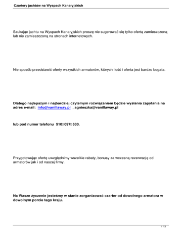 Czartery jachtów na Wyspach Kanaryjskich Szukając jachtu na Wyspach Kanaryjskich proszę nie sugerować się tylko ofertą zamieszczoną lub nie zamieszczoną na stronach internetowych. Nie sposób przedstawić oferty wszystkich armatorów, których ilość i oferta jest bardzo bogata. Dlatego najlepszym i najbardziej czytelnym rozwiązaniem będzie wysłania zapytania na adres e-mail: [email protected] , [email protected] lub pod numer telefonu 510 097 630. Przygotowując ofertę uwzględnimy wszelkie rabaty, bonusy za wczesną rezerwację od armatorów jak i od naszej firmy. Na Wasze życzenie jesteśmy w stanie zorganizować czarter od dowolnego armatora w dowolnym porcie tego kraju. 1/3 Czartery jachtów na Wyspach Kanaryjskich Port - MARINA RADAZUL - TENERYFA Armator - ALBORAN Port - SANTA CRUZ, MARINA DEL SUR - TENERYFA Armator - ECC YACHT CHARTER Port - PASITO BLANKO - GRAN CANARIA Armator - VIVA YACHT CHARTER 2/3 Czartery jachtów na Wyspach Kanaryjskich 3/3