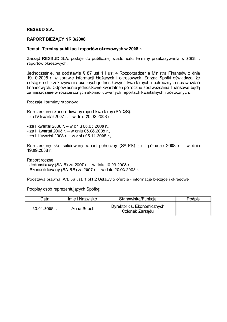 RESBUD S.A. RAPORT BIEśĄCY NR 3/2008 Temat: Terminy publikacji raportów okresowych w 2008 r. Zarząd RESBUD S.A. podaje do publicznej wiadomości terminy przekazywania w 2008 r. raportów okresowych. Jednocześnie, na podstawie § 87 ust 1 i ust 4 Rozporządzenia Ministra Finansów z dnia 19.10.2005 r. w sprawie informacji bieŜących i okresowych, Zarząd Spółki oświadcza, Ŝe odstąpił od przekazywania osobnych jednostkowych kwartalnych i półrocznych sprawozdań finansowych. Odpowiednie jednostkowe kwartalne i półroczne sprawozdania finansowe będą zamieszczane w rozszerzonych skonsolidowanych raportach kwartalnych i półrocznych. Rodzaje i terminy raportów: Rozszerzony skonsolidowany raport kwartalny (SA-QS): - za IV kwartał 2007 r. – w dniu 20.02.2008 r. - za I kwartał 2008 r. – w dniu 06.05.2008 r., - za II kwartał 2008 r. – w dniu 05.08.2008 r., - za III kwartał 2008 r. – w dniu 05.11.2008 r., Rozszerzony skonsolidowany raport półroczny (SA-PS) za I półrocze 2008 r – w dniu 19.09.2008 r. Raport roczne: - Jednostkowy (SA-R) za 2007 r. – w dniu 10.03.2008 r., - Skonsolidowany (SA-RS) za 2007 r. – w dniu 20.03.2008 r. Podstawa prawna: Art. 56 ust. 1 pkt 2 Ustawy o ofercie - informacje bieŜące i okresowe Podpisy osób reprezentujących Spółkę: Data Imię i Nazwisko Stanowisko/Funkcja 30.01.2008 r. Anna Sobol Dyrektor ds. Ekonomicznych Członek Zarządu Podpis