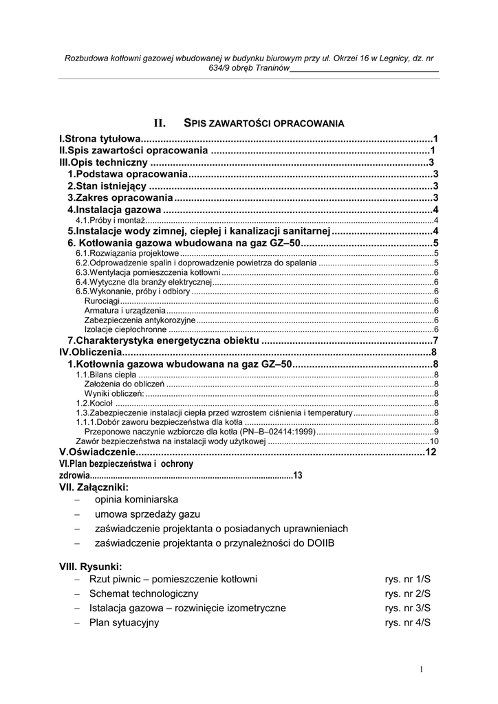 Rozbudowa kotłowni gazowej wbudowanej w budynku biurowym przy ul. Okrzei 16 w Legnicy, dz. nr 634/9 obręb Traninów II. SPIS ZAWARTOŚCI OPRACOWANIA I.Strona tytułowa........................................................................................................1 II.Spis zawartości opracowania ..............................................................................1 III.Opis techniczny ...................................................................................................3 1.Podstawa opracowania .......................................................................................3 2.Stan istniejący .....................................................................................................3 3.Zakres opracowania ............................................................................................3 4.Instalacja gazowa ................................................................................................4 4.1.Próby i montaŜ .............................................................................................................................4 5.Instalacje wody zimnej, ciepłej i kanalizacji sanitarnej ....................................4 6. Kotłowania gazowa wbudowana na gaz GZ–50...............................................5 6.1.Rozwiązania projektowe ..............................................................................................................5 6.2.Odprowadzenie spalin i doprowadzenie powietrza do spalania ..................................................5 6.3.Wentylacja pomieszczenia kotłowni ............................................................................................6 6.4.Wytyczne dla branŜy elektrycznej ................................................................................................6 6.5.Wykonanie, próby i odbiory .........................................................................................................6 Rurociągi ........................................................................................................................................6 Armatura i urządzenia ....................................................................................................................6 Zabezpieczenia antykorozyjne .......................................................................................................6 Izolacje ciepłochronne ...................................................................................................................6 7.Charakterystyka energetyczna obiektu .............................................................7 IV.Obliczenia..............................................................................................................8 1.Kotłownia gazowa wbudowana na gaz GZ–50..................................................8 1.1.Bilans ciepła ................................................................................................................................8 ZałoŜenia do obliczeń ....................................................................................................................8 Wyniki obliczeń: .............................................................................................................................8 1.2.Kocioł ..........................................................................................................................................8 1.3.Zabezpieczenie instalacji ciepła przed wzrostem ciśnienia i temperatury ...................................8 1.1.1.Dobór zaworu bezpieczeństwa dla kotła ..................................................................................8 Przeponowe naczynie wzbiorcze dla kotła (PN–B–02414:1999) ...................................................9 Zawór bezpieczeństwa na instalacji wody uŜytkowej ......................................................................10 V.Oświadczenie.......................................................................................................12 VI.Plan bezpieczeństwa i ochrony zdrowia........................................................................................13 VII. Załączniki: − opinia kominiarska − umowa sprzedaŜy gazu − zaświadczenie projektanta o posiadanych uprawnieniach − zaświadczenie projektanta o przynaleŜności do DOIIB VIII. Rysunki: − Rzut piwnic – pomieszczenie kotłowni − Schemat technologiczny − Istalacja gazowa – rozwinięcie izometryczne − Plan sytuacyjny rys. nr 1/S rys. nr 2/S rys. nr 3/S rys. nr 4/S 1 III. OPIS TECHNICZNY – BRANśA SANITARNA 1. Podstawa opracowania - Zlecenie Inwestora - Umowa sprzedaŜy gazu - Rozporządzenie Ministra Infrastruktury z dnia 12 kwietnia 2002 r. w sprawie warunków technicznych, jakim powinny odpowiadać budynki i ich usytuowanie. - Obowiązujące normy, normatywy i przepisy. 2. Stan istniejący Rozpatrywany obiekt jest budynkiem istniejącym, wyposaŜonym w kotłownię gazową i instalację centralnego ogrzewania oraz ciepłej wody uŜytkowej. Istniejąca kotłownia wyposaŜona jest w kocioł gazowy z palnikiem inŜektorowym i otwartą komorą spalania o mocy 90,5 kW. Kocioł oraz armatura kotłowni wykazują objawy zuŜycia. Na rurach pojawiły się ogniska korozji. W wyniku przeprowadzonych oględzin i analiz składu spalin stwierdzono, Ŝe istniejący kocioł oraz układ podgrzewacza c.w.u. cechuje się niską sprawnością i efektywnością energetyczną. Kotłownia w stanie istniejącym wyposaŜona jest w : -podgrzewacz c.w.u. o pojemności 150 litrów -naczynie wzbiorcze przeponowe po pojemności 140 litrów 3. Zakres opracowania Przedmiotem opracowania jest projekt przebudowy istniejącej kotłowni gazowej, polegającej na wymianie istniejącego stojącego kotła gazowego z otwartą komorą spalania na wiszący kocioł kondensacyjny z zamkniętą komorą spalania o takiej samej mocy. W związku z tym zakres projektu obejmie równieŜ zmianę s