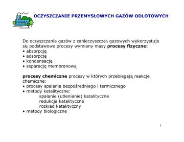 OCZYSZCZANIE PRZEMYSŁOWYCH GAZÓW ODLOTOWYCH Do oczyszczania gazów z zanieczyszczeń gazowych wykorzystuje się podstawowe procesy wymiany masy procesy fizyczne: • absorpcję • adsorpcję • kondensację • separację membranową procesy chemiczne procesy w których przebiegają reakcje chemiczne: • procesy spalania bezpośredniego i termicznego • metody katalityczne: spalanie (utlenianie) katalityczne redukcja katalityczna rozkład katalityczny • metody biologiczne 1 ABSORPCJA Absorpcja jest to dyfuzyjne przenoszenie cząsteczek substancji z jednej fazy (gazowej) przez granicę faz w objętość drugiej fazy ( cieczy) wywołane róŜnicą stęŜenia w obu fazach. Czyli absorpcja polega na pochłanianiu zanieczyszczeń gazowych przez ciecz (absorbent). Absorpcja zastosowanie: stęŜenie zanieczyszczeń wynosi kilka procent gazy rozcieńczone, gdy zanieczyszczenia są łatwo rozpuszczalne w absorbencie. Absorbenty: woda, roztwory kwasów, zasad, soli o właściwościach utleniających lub redukujących, związki organiczne. Produkt absorpcji - obojętny dla środowiska nie stanowi ponownego problemu do utylizacji. 2 ABSORPCJA Zwiększanie szybkości absorpcji: 1. zwiększenie powierzchni międzyfazowej 2. zwiększenie szybkości dyfuzji 3. absorpcja z reakcją chemiczną – np. z reakcją utleniania roztwory utleniaczy takich jak chlor, dwutlenek chloru, podchloryn sodowy, nadmanganian potasu oraz obecnie najbardziej popularny ozon. 4. wprowadzane do układu absorpcyjnego gaz - ciecz, cząstek stałych: elementy obojętne chemicznie zwiększające burzliwość układu, katalizatory, substancje reaktywne chemicznie, sorbenty naturalne i syntetyczne oraz substancje biologicznie czynne. 3 ABSORPCJA Absorber , skruber 4 ADSORPCJA Adsorpcja jest procesem, w którym cząsteczki ( lub cząstki , fragment cząsteczki - rodnik, atom) jednej substancji zostają związane na powierzchni innej substancji. Adsorbat - substancja, która ulega związaniu na granicy faz. Adsorbent - substancja na powierzchni, której następuje proces adsorpcji. Adsorpcja jest procesem egzotermicznym. Proces odwrotny - desorpcji jest endotermiczny. Dwa cykle- adsorpcja, desorpcja (regeneracja adsorbenta) 5 ADSORPCJA Etapy procesu adsorpcji: a) dyfuzja cząsteczek z wnętrza fazy gazowej do powierzchni zewnętrznej (D), b) dyfuzja cząsteczek w porach adsorbenta do jego powierzchni wewnętrznej (Dw), c) adsorpcja fizyczna cząsteczek na powierzchni adsorbenta. Etapy desorpcji Zwiększanie szybkości adsorpcji - zwiększenie powierzchni międzyfazowej rozdrabnianie adsorbenta - zwiększanie burzliwości przepływu 6 ADSORPCJA Adsorbenty Węgiel aktywny Powierzchnia właściwa węgli aktywnych sięga 1000 m2/g. Węgiel aktywny stosowany w procesach oczyszczania gazów musi mieć postać ziarnistą i odpowiednią wytrzymałość mechaniczną. Adsorbenty: krzemowe - silikaŜel, ziemia Fullera, tlenek glinu Adsorbenty glinowokrzemianowe - sita molekularne - zeolity syntetyczne o strukturze, w której wolne przestrzenie tworzą komory i kanały o ściśle określonych kształtach i wymiarach: Mx/n[(AlO2)x (SiO2)y].zH2O 7 ADSORPCJA 8 KONDENSACJA Kondensacja jest metodą usuwania z gazów odlotowych substancji o wysokich temperaturach wrzenia przez chłodzenie wodą lub powietrzem w wymiennikach ciepła. W metodzie kondensacji zanieczyszczeń gazowych stosuje się dwie metody chłodzenia: bezprzeponową i przeponową. 9 10 Metody membranowe Separacja membranowa oparta jest na selektywnej przepuszczalności zanieczyszczeń przez membrany ze środowiska gazów odlotowych. 10 Metody membranowe Transport cząsteczek - siła napędowa - to róŜnica: Ciśnień, StęŜeń, Temperatury, Potencjału elektrycznego. Rozdział zachodzi dzięki róŜnicy w szybkości transportu składników mieszaniny przez membranę. 11 METODY CHEMICZNE SPALANIE Spalanie - usuwanie z gazów odlotowych niebezpiecznych dla środowiska substancji palnych takich jak węglowodory, tlenek węgla, rozpuszczalniki organiczne itp.. W reakcji spalania węglowodory są utleniane do CO2 i H2O. Spaleniu podlegać mogą równieŜ organiczne aerozolowe cząstki stałe, dymy, mgły i krople. CH4 + 2O2 → CO2 + 2H2O 12 METODY KATALITYCZNE Katalizą nazywa się zjawisko zmiany szybkości reakcji chemicznych w wyniku oddziaływania na reagenty substancji zwanych katalizatorami. Katalizator definiuje się jako substancję, która zwiększa szybkość z jaką reakcja chemiczna osiąga stan równowagi, sama się jednak nie zuŜywa i której symbol nie występuje w równaniu stechiometrycznym. 13 01 KATALIZA HETEROGENICZNA Centrum aktywne jest to atom lub grupa atomów powierzchni, która tworzy z substratami wiązanie chemiczne prowadzące do powstania kompleksu przejściowego a następnie produktu Większość katalizatorów stałych zawiera trzy typy składników: 1.substancja aktywna ( 0,1 – 100%) 2.nośnik 3.Promotor Etapy reakcji katalitycznej – dyfuzja, adsorpcja, reakcja chemiczna, desorpcja, dyfuzja do fazy gazowej 14 KATALIZA HETEROGENICZNA Dezaktywacja katalizatorów: •blokowanie powierzchni przez depozyty pyłów •koksowanie LZO (depozyty węglowe) •sublimacja katalizatora •spiekanie powierzchni aktywnych •zatruwanie katalizatora ( siarkowodór, siarczki organiczne i nieorganiczne, związki arsenu, związki fosforu, ołowiu, rtęci) 15 KATALIZA HETEROGENICZNA 16 PROCESY KATALITYCZNE W OCHRONIE ŚRODOWISKA REDUKCJA KATALITYCZNA stosowana w procesach usuwania tlenków azotu z gazów odlotowych polega na redukcji tlenków azotu za pomocą róŜnych reduktorów jak amoniaku, tlenku węgla lub węglowodorów w obecności katalizatorów. ROZKŁAD KATALITYCZNY tlenków azotu na azot i tlen wobec katalizatorów. UTLENIANIE KATALITYCZNE węglowodorów, tlenku węgla do ditlenku węgla i wody. 17 METODY BIOLOGICZNE Biologiczne oczyszczanie gazów odlotowych opiera się na dwóch głównych procesach: •absorpcja zanieczyszczeń w wodzie, •biolog