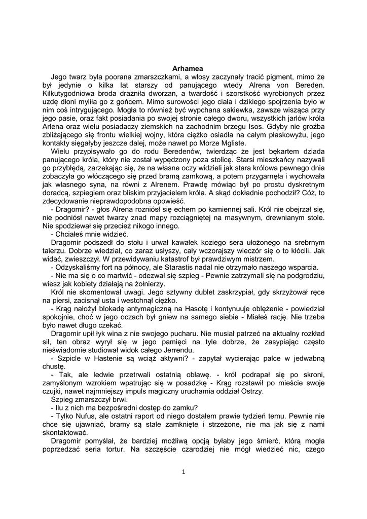 Arhamea Jego twarz była poorana zmarszczkami, a włosy zaczynały tracić pigment, mimo że był jedynie o kilka lat starszy od panującego wtedy Alrena von Bereden. Kilkutygodniowa broda drażniła dworzan, a twardość i szorstkość wyrobionych przez uzdę dłoni myliła go z gońcem. Mimo surowości jego ciała i dzikiego spojrzenia było w nim coś intrygującego. Mogła to również być wypchana sakiewka, zawsze wisząca przy jego pasie, oraz fakt posiadania po swojej stronie całego dworu, wszystkich jarlów króla Arlena oraz wielu posiadaczy ziemskich na zachodnim brzegu Isos. Gdyby nie groźba zbliżającego się frontu wielkiej wojny, która ciężko osiadła na całym płaskowyżu, jego kontakty sięgałyby jeszcze dalej, może nawet po Morze Mgliste. Wielu przypisywało go do rodu Beredenów, twierdząc że jest bękartem dziada panującego króla, który nie został wypędzony poza stolicę. Starsi mieszkańcy nazywali go przybłędą, zarzekając się, że na własne oczy widzieli jak stara królowa pewnego dnia zobaczyła go włóczącego się przed bramą zamkową, a potem przygarnęła i wychowała jak własnego syna, na równi z Alrenem. Prawdę mówiąc był po prostu dyskretnym doradcą, szpiegiem oraz bliskim przyjacielem króla. A skąd dokładnie pochodził? Cóż, to zdecydowanie nieprawdopodobna opowieść. - Dragomir? - głos Alrena rozniósł się echem po kamiennej sali. Król nie obejrzał się, nie podniósł nawet twarzy znad mapy rozciągniętej na masywnym, drewnianym stole. Nie spodziewał się przecież nikogo innego. - Chciałeś mnie widzieć. Dragomir podszedł do stołu i urwał kawałek koziego sera ułożonego na srebrnym talerzu. Dobrze wiedział, co zaraz usłyszy, cały wczorajszy wieczór się o to kłócili. Jak widać, zwieszczył. W przewidywaniu katastrof był prawdziwym mistrzem. - Odzyskaliśmy fort na północy, ale Starastis nadal nie otrzymało naszego wsparcia. - Nie ma się o co martwić - odezwał się szpieg - Pewnie zatrzymali się na podgrodziu, wiesz jak kobiety działają na żołnierzy. Król nie skomentował uwagi. Jego sztywny dublet zaskrzypiał, gdy skrzyżował ręce na piersi, zacisnął usta i westchnął ciężko. - Krąg nałożył blokadę antymagiczną na Hasotę i kontynuuje oblężenie - powiedział spokojnie, choć w jego oczach był gniew na samego siebie - Miałeś rację. Nie trzeba było nawet długo czekać. Dragomir upił łyk wina z nie swojego pucharu. Nie musiał patrzeć na aktualny rozkład sił, ten obraz wyrył się w jego pamięci na tyle dobrze, że zasypiając często nieświadomie studiował widok całego Jerrendu. - Szpicle w Hastenie są wciąż aktywni? - zapytał wycierając palce w jedwabną chustę. - Tak, ale ledwie przetrwali ostatnią obławę. - król podrapał się po skroni, zamyślonym wzrokiem wpatrując się w posadzkę - Krąg rozstawił po mieście swoje czujki, nawet najmniejszy impuls magiczny uruchamia oddział Ostrzy. Szpieg zmarszczył brwi. - Ilu z nich ma bezpośredni dostęp do zamku? - Tylko Nufus, ale ostatni raport od niego dostałem prawie tydzień temu. Pewnie nie chce się ujawniać, bramy są stale zamknięte i strzeżone, nie ma jak się z nami skontaktować. Dragomir pomyślał, że bardziej możliwą opcją byłaby jego śmierć, którą mogła poprzedzać seria tortur. Na szczęście czarodziej nie mógł wiedzieć nic, czego 1 zdradzenie mogło zagrozić mertańczykom. W Hastenie zwolniło się miejsce dla najlepszego szpiega na kontynencie, co niezmiernie go cieszyło. - Mam tam jechać? - spytał od niechcenia. Król spojrzał na niego prostując się. - Wykluczone - pokręcił głową - jesteś mi potrzebny tutaj. Wyślę tam kogoś innego. Dragomir chciał prychnąć, jednak w ostatniej chwili się powstrzymał. - Wiesz przecież, że byłoby to najbezpieczniejsze wyjście. Potrzebujesz kolejnego martwego szpiega, czy nowych informacji, które w naszej obecnej sytuacji mogą okazać się zbawienne? - zapytał przyglądając się jak twarz Alrena na dźwięk ostatnich słów stężała. Król obszedł salę, a idąc jego cień wyginał się na kamiennych ścianach. Opierając dłonie o blat nachylił się po raz kolejny nad mapą, by ponownie zmęczonymi oczami wpatrywać się w cienkie linie jego zasięgów oraz jedną grubszą, biegnącą niemal przez środek, od zawsze niezmienną. - Wiesz jak brzmiał ostatni raport Nufusa? - zapytał cicho Alren - Mówił o dziewczynce, na której bardzo zależy czarodziejom z Kręgu. Podobno Ostrza zgubiły ją w Hastenie. Zamknięte bramy i strażnicy na każdym rogu są właśnie z jej powodu. Mówił, że to elfka. Dragomir niemal zakrztusił się winem z przyprawami. - Elfka? Przecież to wymarła rasa, tym bardziej na południu. Jesteś pewien, że to nie była prowokacja? - Powiesili z tego powodu dwóch oficerów Ostrzy - król spojrzał poważnym wzrokiem na swojego szpiega - Jeżeli to wszystko było zaplanowane, to Krąg musi być pewien naszej reakcji. - Jeśli Ostrzom udało się zgubić małą dziewczynkę to wcale nie dziwie się tej małej czystce - Dragomir zaśmiał się. - Ona rzuca zaklęciami na lewo i prawo. Niemal nie zabiła eskortujących ją strażników. - Z tego co pamiętam elfy i magia to, powiedziałbym, dość niespotykane i trudne połączenie - Dragomir uniósł brwi opierając się barkiem o ścianę. - Ale jeśli już się pojawi, to z reguły jest do czynienia z ogromną mocą. Właśnie dlatego musimy zbadać sprawę. Jeżeli rzeczywiście jest tak jak mówią, to ona jest w stanie zakończyć tę wojnę. Możemy wymienić ją na akt rozejmu. W inny sposób nie damy im rady, gdy zdobędą Hasotę nic ich już nie powstrzyma przed jazdą na stolicę. W sali zapanowała cisza. Na oświetlonej przez płomienie świec twarzy Arlena widać było kropelki potu, mimo, że w pomieszczeniu było chłodno. Jego podkrążone oczy i zmarszczone czoło były skutkiem ostatnich dni stresu i 