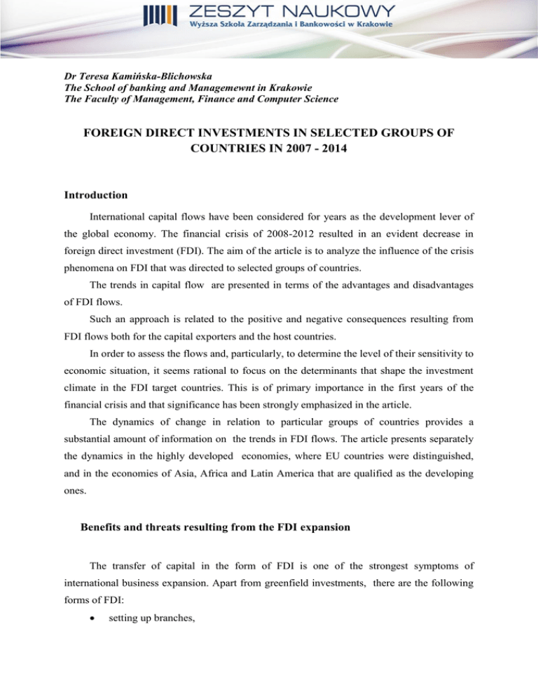 Dr Teresa Kamińska-Blichowska The School of banking and Managemewnt in Krakowie The Faculty of Management, Finance and Computer Science FOREIGN DIRECT INVESTMENTS IN SELECTED GROUPS OF COUNTRIES IN 2007 - 2014 Introduction International capital flows have been considered for years as the development lever of the global economy. The financial crisis of 2008-2012 resulted in an evident decrease in foreign direct investment (FDI). The aim of the article is to analyze the influence of the crisis phenomena on FDI that was directed to selected groups of countries. The trends in capital flow are presented in terms of the advantages and disadvantages of FDI flows. Such an approach is related to the positive and negative consequences resulting from FDI flows both for the capital exporters and the host countries. In order to assess the flows and, particularly, to determine the level of their sensitivity to economic situation, it seems rational to focus on the determinants that shape the investment climate in the FDI target countries. This is of primary importance in the first years of the financial crisis and that significance has been strongly emphasized in the article. The dynamics of change in relation to particular groups of countries provides a substantial amount of information on the trends in FDI flows. The article presents separately the dynamics in the highly developed economies, where EU countries were distinguished, and in the economies of Asia, Africa and Latin America that are qualified as the developing ones. Benefits and threats resulting from the FDI expansion The transfer of capital in the form of FDI is one of the strongest symptoms of international business expansion. Apart from greenfield investments, there are the following forms of FDI: setting up branches, setting up divisions, mergers and acquisitions, hostile and friendly takeovers. Apart from the expansion forms listed above, there are international non-investment flows, mainly1: licence flows, offshoring agreements, franchising agreements, subcontracting, consortia with activity profiles typical for particular regions. Non-investment flows are not the object of the analysis below. FDI is the effect of the choice between the exports of particular goods and services and a transfer of capital with the aim to start manufacturing operations in a host country. The analysis of the advantages and disadvantages of both alternatives is decisive. FDI –related benefits include the following aspects2: lower labor costs, particularly regarding staff remuneration; better competitive conditions on the foreign market than on the home market, bigger purchasing power of the foreign market; insignificant level of currency risk; better availability of natural resources and lower costs of raw materials acquisition; more efficient logistics and transport infrastructure; more favorable tax system; less bureaucracy as regards investment procedures; more transparent and simpler legal system in the host country in comparison to that in the home country (this factor concerns mainly the liberalization of environmental regulations). 1 The forms concern mainly the European and North American markets, which is pointed out in: Z. Dworzecki,W. Mierzejewska (Ed.), Zachowania polskich grup kapitałowych w czasach kryzysu, Oficyna Wyd. SGH, Warszawa 2015, pp.124-129. 2 This may also concern less rigorous law, lower penalties for the breach of regulations, especially regarding environmental protection. FDI-related threats concern particularly the following issues3: limitations to profit transfer; political risk resulting from an instable situation in this field, which may lead to the nationalization of vital sectors (for example of the mining or transport sector, which happens quite frequently in the global economy); undermining the image of incoming companies by potential competitors; the necessity to improve the qualifications of the host country staff, which may significantly raise the costs of entering the market. Determinants and volume of FDI flows in the financial crisis In the course of the latest great financial crisis of 2008-2012, a sudden and substantial global decrease of FDI could be noted in 2008-2012, while after this period, at the end of 2012 an increasing trend appeared which was continued and gained in momentum in 20132015. The estimations show that only as late as in 2015 the total global volume of FDI approached the figures of the best period, i.e. of 2007. The evolution of the volume of FDI is given in table 1. It can be concluded from the figures that after the crisis, the FDI flows rose as late as in 2015. However, one may wonder on the reasons of the drop in 2011-2014. They are reasonably simple to diagnose. Undoubtedly, the political unrest resulted in the decrease of interest in foreign investment. The investors remained cautious as they feared of a further escalation of terrorism and changes in legal systems. However, in time they got used to the situation, which resulted in a sudden rise of capital flow in 2015 Table 1. FDI flows in 2007-2015 (billions of USD) Volume Dynamics Dynamics Year (billions of dollars) (previous year = 100) (2007 = 100) 1. 2007 1 872 100.0 100.0 2. 2008 1 490 -20.4 -20.4 3. 2009 1 187 -20.3 -36.6 4. 2010 1 328 11.9 -29.0 See more in J. Rymarczyk (ed.), Międzynarodowe stosunki gospodarcze, PWE, Warszawa 2006, p.113 et seq. and J. Rymarczyk (Ed.), Handel zagraniczny. Organizacja i technika, PWE, Warszawa 2005, pp. 30-32. 3 5. 2011 1 565 17.7 -16.4 6. 2012 1 403 -10.4 -25.1 7. 2013 1 467 4.5 -21.6 8. 2014 1 228 16.3 -34.4 9. 2015 1 990 62.0 6.3 For 2015 : projections of UNCTAD and World Business Report, Washington – New York 2014, p. 17. Source: Author’s calculations and research based on : World Investment Report, United Nations Conference on Trade and Development (UNCTAD), New York 2012, 2014, Tables number 1.1.. – 1.3. World, Economy, Years. On the basis of the presented above benefits and thr