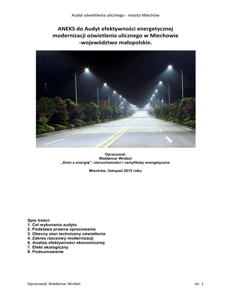 Audyt oświetlenia ulicznego - miasto Miechów ANEKS do Audyt efektywności energetycznej modernizacji oświetlenia ulicznego w Miechowie -województwo małopolskie. Opracował: Waldemar Wróbel „Dom z energią”- nieruchomości i certyfikaty energetyczne Miechów, listopad 2015 roku Spis treści: 1. Cel wykonania audytu 2. Podstawa prawna opracowania 3. Obecny stan techniczny oświetlenia 4. Zakres rzeczowy modernizacji 6. Analiza efektywności ekonomicznej 7. Efekt ekologiczny 8. Podsumowanie Opracował: Waldemar Wróbel str. 1 Audyt oświetlenia ulicznego - miasto Miechów 1. Cel wykonania audytu. Niniejszy aneks do audyt efektywności energetycznej modernizacji oświetlenia ulicznego na terenie miasta Miechowa wykonano na zlecenie Urzędu Gminy i Miasta w Miechowie. Inwestor zlecił wykonanie obliczeń dotyczących oszczędności i kosztów przy docelowym zastosowaniu opraw i źródeł światła o mocy i ilości zestawionych w poniżej zamieszczonej tabeli: Moc punktu świetlnego 62 W 91 W 134 W Razem Ilość opraw 80 160 160 400 2. Podstawa opracowania. Za podstawę niniejszego opracowania przyjęto akty prawne oraz normy regulujące całokształt zagadnień związanych z budową, remontem i funkcjonowaniem oświetlenia drogowego: 1. Norma PN-EN13201 i PN-EN 12464 dotycząca oświetlenia dróg 2. Ustawa Prawo Budowlane - z dnia 7 lipca 1994 roku. Prawo Budowlane (Dz. U. z 2015r poz 200, ustawa nowelizująca z 20.02.2015 r.). Stan prawny Marzec 2015 roku, zwanej dalej Ustawą, roboty budowlane polegające na instalowaniu urządzeń, jakimi są oprawy oświetleniowe wraz z osprzętem elektrycznym (złącza bezpiecznikowe zaciski przyłączeniowe) oraz mechanicznym (wysięgniki), na obiektach budowlanych jakimi są istniejące słupy sieci elektroenergetycznej niskiego napięcia, nie wymagają Pozwolenia na Budowę według przepisów Ustawy Art. 29 ust. 2 pkt. 15 oraz nie wymagają zgłoszenia właściwemu organowi według przepisów Art. 30 ust. 1pkt.2 3.Ustawa o efektywności energetycznej - Dz. U. z 2011r.Nr 94, poz. 551,951 4.Rozporządzenie Ministra Gospodarki w sprawie szczegółowego zakresu i sposobu sporządzania audytu efektywności energetycznej. - Dz. U. z 2012r. Poz. 962 5.Inwentaryzacja punktów oświetlenia ulicznego dostarczona przez Urząd Gminy i Miasta w Miechowie. 3. Obecny stan techniczny oświetlenia. Zinwentaryzowane punkty świetlne, które znajdują się na terenie Miechowa posiadają rtęciowe źródło światła. Są to urządzenia starego typu, które charakteryzuje: - niska żywotność - 10 000 h - mała skuteczność świetlna - 40 do 60 lm/W - słabe oddawanie kolorów - słabe rysowanie kształtów - zły stan techniczny szeregu opraw i duża awaryjność Oprawy świetlne ze źródłem światła Led przewidziane do montażu w ramach planowanego remontu – modernizacji charakteryzuje: - długa trwałość - 50 000 h - duża skuteczność świetlna - 100 lm/W - dobre oddawanie barw - dobre rysowanie kształtów Opracował: Waldemar Wróbel str. 2 Audyt oświetlenia ulicznego - miasto Miechów Obecnie w Miechowie na terenie, który został objęty inwentaryzacją znajdują się następujące nast punkty oświetlenia ulicznego: Moc punktu świetlnego 150W 250W 400W Razem Ilość opraw 80szt 160szt 160szt 400szt Moc zainstalowana 12000W 40000W 64000W 116000W Moc zainstalowana oświetlenia ulicznego na chwilę inwentaryzacji wynosiła 116kW. Średnia energochłonność punktu świetlnego przed remontem i modernizacją wynosiła wynosi 290W/pkt. Należy nadmienić że oprawy oraz źródła światła są w złym stanie techniczny i kwalifikują się w całości do wymiany. Istniejące oświetlenie drogowe na terenie objętym inwentaryzacją wykonane jest w oparciu o oprawy z rtęciowymi źródłami światła. Oprawy te są wyeksploatowane i nie spełniają wymogów technicznych i jakościowych odpowiadających obecnie obowiązującym normom. Oprawy w większości nie posiadają kloszy chroniących źródło światła, co z kolei wpływa na korodowanie odbłyśników i w konsekwencji strumień światła kierowany na powierzchnie drogi przez oprawę jest znikomy. Ponadto wysięgniki na których zamontowane są obecnie oprawy oświetleniowe maja różne długości jak też ich kąt nachylenia nie jest jednakowy, jednakowy przez co bez ich wymiany nie możliwe będzie uzyskanie parametrów zgodnych dnych z norma. 4. Zakres rzeczowy modernizacji. modernizacji W zakresie modernizacji przewidziano wymianę opraw zainstalowanych na oprawy ze źródłami światła LED o mocy i w ilości zestawionej w tabeli: Moc punktu świetlnego 62W 91W 134W Razem Ilość opraw 80szt 160szt 160szt 400szt Moc zainstalowana 4960W 14560W 21440W 40960W Po przeprowadzeniu modernizacji moc zainstalowana oświetlenia ulicznego wyniesie 40,96kW a średnia energochłonność punktu świetlnego 102,40W/pkt. 116,00kW 40,96kW p przed modernizacją po modernizacji Wykres 1. Nominalna moc zainstalowanego oświetlenia przed i po modernizacji. Opracował: Waldemar Wróbel str. 3 Audyt oświetlenia ulicznego - miasto Miechów 290,00W 102,40W przed rzed modernizacją po modernizacji Wykres 2. Średnia energochłonność punktu świetlnego przed i po modernizacji. Prace modernizacyjne obejmą: 1.Demontaż/montaż opraw oświetleniowych w ilości - 400szt 2. Demontaż/montaż wysięgników w ilości - 400szt 3. Demontaż/montaż przewodów zasilających - 400szt 4. Demontaż/montaż zacisków - 800szt 5. Demontaż/montaż zabezpieczeń z wkładem - 400szt Prace powinny być wykonane w technologii PPN - prace pod napięciem. 5. Analiza efektywności ekonomicznej. ekonomicznej Wykonanie modernizacji w podanym wyżej zakresie wymaga poniesienia następujących nakładów: Określenie kosztu Średni koszt jednostkowy Sztuk Koszt całkowity Oprawy/źródła światła 1200pln 400 480000pln Wysięgniki i inne akcesoria 250pln 400 100000pln Robocizna/podnośnik 450pln 400 180000pln Razem 1900pln 400 760000pl