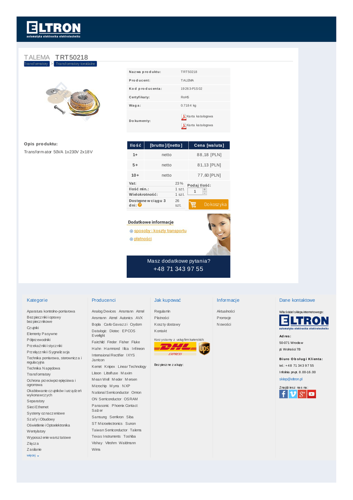 T ALEMAT RT 50218 Transformatory > Transformatorytoroidalne N a z wa p ro d u ktu : T RT 50218 P ro d u c en t: T ALEMA K o d p ro d u c en ta : 19 26 3-P1S 02 C ertyfi ka ty: RoHS Wa g a : 0.718 4 kg Ka rta ka ta logowa D o ku m en ty: Ka rta ka ta logowa O pis pro duktu: Ilo ś ć [brutto ] /[netto ] Cena [wa luta ] 1+ netto 8 8 ,18 [PLN] 5+ netto 8 1,13[PLN] 10 + netto Tr ansfor m ator 50VA1x230V2x18 V 7 7 ,60[PLN] Vat: 23% Ilośćmin.: Wielokrotność: 1sz t. 1sz t. Dostępnewciąg u 3 d ni: 26 sz t. Pod ajIlość: + 1 - Dokosz yka Maszdodatkowepytania? +48713439755 Kategorie Producenci Jakkupować Informacje Danekontaktowe Aparaturakontrolno-pomiarowa AnalogDevices|Ansmann|Atmel Regulamin Aktualności Wła ścicielsklepuinternetowego: Bez piecz nikiioprawy bez piecz nikowe Ansmann|Atmel|Autonics|AVX Płatności Promocje Bopla |CarloGavaz z i|Crydom Kosz tydostawy N owości Datalogic|Diotec|EPCOS | Everlight Kontakt Cz ujniki ElementyPasywne Półprz ewodniki Prz ekaź nikiistycz niki Prz ełącz nikiiSygnaliz acja Technikapomiarowa,sterownicz ai regulacyjna Fairchild|Finder|Fisher|Fluke Korz ysta myz usługfirmkurierskich: H ahn|H ammond|Illca |Infineon Ad res : 50-071Wrocła w pl.Wolności7B InternaionalRectifier|IXYS | Jamicon B i u ro O b s ł u g i K l i en ta : Bez piecz nez a kupy: tel.:+ 4 8 7134 39 755 TechnikaN apędowa Kemet|Knipex|LinearTechnology Transformatory Liteon|Littelfuse|M axim I nfolinia pn-pt.8 .00-16 .00 Ochronaprz eciwprz epięciowai ogromowa M eanWell|M eder|M ersen [email protected] M icrochip|M yrra |N XP Okablowaniecz ujnikówiurz ądz eń wykonawcz ych Z na jdz iesz na sna : N ationalSemiconductor|Omron Separatory ON Semiconductor|OSRAM SieciEthernet Panasonic|PhoenixContact| Salz er Systemyoz nacz eniowe Sz afyiObudowy Samsung|Semikron|Siba OświetlenieiOptoelektronika STM icroelectronics|Sunon Wentylatory TaiwanSemiconductor|Talema Wyposaż eniewarsz tatowe TexasInstruments|Toshiba Z łącz a Vishay|Vitrohm|Waldmann Z asilanie Wima więcej