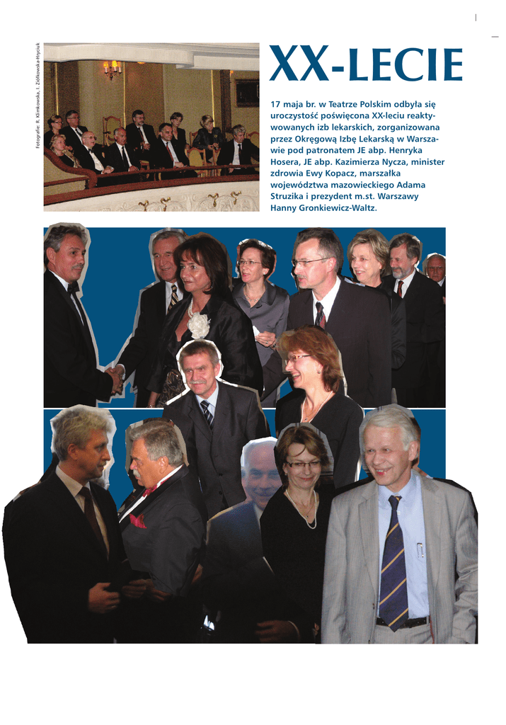 Fotografie: R. Klimkowska, I. Zió³kowska-Hryciuk XX-LECIE 17 maja br. w Teatrze Polskim odby³a siê uroczystoæ powiêcona XX-leciu reaktywowanych izb lekarskich, zorganizowana przez Okrêgow¹ Izbê Lekarsk¹ w Warszawie pod patronatem JE abp. Henryka Hosera, JE abp. Kazimierza Nycza, minister zdrowia Ewy Kopacz, marsza³ka województwa mazowieckiego Adama Struzika i prezydent m.st. Warszawy Hanny Gronkiewicz-Waltz. ODRODZONEGO SAMORZ¥DU D LEKARSKIEGO o Teatru Polskiego przybyli m.in.: wicepremier W. Pawlak, minister zdrowia E. Kopacz, pos³owie (m.in. M. Balicki, C. Czechyra, A. Sopliñski), senatorowie S. Karczewski i W. Sidorowicz, komisarz KE ds. polityki regionalnej D. Hübner, wicemarsza³ek województwa mazowieckiego W. Roszkiewicz, wiceprezydent Warszawy J. Wojciechowicz, w³adze WUM z rektorem M. Krawczykiem, CMKP z dyrektor J. Jêdrzejczak, dyrektor CEM S. Orkisz, profesorowie warszawskiej medycyny, prezes PTL J. Woy-Wojciechowski, prezes TLW J. Jurkiewicz, wybitni prawnicy od 20 lat towarzysz¹cy samorz¹dowi lekarskiemu: prof. E. Zieliñska i prof. L. Kubicki. Byli z nami duszpasterze s³u¿by zdrowia ks. J. Jachimczak i ks. A. Otyszecki, dyrektorzy instytutów naukowo-badawczych oraz innych placówek medycznych Mazowsza, koledzy z naczelnej i okrêgowych rad lekarskich (prezes NRL K. Radziwi³³, wiceprezes A. Lella, cz³onek Prezydium A. Matyja, przewodnicz¹cy ORL w: Krakowie J. Friediger, w £odzi G. Krzy¿anowski, Okrêgowej Rady WIL M. Brocki). Tarnów reprezentowa³ by³y przewodnicz¹cy ORL P. Oleksy, Lublin i NRL D. Hankiewicz. Chocia¿ nieuchwyceni na zdjêciach byli z nami: Naczelna Rzecznik Odpowiedzialnoci Zawodowej J. Or³owska-Heizman i prezes NSL J. Nosarzewski. Byli nasi rzecznicy, z J. Barbachowsk¹, i cz³onkowie OSL, z jego przewodnicz¹c¹ E. Rusieck¹-Kucza³ek i cz³onkowie w³adz naszego samorz¹du tej i poprzednich kadencji. Gocilimy przedstawicieli innych korporacji zawodowych, w³adze STOMOZ-u i dziennikarzy. W kuluarach mo¿na by³o spotkaæ by³ych ministrów zdrowia: W. Maksymowicza, L. Sikorskiego, W. Rudnickiego i wielu innych wspania³ych goci. Szczególnymi za goæmi byli dla nas synowie Jerzego Moskwy honorowego przewodnicz¹cego naszej Izby i W. Nielubowicz syn naszego patrona. Wspó³gospodarzami tej czêci uroczystoci byli przewodnicz¹cy ORL A. W³odarczyk i P. Walewski lekarz, publicysta Polityki, felietonista Pulsu. www.miesiecznik-puls.org.pl nr 6 (170) czerwiec 2009 1 Cd. na s. 10 þ na marginesie Dajmy szansê pomyleñcom Na uroczystoci powiêconej dwudziestoleciu odrodzonego samorz¹du lekarskiego, zorganizowanej przez nasz¹ Okrêgow¹ Izbê, dziêkowa³em, w imieniu uhonorowanych kolegów, za przyznane nam pañstwowe i korporacyjne odznaczenia. Przy tej okazji powiedzia³em od siebie, ale wiem, ¿e po myli nas wszystkich, ¿e nie dzia³amy dla honorów i orderów. Czêsto spotykamy siê z pytaniem: A w³aciwie po co to robimy? Warto wówczas przytoczyæ s³owa alpinisty, który pytany, dlaczego wspina siê na tê górê, odpowiada: Bo istnieje. Widzimy zadania, drêcz¹ce sprawy i rzucamy siê na nie bo istniej¹! Nr 6 (170) czerwiec 2009 Na ok³adce: komisarz KE ds. polityki regionalnej Danuta Hübner (fot. R. Klimkowska) Reprodukcja: Wiktoria Mikulska Czerwony koñ w w w. m i e s i e c z n i k - p u l s . o r g . p l W numerze m.in: ¢ ¢ ¢ ¢ ¢ ¢ ¢ ¢ ¢ ¢ ¢ ¢ 2 XX-lecie samorz¹du lekarskiego 1 gor¹cy temat O sytuacji w Ciechanowie 4 apele ORL 5 wywiady z komisarz Danut¹ Hübner 7 z prof. Jerzym Stelmachowem 26 uchwa³y i stanowiska XXVII OZL 12 uchwa³y ORL 14 listy: stomatologia 16 Zak³ad Radiologii Klinicznej WUM 19 oferty pracy 30 z Mazowsza 28 Centrum Obrazowania Biomedycznego w Kajetanach 29 z radomskiej delegatury 30 analizy Niemieckie ustawodawstwo... 22 g³osy z Wiejskiej 8 wspomnienia o prof. M. J. Stopczyku 38 o dr. J. Kierskim 40 o dr. A. Kurpiñskim 47 sta³e rubryki SMS z Krakowa 31 200-lecie WUM 32 muzy i my 36 sport 42 nowe przepisy prawne 44 felietony Balicki 6 Walewski 8 Müldner-Nieckowski 35 Chwila odznaczeñ jest ulotn¹ chwil¹ dobrej s³awy, pojêcia wywodz¹cego siê ze staro¿ytnoci. Jest to chwila satysfakcji, której nie powinnimy siê wstydziæ, ale przed zawrotem g³owy chroni nas wiadomoæ w³asnych pora¿ek i niedokonañ oraz myl o nadchodz¹cej codziennoci z nowymi szczytami do pokonania. Jest wiele spraw, które nam, lekarzom, nie daj¹ spokoju. Stosunek do kolegów-spo³eczników uwidacznia siê teraz, w trakcie spotkañ wyborczych, które maj¹ wy³oniæ naszych delegatów na okrêgowy zjazd lekarzy, a potem tak¿e do w³adz naszej Izby i krajowych organów samorz¹du lekarskiego. Niestety, zebrania wyborcze w bardzo wielu przypadkach s¹ ignorowane. Ale, jak s¹dzê, nie tyle przez zdeklarowanych przeciwników samorz¹du, ile przez zaaferowanych prac¹ kolegów, niewiadomych tego, ¿e aby samorz¹d dzia³a³ dobrze, trzeba daæ szansê owym dziwakom tym, którzy nie potrafi¹ przechodziæ obojêtnie obok naszych spraw. Dajmy im szansê, powiêæmy na zebranie wyborcze tê jedn¹ godzinê chocia¿ raz na cztery lata! Krzysztof SCHREYER WYDAWCA MIESIÊCZNIKA PULS: Okrêgowa Izba Lekarska w Warszawie, e-mail: [email protected] REDAKCJA: 00-070 Warszawa, ul. Kozia 3/5, lok. 31, tel./fax: 850-18-10, e-mail: [email protected] REDAKTOR NACZELNY: Ewa Gwiazdowicz, tel. 828-11-41, e-mail: [email protected] SEKRETARZ REDAKCJI: Maria Dolacka, tel./fax: 850-18-10, e-mail: [email protected] KOLEGIUM REDAKCYJNE: Stanis³aw Ancyparowicz, Janusz Bugaj, W³odzimierz Cerañski, Janusz Garlicki, Wies³aw Jêdrzejczak, Tadeusz Kalbarczyk, Jerzy Kruszewski, Wojciech Maria Ku, Ryszard Majkowski, £adys³aw Nekanda-Trepka, Stanis³aw Niemczyk, Gra¿yna Pacocha, Wojciech Rowiñski, Tadeusz To³³oczko, Maria Wierzbicka, Andrzej W³odarczyk KOMENTATORZY: Marek Balicki, Pawe³ Walewski PUBLICYCI: Ewa Dobrowolska, Ma³gorzata Kukowska WSPÓ£PRACUJ¥: Anna Bie¿añska, Jerzy Borowicz, Jan Ciszecki, Wojc