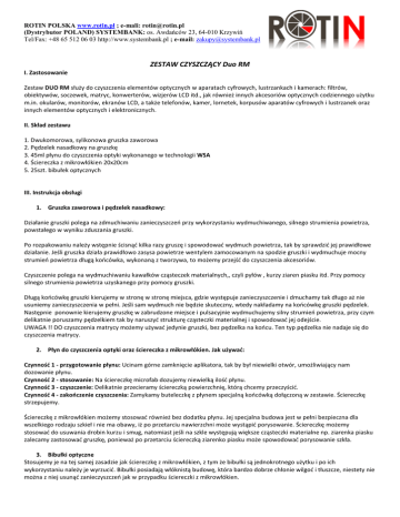 ROTIN POLSKA www.rotin.pl ; e-mali: [email protected] (Dystrybutor POLAND) SYSTEMBANK: os. Awdańców 23, 64-010 Krzywiń Tel/Fax: +48 65 512 06 03 http://www.systembank.pl ; e-mail: [email protected] ZESTAW CZYSZCZĄCY Duo RM I. Zastosowanie Zestaw DUO RM służy do czyszczenia elementów optycznych w aparatach cyfrowych, lustrzankach i kamerach: filtrów, obiektywów, soczewek, matryc, konwerterów, wizjerów LCD itd., jak również innych akcesoriów optycznych codziennego użytku m.in. okularów, monitorów, ekranów LCD, a także telefonów, kamer, lornetek, korpusów aparatów cyfrowych i lustrzanek oraz innych elementów optycznych i elektronicznych. II. Skład zestawu 1. Dwukomorowa, sylikonowa gruszka zaworowa 2. Pędzelek nasadkowy na gruszkę 3. 45ml płynu do czyszczenia optyki wykonanego w technologii WSA 4. Ściereczka z mikrowłókien 20x20cm 5. 25szt. bibułek optycznych III. Instrukcja obsługi 1. Gruszka zaworowa i pędzelek nasadkowy: Działanie gruszki polega na zdmuchiwaniu zanieczyszczeń przy wykorzystaniu wydmuchiwanego, silnego strumienia powietrza, powstałego w wyniku zduszania gruszki. Po rozpakowaniu należy wstępnie ścisnąć kilka razy gruszę i spowodować wydmuch powietrza, tak by sprawdzić jej prawidłowe działanie. Jeśli gruszka działa prawidłowo zasysa powietrze wentylem zamocowanym na spodzie gruszki i wydmuchuje mocny strumień powietrza długą końcówka, wykonaną z tworzywa, to możemy przejść do czyszczenia akcesoriów. Czyszczenie polega na wydmuchiwaniu kawałków cząsteczek materialnych,, czyli pyłów , kurzy ziaren piasku itd. Przy pomocy silnego strumienia powietrza uzyskanego przy pomocy gruszki. Długą końcówkę gruszki kierujemy w stronę w stronę miejsca, gdzie występuje zanieczyszczenie i dmuchamy tak długo aż nie usuniemy zanieczyszczenia w pełni. Jeśli sam wydmuch nie będzie skuteczny, wtedy nakładamy na końcówkę gruszki pędzelek. Następnie ponownie kierujemy gruszkę w zabrudzone miejsce i pulsacyjnie wydmuchujemy silny strumień powietrza, przy czym delikatnie poruszamy pędzelkiem tak by naruszyć strukturę cząsteczki materialnej i spowodować jej odejście. UWAGA !! DO czyszczenia matrycy możemy używać jedynie gruszki, bez pędzelka na końcu. Ten typ pędzelka nie nadaje się do czyszczenia matrycy. 2. Płyn do czyszczenia optyki oraz ściereczka z mikrowłókien. Jak używać: Czynność 1 - przygotowanie płynu: Ucinam górne zamknięcie aplikatora, tak by był niewielki otwór, umożliwiający nam dozowanie płynu. Czynność 2 - stosowanie: Na ściereczkę microfab dozujemy niewielką ilość płynu. Czynność 3 - czyszczenie: Delikatnie przecieramy ściereczką powierzchnię, którą chcemy przeczyścić. Czynność 4 - zakończenie czyszczenia: Zamykamy buteleczkę z płynem specjalną końcówką dołączoną w zestawie. Ściereczkę strzepujemy. Ściereczkę z mikrowłókien możemy stosować również bez dodatku płynu. Jej specjalna budowa jest w pełni bezpieczna dla wszelkiego rodzaju szkieł i nie ma obawy, iż po przetarciu nawierzchni może wystąpić porysowanie. Ściereczkę możemy stosować do usuwania drobin kurzu i smug, natomiast jeśli na szkle występują większe cząsteczki materialne np. ziarenka piasku zalecamy zastosować gruszkę, ponieważ po przetarciu ściereczką ziarenko piasku może spowodować porysowanie szkła. 3. Bibułki optyczne Stosujemy je na tej samej zasadzie jak ściereczkę z mikrowłókien, z tym że bibułki są jednokrotnego użytku i po ich wykorzystaniu należy je wyrzucić. Bibułki posiadają włóknistą budowę, która bardzo dobrze chłonie wilgoć i tłuszcze, niestety nie można z niej usunąć zanieczyszczeń jak w przypadku ściereczki z mikrowłókien.