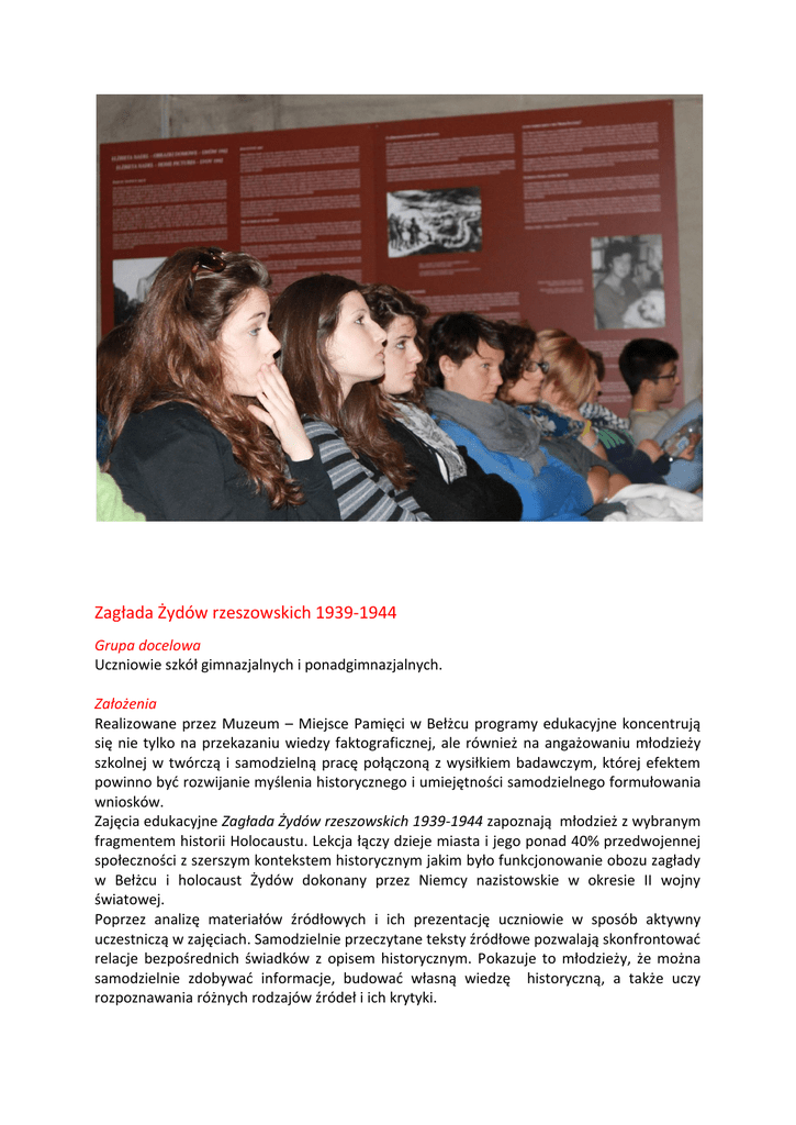 Zagłada Żydów rzeszowskich 1939-1944 Grupa docelowa Uczniowie szkół gimnazjalnych i ponadgimnazjalnych. Założenia Realizowane przez Muzeum – Miejsce Pamięci w Bełżcu programy edukacyjne koncentrują się nie tylko na przekazaniu wiedzy faktograficznej, ale również na angażowaniu młodzieży szkolnej w twórczą i samodzielną pracę połączoną z wysiłkiem badawczym, której efektem powinno być rozwijanie myślenia historycznego i umiejętności samodzielnego formułowania wniosków. Zajęcia edukacyjne Zagłada Żydów rzeszowskich 1939-1944 zapoznają młodzież z wybranym fragmentem historii Holocaustu. Lekcja łączy dzieje miasta i jego ponad 40% przedwojennej społeczności z szerszym kontekstem historycznym jakim było funkcjonowanie obozu zagłady w Bełżcu i holocaust Żydów dokonany przez Niemcy nazistowskie w okresie II wojny światowej. Poprzez analizę materiałów źródłowych i ich prezentację uczniowie w sposób aktywny uczestniczą w zajęciach. Samodzielnie przeczytane teksty źródłowe pozwalają skonfrontować relacje bezpośrednich świadków z opisem historycznym. Pokazuje to młodzieży, że można samodzielnie zdobywać informacje, budować własną wiedzę historyczną, a także uczy rozpoznawania różnych rodzajów źródeł i ich krytyki. Cele • Ogólna charakterystyka życia społeczno-politycznego i danych demograficznych dotyczących Żydów rzeszowskich w okresie międzywojennym. • Umiejętność opisania sytuacji ludności żydowskiej w okupowanym Rzeszowie, utworzenia i likwidacji getta – deportacji do obozu zagłady w Bełżcu. • Umiejętność wskazania sprawców oraz kluczowych dat i okresów dla omawianego tematu. • Rozwijanie umiejętności analizy źródła historycznego, inspirowanie do dalszego zajmowania się historią. • Formułowanie pytań dotyczących postaw i relacji międzyludzkich w okresie II wojny światowej; refleksja nad ponadczasowymi wartościami jak godność i prawa człowieka. Środki dydaktyczne Prezentacja multimedialna, kserokopie materiałów źródłowych – fragmenty zeznań, relacji, fragment wyroku sądowego, zdjęcia. Metody pracy Wygłoszenie przez pracownika muzeum tekstu wprowadzającego oraz przedstawienie kalendarium wydarzeń, praca w grupach z tekstami źródłowymi – zeznaniami, relacjami, wyrokiem sądowym. Przebieg Przed planowanym przyjazdem do Muzeum – Miejsca Pamięci w Bełżcu zaleca się kontakt z pracownikiem merytorycznym odpowiedzialnym za przygotowanie zajęć. Przeprowadzenie lekcji powinno zostać poprzedzone działaniami przygotowującymi uczniów na terenie szkoły. Nauczyciel przed wizytą powinien rozpocząć motywację, uprzedzić o charakterze miejsca, rozpoznać stopień zainteresowania uczniów (np. w formie kilkuzdaniowych wypowiedzi pisemnych) oraz dokonać podziału klasy na cztery grupy robocze. Zajęcia łączą w sobie metody wykładu z samodzielną pracą uczestników, prowadzane są w sali edukacyjnej muzeum. Lekcję rozpoczyna opatrzona komentarzem prowadzącego prezentacja multimedialna dotycząca społeczności żydowskiej Rzeszowa, omawiająca okres międzywojenny, niemiecką okupację Rzeszowa, getto, deportacje do obozu zagłady w Bełżcu i egzekucje w lesie głogowskim, obóz pracy na „Lisiej Górze”, likwidację getta rzeszowskiego, sprawców; prezentowane jest również kalendarium wydarzeń (wrzesień 1939 – lipiec 1944). W drugiej części zajęć uczniowie podzieleni na grupy pracują z tekstami źródłowymi. Następnie przedstawiciele grup w kilkuminutowych wypowiedziach charakteryzują przeczytane teksty korzystając z pytań pomocniczych, na które powinni odpowiedzieć: Grupy I, II, III – Zeznania i relacje świadków 1. Scharakteryzuj świadka/składającego relację (imię, nazwisko, wiek, miejsce zamieszkania/pobytu, zawód/zajęcie, skąd pochodzi, co robił w czasie wojny, itd.). 2. Co świadek/składający relację wie na temat niemieckich władz okupacyjnych Rzeszowa (nazwiska, funkcje, nazwy formacji)? 3. Co świadek/składający relację wie na temat sytuacji ludności żydowskiej w Rzeszowie (jakie były warunki bytowe w mieście, kiedy utworzono getto, jakie były organizacje żydowskie na terenie miasta, jakim represjom podlegali Żydzi)? 4. Co świadek/składający relację wie na temat deportacji Żydów rzeszowskich (kiedy miały miejsce, w jakich okolicznościach, dokąd)? 5. Czy świadek/składający relację mówi coś o stosunkach polsko-żydowskich, jeżeli tak , to co? 1. 2. 3. 4. Grupa IV – Akta sprawy Kurt Walter Schupke, Wyrok i uzasadnienie Scharakteryzuj sprawę (nazwę sądu, skład, dane oskarżonego). Scharakteryzuj przedmiot oskarżenia (o co Kurt Schupke został oskarżony). Przedstaw wyrok orzeczony w sprawie Kurta Waltera Schupke. Na podstawie uzasadnienia wyroku opisz jakich czynów zbrodniczych dopuścił się Kurt Walter Schupke? Po zakończeniu wypowiedzi przedstawicieli grup wszyscy uczestnicy zajęć biorą udział w dyskusji podsumowującej, wymianie wrażeń i refleksji. Pracownik muzeum na bieżąco koryguje niedociągnięcia historyczne i interpretacyjne. Podsumowanie zajęć edukacyjnych oraz prezentacja najważniejszych wyników i wniosków może odbyć się także poza klasą (na lekcji innej klasy, w ramach programu ogólnoszkolnego, na spotkaniu z przedstawicielami określonych instytucji czy organizacji). Końcowym efektem praktycznym przedsięwzięcia edukacyjnego może być także wystawa prezentowana w szkole, artykuł do gazetki lub na stronę internetową. Opracowanie i scenariusz zajęć: Jarosław Joniec