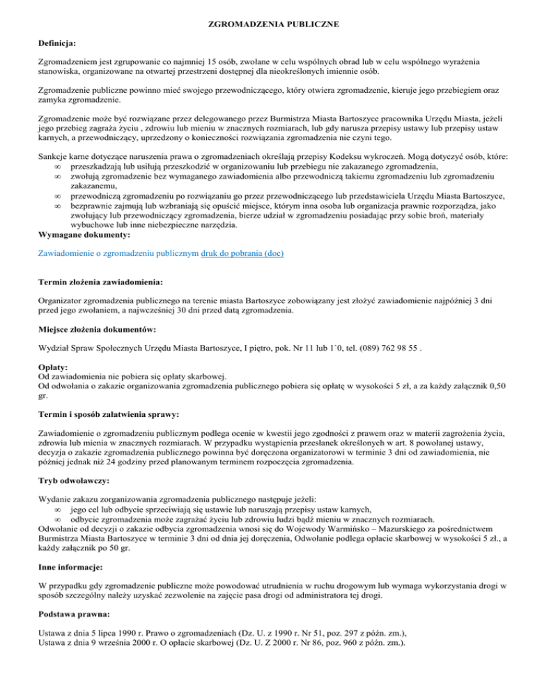 ZGROMADZENIA PUBLICZNE Definicja: Zgromadzeniem jest zgrupowanie co najmniej 15 osób, zwołane w celu wspólnych obrad lub w celu wspólnego wyrażenia stanowiska, organizowane na otwartej przestrzeni dostępnej dla nieokreślonych imiennie osób. Zgromadzenie publiczne powinno mieć swojego przewodniczącego, który otwiera zgromadzenie, kieruje jego przebiegiem oraz zamyka zgromadzenie. Zgromadzenie może być rozwiązane przez delegowanego przez Burmistrza Miasta Bartoszyce pracownika Urzędu Miasta, jeżeli jego przebieg zagraża życiu , zdrowiu lub mieniu w znacznych rozmiarach, lub gdy narusza przepisy ustawy lub przepisy ustaw karnych, a przewodniczący, uprzedzony o konieczności rozwiązania zgromadzenia nie czyni tego. Sankcje karne dotyczące naruszenia prawa o zgromadzeniach określają przepisy Kodeksu wykroczeń. Mogą dotyczyć osób, które: • przeszkadzają lub usiłują przeszkodzić w organizowaniu lub przebiegu nie zakazanego zgromadzenia, • zwołują zgromadzenie bez wymaganego zawiadomienia albo przewodniczą takiemu zgromadzeniu lub zgromadzeniu zakazanemu, • przewodniczą zgromadzeniu po rozwiązaniu go przez przewodniczącego lub przedstawiciela Urzędu Miasta Bartoszyce, • bezprawnie zajmują lub wzbraniają się opuścić miejsce, którym inna osoba lub organizacja prawnie rozporządza, jako zwołujący lub przewodniczący zgromadzenia, bierze udział w zgromadzeniu posiadając przy sobie broń, materiały wybuchowe lub inne niebezpieczne narzędzia. Wymagane dokumenty: Zawiadomienie o zgromadzeniu publicznym druk do pobrania (doc) Termin złożenia zawiadomienia: Organizator zgromadzenia publicznego na terenie miasta Bartoszyce zobowiązany jest złożyć zawiadomienie najpóźniej 3 dni przed jego zwołaniem, a najwcześniej 30 dni przed datą zgromadzenia. Miejsce złożenia dokumentów: Wydział Spraw Społecznych Urzędu Miasta Bartoszyce, I piętro, pok. Nr 11 lub 1`0, tel. (089) 762 98 55 . Opłaty: Od zawiadomienia nie pobiera się opłaty skarbowej. Od odwołania o zakazie organizowania zgromadzenia publicznego pobiera się opłatę w wysokości 5 zł, a za każdy załącznik 0,50 gr. Termin i sposób załatwienia sprawy: Zawiadomienie o zgromadzeniu publicznym podlega ocenie w kwestii jego zgodności z prawem oraz w materii zagrożenia życia, zdrowia lub mienia w znacznych rozmiarach. W przypadku wystąpienia przesłanek określonych w art. 8 powołanej ustawy, decyzja o zakazie zgromadzenia publicznego powinna być doręczona organizatorowi w terminie 3 dni od zawiadomienia, nie później jednak niż 24 godziny przed planowanym terminem rozpoczęcia zgromadzenia. Tryb odwoławczy: Wydanie zakazu zorganizowania zgromadzenia publicznego następuje jeżeli: • jego cel lub odbycie sprzeciwiają się ustawie lub naruszają przepisy ustaw karnych, • odbycie zgromadzenia może zagrażać życiu lub zdrowiu ludzi bądź mieniu w znacznych rozmiarach. Odwołanie od decyzji o zakazie odbycia zgromadzenia wnosi się do Wojewody Warmińsko – Mazurskiego za pośrednictwem Burmistrza Miasta Bartoszyce w terminie 3 dni od dnia jej doręczenia, Odwołanie podlega opłacie skarbowej w wysokości 5 zł., a każdy załącznik po 50 gr. Inne informacje: W przypadku gdy zgromadzenie publiczne może powodować utrudnienia w ruchu drogowym lub wymaga wykorzystania drogi w sposób szczególny należy uzyskać zezwolenie na zajęcie pasa drogi od administratora tej drogi. Podstawa prawna: Ustawa z dnia 5 lipca 1990 r. Prawo o zgromadzeniach (Dz. U. z 1990 r. Nr 51, poz. 297 z późn. zm.), Ustawa z dnia 9 września 2000 r. O opłacie skarbowej (Dz. U. Z 2000 r. Nr 86, poz. 960 z późn. zm.).