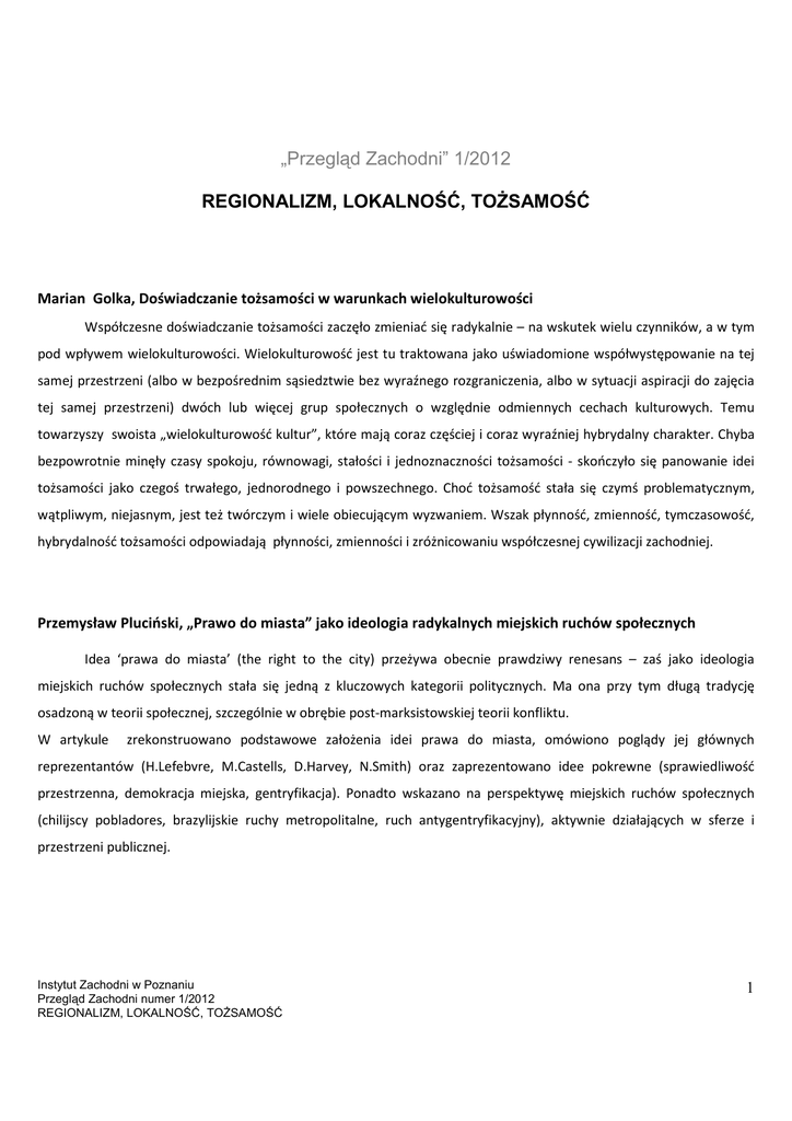 „Przegląd Zachodni” 1/2012 REGIONALIZM, LOKALNOŚĆ, TOŻSAMOŚĆ Marian Golka, Doświadczanie tożsamości w warunkach wielokulturowości Współczesne doświadczanie tożsamości zaczęło zmieniać się radykalnie – na wskutek wielu czynników, a w tym pod wpływem wielokulturowości. Wielokulturowość jest tu traktowana jako uświadomione współwystępowanie na tej samej przestrzeni (albo w bezpośrednim sąsiedztwie bez wyraźnego rozgraniczenia, albo w sytuacji aspiracji do zajęcia tej samej przestrzeni) dwóch lub więcej grup społecznych o względnie odmiennych cechach kulturowych. Temu towarzyszy swoista „wielokulturowość kultur”, które mają coraz częściej i coraz wyraźniej hybrydalny charakter. Chyba bezpowrotnie minęły czasy spokoju, równowagi, stałości i jednoznaczności tożsamości - skończyło się panowanie idei tożsamości jako czegoś trwałego, jednorodnego i powszechnego. Choć tożsamość stała się czymś problematycznym, wątpliwym, niejasnym, jest też twórczym i wiele obiecującym wyzwaniem. Wszak płynność, zmienność, tymczasowość, hybrydalność tożsamości odpowiadają płynności, zmienności i zróżnicowaniu współczesnej cywilizacji zachodniej. Przemysław Pluciński, „Prawo do miasta” jako ideologia radykalnych miejskich ruchów społecznych Idea ‘prawa do miasta’ (the right to the city) przeżywa obecnie prawdziwy renesans – zaś jako ideologia miejskich ruchów społecznych stała się jedną z kluczowych kategorii politycznych. Ma ona przy tym długą tradycję osadzoną w teorii społecznej, szczególnie w obrębie post-marksistowskiej teorii konfliktu. W artykule zrekonstruowano podstawowe założenia idei prawa do miasta, omówiono poglądy jej głównych reprezentantów (H.Lefebvre, M.Castells, D.Harvey, N.Smith) oraz zaprezentowano idee pokrewne (sprawiedliwość przestrzenna, demokracja miejska, gentryfikacja). Ponadto wskazano na perspektywę miejskich ruchów społecznych (chilijscy pobladores, brazylijskie ruchy metropolitalne, ruch antygentryfikacyjny), aktywnie działających w sferze i przestrzeni publicznej. Instytut Zachodni w Poznaniu Przegląd Zachodni numer 1/2012 REGIONALIZM, LOKALNOŚĆ, TOŻSAMOŚĆ 1 Robert Kmieciak, Formy samorządu korporacyjnego w Polsce – dwadzieścia lat doświadczeń państwa demokratycznego Jednym z największych osiągnięć procesu transformacji społeczno-politycznej w Polsce jest szeroka decentralizacja sfery władztwa publicznego. W znaczeniu prawa administracyjnego decentralizacja jest rozumiana jako system, w którym istnieje większa liczba samodzielnych ośrodków dysponujących kompetencjami publicznoprawnymi przy jednym centralnym. Decentralizacja to zatem procedura przekazywania zorganizowanym korporacyjnie grupom obywateli pewnych funkcji publicznych zastrzeżonych dotąd do kompetencji rządu centralnego. Przedmiotem zaprezentowanej w artykule analizy jest samorząd korporacyjny, którego podstawę stanowi związek osób o przymusowym charakterze członkostwa. Będący egzemplifikacją decentralizacji samorząd korporacyjny nie jest jednak pojęciem jednowymiarowym odnoszącym się wyłącznie do stosunków terytorialnych. Bardzo ważną rolę w systemie reprezentowania interesów określonych środowisk odgrywa także samorząd specjalny, który wyodrębnia się według innych kryteriów. Odpowiednio do tego podziału w ramach samorządu specjalnego wyróżniamy samorząd zawodowy i gospodarczy. W artykule starano się zwrócić uwagę na fakt, że sukces polskiej reformy samorządowej będzie pełny dopiero wówczas kiedy nastąpi harmonijny rozwój wszystkich form samorządu korporacyjnego, bez względu na charakter więzi łączących ich członków, których upodmiotowienie służyć będzie demokracji i umacnianiu społeczeństwa obywatelskiego. Paweł Antkowiak, Ewolucja samorządowej ordynacji wyborczej w Polsce w okresie transformacji systemowej Transformacja systemowa w Polsce zapoczątkowana w roku 1989 doprowadziła do powstania państwa prawa opierającego swój ustrój na zasadach demokratycznych, przy poszanowaniu podstawowych praw i wolności człowieka. Był to okres dynamicznych przemian systemowych, których integralną częścią było wprowadzenie samorządu terytorialnego, w obecnym kształcie. System wyborczy pełni w państwie demokratycznym bardzo istotną rolę w kształtowaniu życia politycznego, w tym również na poziomie lokalnym i regionalnym. Jednocześnie jest jednak tym elementem ustroju, który w bardzo łatwy sposób daje się wykorzystać do doraźnych celów politycznych, które niekoniecznie pokrywają się z celami demokratycznego państwa prawa. Doświadczenia sześciu dotychczasowych elekcji samorządowych pokazują, że samorządowa ordynacja wyborcza staje się bardzo często przedmiotem gry politycznej. Instytut Zachodni w Poznaniu Przegląd Zachodni numer 1/2012 REGIONALIZM, LOKALNOŚĆ, TOŻSAMOŚĆ 2 Piotr Cichocki, Jaka jest tożsamość wielkopolska? Artykuł ten podejmuje refleksję nad regionalną tożsamością Wielkopolski na trzech zazębiających się polach. W pierwszej kolejności scharakteryzowano dostępne wyniki badań sondażowych odnoszących się do poczucia więzi z regionem. Po drugie uwagę skupiono na problemie zasięgu oraz struktury tych więzi. W ostatniej części przeprowadzono dyskusję nad funkcjonalnością tożsamości wielkopolskiej względem wyzwań rozwojowych stających przed regionem. Przeprowadzone analizy prowadzą do przekonania, iż choć trudno zaprzeczyć istnieniu w świadomości społecznej Wielkopolan stosunkowo silnej więzi regionalnej, to jednocześnie wyraźna pozostaje treściowe ubóstwo oraz swoista amorficzność tych wyobrażeń. W tym sensie wyzwaniem dla dyskusji o regionalnej tożsamości nie jest w przypadku Wielkopolski diagnozowanie podzielanego przez mieszkańców subiektywnego autostereotypu, lecz odpowiedź na pytanie o możliwości wz