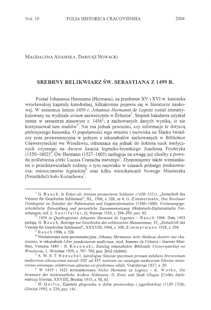 Vol. 10 FOLIA HISTORICA CRACOVIENSIA 2004 M a g d a l e n a A d a m s k a , D a r iu s z N o w a c k i SREBRNY RELIKWIARZ ŚW. SEBASTIANA Z 1499 R. Postać Johannesa Hermanna (Hermana), na przełomie XV i XVI w. kanonika wrocławskiej kapituły katedralnej, kilkakrotnie pojawia się w literaturze nauko wej. W semestrze letnim 1450 r. Johannes Hermanni de Legnitz został immatry kulowany na wydziale artium uniwersytetu w Erfurcie1. Stopień bakałarza uzyskał tamże w semestrze zimowym r. 14562; z zachowanych danych wynika, iż nie kontynuował tam studiów3. Nie ma jednak pewności, czy informacje te dotyczą późniejszego kanonika. O popularności tego imienia i nazwiska na Śląsku świad czy nota proweniencyjna w jednym z inkunabułów zachowanych w Bibliotece Uniwersyteckiej we Wrocławiu, odnosząca się jednak do doktora nauk medycz nych czynnego na dworze księcia legnicko-brzeskiego Joachima Fryderyka (1550-1602)4. Ów Hermann (1527-1605) zasługuje na uwagę już choćby z powo du poślubienia córki Lucasa Cranacha starszego5. Dysponujemy także wzmianka mi o przedstawicielach rodziny o tym nazwisku w czasach późnego średniowie cza: mieszczaninie legnickim6 oraz kilku mieszkańcach Nowego Miasteczka (Neustadtel) koło Kożuchowa7. 1 G. B a u c h , / « Erfurt als Artisten promovierte Schlesier (1450-1521), „Zeitschrift des Vereins für Geschichte Schlesiens”, XL, 1906, s. 326, nr 4; G. Z i m m e r m a n n , Das Breslauer D om kapitel im Zeitalter der Reformation und Gegenreformation (1500-1600). Verfassungsge schichtliche Entwicklung und persönliche Zusammensetzung (Historisch-Diplomatische For schungen, red. L. S a n t i f a 11 e r, 2), W eimar 1938, s. 294-295, poz. 82. 1456 in Quadragesima Johannes Hermann de Legenicz - B a u c h 1906. Datę 1455 podają: G. B a u c h , Beiträge zur Geschichte des schlesischen Humanismus, VI, „Zeitschrift des Vereins für Geschichte Schlesiens“, XXXVIII, 1904, s. 308; Z i m m e r m a n n 1938, s. 294. 3 B a u c h 1906, s. 326. 4 N iedatow ana nota proweniencyjna: Johanny Hermanno Artis Medicae doctori suo charissimo, w inkunabule Liber pandectarum medicinae, wyd. Joannes de Colonia i Joannes Manthen, V enezia 1480 - B. K o c o w s k i , K atalog inkunabułów Biblioteki Uniwersyteckiej we Wrocławiu, 1, Wrocław 1959, s. 797-798, poz. 2662 (dublet). 5 A. W. E. T. H e n s c h e 1, Iatrologiae Silesiae specimum prim um exhibens brevissimam medicorum silesiacorum saeculi XIII. ad XVI. notitiam cui catalogus medicorum Silesiae recentiorum eorumque celebriorum adiectus estprodrom us edidit, Vratislaviae 1837, s. 20. 6 W 1419 i 1423 wzmiankowany Niclos Hermann zu Legnicz - K. W u t k e , Die Inventare der nichtstaatliche Archive Schlesiens, II, Kreis und Stadt Glogau [Codex diplomaticus Silesiae, XXVIII], Breslau 1915, s. 58, 63. 7 H. G e r l i c , Kapituła głogowska w dobie piastowskiej i jagiellońskiej (1120-1526), Gliwice 1993, s. 238, poz. 141. 32 M agdalena Adamska, Dariusz Nowacki Dalsze informacje biograficzne już z całą pewnością dotyczą jednej osoby. Z końcem r. 1483 Hermann został obdarzony godnością kanonika wrocławskiej ka pituły katedralnej8; w 1484 odnotowano go jako uprawnionego do objęcia kanonii9. W marcu tego samego roku rozpoczął studia prawnicze w Rzymie10, co znalazło potwierdzenie w poświadczeniu od rektora tamtejszego uniwersytetu z 7 kwietnia 1484 r.1\ W ten sposób dostosował się do zalecenia biskupa wrocławskiego Rudolfa z Riidedesheim z 1481 r., który w trosce o podniesienie poziomu intelektualnego kanoników, zobligował ich do trzyletnich studiów uniwersyteckich12. W 1488 r. zapewne już od 1486 r. - Hermann używał tytułu doctor decretorum, z czego wnio skowano o jego dodatkowych studiach w Padwie13 lub Bolonii14 - najpewniej błęd nie. W 1491 r. notowany wśród kanoników kapituły przy kolegiacie głogowskiej, godność tę piastował zapewne dożywotnio1J. Pełnił też funkcję altarysty w kościele parafialnym w Legnicy16. W listopadzie 1491 r. zastąpił w Rzymie dotychczaso wych prokuratorów, reprezentując wrocławską kapitułę w sprawie, którą kanonik Oswald Straubinger (vel Winkler) wytoczył przed sądem papieskim biskupowi wro cławskiemu Johannowi Rothowi17. W r. 1496 objął funkcję kustosza wrocławskiej kapituły katedralnej18. W kwietniu 1503 r. został wpisany do księgi niemieckiego bractwa przy kościele Santa Maria dell’Anima w Rzymie19. W protokole posiedzenia wrocławskiej kapituły katedralnej z dnia 16 wrze śnia 1502 zapisano, iż Hermann podarował do katedry pięknie zdobiony reli kwiarz ręki św. Sebastiana ze złoconego srebra, z intencją zbawienia swej duszy oraz uczczenia relikwii świętego, od czasów biskupa Hieronima (ok. 1051-1062) przechowywanych w tutejszej katedrze. Jednocześnie poprosił kapitułę, aby usta nowiła święto św. Sebastiana (20 stycznia) jako dupliciter (z trzema lekcjami); zbierana podówczas ofiara miałaby zostać przeznaczona na stypendium dla scho larów. Kanonicy przyjęli dar z wdzięcznością i aby zadośćuczynić prośbie Her manna, obiecali współpracę z biskupem (Johannem Rothem), do którego należało 8 K. D o 1 a, Wrocławska kapituła katedralna w X V wieku, Lublin 1983, s. 355. 9 A. S a b i s c h , Acta Capituli Wratislaviensis 1500-1562. Die Sitzungsprotokolle des Breslauer Domkapitels in ersten Hälfte des 16. Jahrhunderts, I, 1500-1516, Köln 1972, s. LIX, poz. 16. 10 B a u c h 1904, s. 308; Z i m m e r m a n n 1938, s. 294; D o 1 a 1983, s. 355. 11 D o l a 1983, s. 355. 12 D o l a 1983, s. 140. 13 Z i m m e r m a n n 1938, s. 294. 14 Z i m m e r m a n n 1938. Johannes Hermanni Lignicensis pojawia się jako tamtejszy student między 1302 a 1305 r. - P. P f o t e n h a u e r , Schlesier a u f der Universität Bologna, „Zeitschrift des Vereins für Geschichte Schlesiens11, XXVIII, 1894, s. 437, nr 20. W przypisie do tej wzmianki autor określa Hermanna mianem: Decretorum doctor, custo