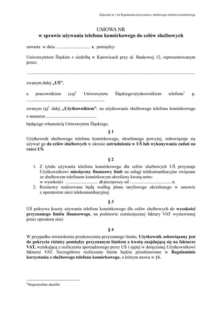 Załącznik nr 1 do Regulaminu korzystania z służbowego telefonu komórkowego UMOWA NR w sprawie używania telefonu komórkowego do celów służbowych zawarta w dniu …........................... r. pomiędzy: Uniwersytetem Śląskim z siedzibą w Katowicach przy ul. Bankowej 12, reprezentowanym przez: …................................................................................................................................................... zwanym dalej „UŚ”, a pracownikiem (cą)1 Uniwersytetu Śląskiego/użytkownikiem telefonu1 p. …........................................................ zwanym (ą)1 dalej „Użytkownikiem”, na użytkowanie służbowego telefonu komórkowego o numerze ............................................. będącego własnością Uniwersytetu Śląskiego. §1 Użytkownik służbowego telefonu komórkowego, określonego powyżej, zobowiązuje się używać go do celów służbowych w okresie zatrudnienia w UŚ lub wykonywania zadań na rzecz UŚ. §2 1. Z tytułu używania telefonu komórkowego dla celów służbowych UŚ przyznaje Użytkownikowi miesięczny finansowy limit na usługi telekomunikacyjne związane ze służbowym telefonem komórkowym określony kwotą netto: w wysokości …......................... zł począwszy od …................................. r. 2. Rozmowy realizowane będą według planu taryfowego określonego w umowie z operatorem sieci telekomunikacyjnej. §3 UŚ pokrywa koszty używania telefonu komórkowego dla celów służbowych do wysokości przyznanego limitu finansowego, na podstawie comiesięcznej faktury VAT wystawionej przez operatora sieci §4 W przypadku stwierdzenia przekroczenia przyznanego limitu, Użytkownik zobowiązany jest do pokrycia różnicy pomiędzy przyznanym limitem a kwotą znajdującą się na fakturze VAT, wynikającą z rozliczenia sporządzonego przez UŚ i ujętej w doręczonej Użytkownikowi fakturze VAT. Szczegółowe rozliczenie limitu będzie przedstawione w Regulaminie korzystania z służbowego telefonu komórkowego, o którym mowa w §6. 1 Niepotrzebne skreślić §5 Użytkownik, który jednocześnie jest pracownikiem UŚ, wyraża zgodę na potrącenie swojej odpłatności z tytułu korzystania z służbowego telefonu komórkowego, obliczonej zgodnie z §4, ze swojego wynagrodzenia za pracę i najwcześniej w terminie najbliższej jego wypłaty. §6 Użytkownik oświadcza, że zapoznał się i akceptuje Regulamin korzystania ze służbowego telefonu komórkowego, stanowiący załącznik nr 1 do zarządzenia Rektora nr … z dnia ……………… 2014 r. i zobowiązuje się do przestrzegania zasad w nim zawartych. §7 Użytkownik zobowiązuje się do niezwłocznego zawiadomienia na piśmie UŚ o utracie telefonu lub karty SIM pod rygorem obowiązku poniesienia wszystkich skutków finansowych z tym faktem związanych. §8 1. Umowa niniejsza może być rozwiązana w każdym czasie przez każdą ze stron w formie jednostronnego, pisemnego jej wypowiedzenia, skutecznego w terminie odebrania wypowiedzenia przez drugą stronę umowy. 2. W terminie rozwiązania umowy Użytkownik jest zobowiązany do zwrócenia UŚ telefonu wraz z kartą SIM pod rygorem bezskuteczności wypowiedzenia. §9 Użytkownik oświadcza, iż jest świadomy, iż od momentu przekazania telefonu jest odpowiedzialny za legalność oprogramowania, które będzie wykorzystywane na powierzonym mu telefonie. § 10 W sprawach nie uregulowanych postanowieniami niniejszej umowy mają zastosowanie przepisy Kodeksu cywilnego. § 11 Ewentualne spory z niniejszej umowy podlegają rozpatrzeniu przez właściwy rzeczowo Sąd Rejonowy w Katowicach. § 12 Umowę sporządzono w dwóch jednobrzmiących egzemplarzach, po jednym dla każdej ze stron. …......................................................... …......................................................... UŚ Użytkownik 2
