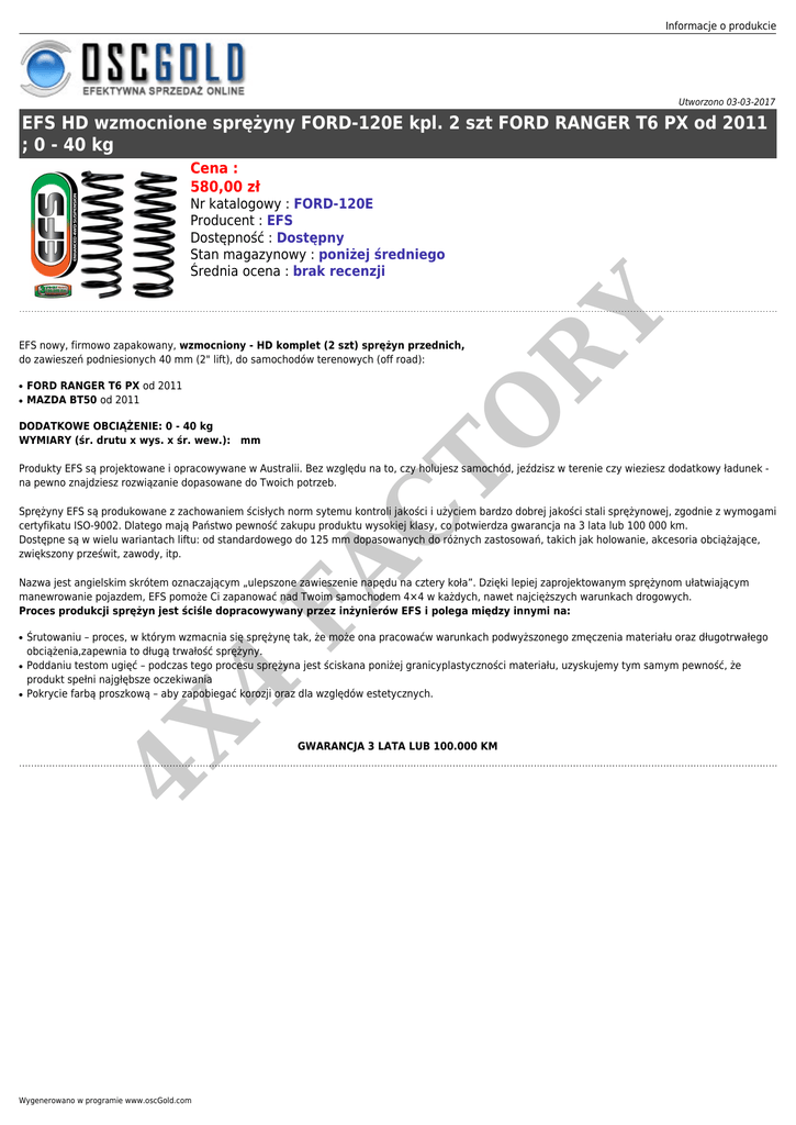 Informacje o produkcie Utworzono 03-03-2017 EFS HD wzmocnione sprężyny FORD-120E kpl. 2 szt FORD RANGER T6 PX od 2011 ; 0 - 40 kg Cena : 580,00 zł ● FORD RANGER T6 PX od 2011 MAZDA BT50 od 2011 DODATKOWE OBCIĄŻENIE: 0 - 40 kg WYMIARY (śr. drutu x wys. x śr. wew.): mm TO ● R EFS nowy, firmowo zapakowany, wzmocniony - HD komplet (2 szt) sprężyn przednich, do zawieszeń podniesionych 40 mm (2" lift), do samochodów terenowych (off road): Y Nr katalogowy : FORD-120E Producent : EFS Dostępność : Dostępny Stan magazynowy : poniżej średniego Średnia ocena : brak recenzji Produkty EFS są projektowane i opracowywane w Australii. Bez względu na to, czy holujesz samochód, jeździsz w terenie czy wieziesz dodatkowy ładunek na pewno znajdziesz rozwiązanie dopasowane do Twoich potrzeb. FA C Sprężyny EFS są produkowane z zachowaniem ścisłych norm sytemu kontroli jakości i użyciem bardzo dobrej jakości stali sprężynowej, zgodnie z wymogami certyfikatu ISO-9002. Dlatego mają Państwo pewność zakupu produktu wysokiej klasy, co potwierdza gwarancja na 3 lata lub 100 000 km. Dostępne są w wielu wariantach liftu: od standardowego do 125 mm dopasowanych do różnych zastosowań, takich jak holowanie, akcesoria obciążające, zwiększony prześwit, zawody, itp. Nazwa jest angielskim skrótem oznaczającym „ulepszone zawieszenie napędu na cztery koła”. Dzięki lepiej zaprojektowanym sprężynom ułatwiającym manewrowanie pojazdem, EFS pomoże Ci zapanować nad Twoim samochodem 4×4 w każdych, nawet najcięższych warunkach drogowych. Proces produkcji sprężyn jest ściśle dopracowywany przez inżynierów EFS i polega między innymi na: ● 4X ● Śrutowaniu – proces, w którym wzmacnia się sprężynę tak, że może ona pracowaćw warunkach podwyższonego zmęczenia materiału oraz długotrwałego obciążenia,zapewnia to długą trwałość sprężyny. Poddaniu testom ugięć – podczas tego procesu sprężyna jest ściskana poniżej granicyplastyczności materiału, uzyskujemy tym samym pewność, że produkt spełni najgłębsze oczekiwania Pokrycie farbą proszkową – aby zapobiegać korozji oraz dla względów estetycznych. 4 ● Wygenerowano w programie www.oscGold.com GWARANCJA 3 LATA LUB 100.000 KM