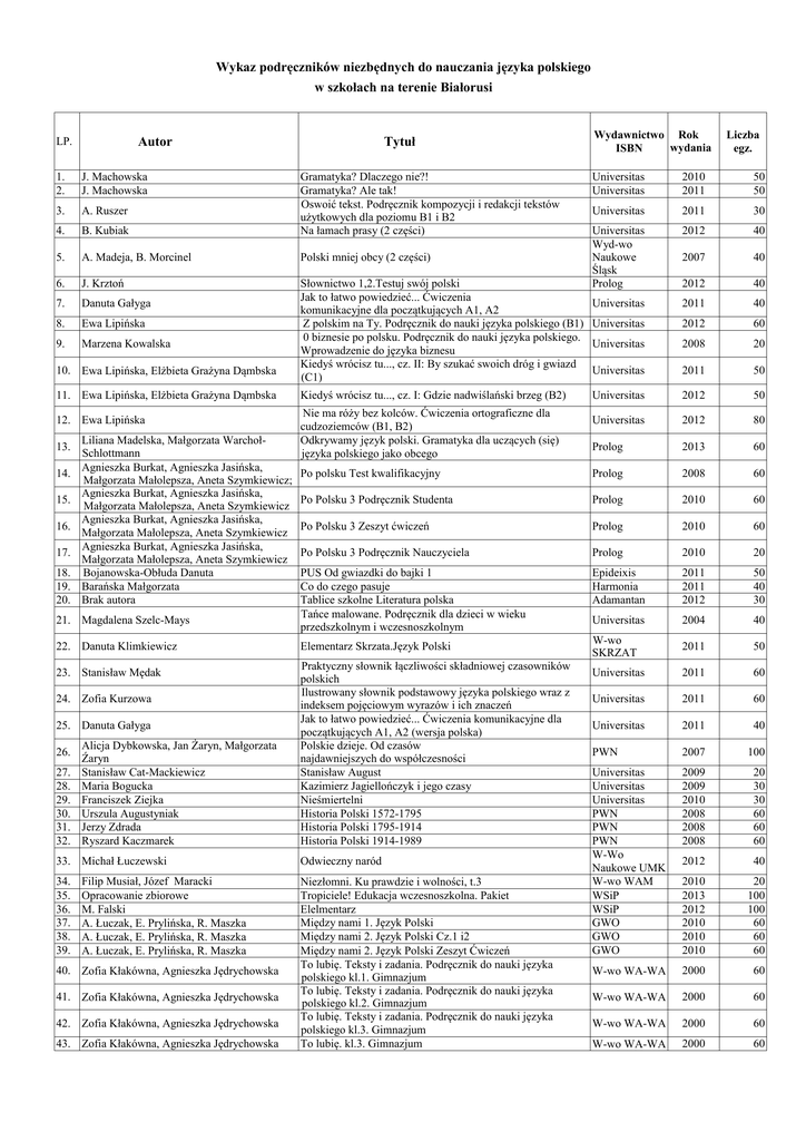 Wykaz podręczników niezbędnych do nauczania języka polskiego w szkołach na terenie Białorusi Tytuł Autor LP. 1. 2. J. Machowska J. Machowska 3. A. Ruszer 4. B. Kubiak Gramatyka? Dlaczego nie?! Gramatyka? Ale tak! Oswoić tekst. Podręcznik kompozycji i redakcji tekstów użytkowych dla poziomu B1 i B2 Na łamach prasy (2 części) 5. A. Madeja, B. Morcinel Polski mniej obcy (2 części) 6. J. Krztoń 7. Danuta Gałyga 8. Ewa Lipińska 9. Marzena Kowalska Słownictwo 1,2.Testuj swój polski Jak to łatwo powiedzieć... Ćwiczenia komunikacyjne dla początkujących A1, A2 Z polskim na Ty. Podręcznik do nauki języka polskiego (B1) 0 biznesie po polsku. Podręcznik do nauki języka polskiego. Wprowadzenie do języka biznesu Kiedyś wrócisz tu..., cz. II: By szukać swoich dróg i gwiazd (C1) 10. Ewa Lipińska, Elżbieta Grażyna Dąmbska 11. Ewa Lipińska, Elżbieta Grażyna Dąmbska 12. Ewa Lipińska 13. 14. 15. 16. 17. 18. 19. 20. Liliana Madelska, Małgorzata WarchołSchlottmann Agnieszka Burkat, Agnieszka Jasińska, Małgorzata Małolepsza, Aneta Szymkiewicz; Agnieszka Burkat, Agnieszka Jasińska, Małgorzata Małolepsza, Aneta Szymkiewicz Agnieszka Burkat, Agnieszka Jasińska, Małgorzata Małolepsza, Aneta Szymkiewicz Agnieszka Burkat, Agnieszka Jasińska, Małgorzata Małolepsza, Aneta Szymkiewicz Bojanowska-Obłuda Danuta Barańska Małgorzata Brak autora 21. Magdalena Szelc-Mays 22. Danuta Klimkiewicz 23. Stanisław Mędak 24. Zofia Kurzowa 25. Danuta Gałyga 26. 27. 28. 29. 30. 31. 32. Alicja Dybkowska, Jan Żaryn, Małgorzata Źaryn Stanisław Cat-Mackiewicz Maria Bogucka Franciszek Ziejka Urszula Augustyniak Jerzy Zdrada Ryszard Kaczmarek 33. Michał Łuczewski 34. 35. 36. 37. 38. 39. Filip Musiał, Józef Maracki Opracowanie zbiorowe M. Falski A. Łuczak, E. Prylińska, R. Maszka A. Łuczak, E. Prylińska, R. Maszka A. Łuczak, E. Prylińska, R. Maszka 40. Zofia Kłakówna, Agnieszka Jędrychowska 41. Zofia Kłakówna, Agnieszka Jędrychowska 42. Zofia Kłakówna, Agnieszka Jędrychowska 43. Zofia Kłakówna, Agnieszka Jędrychowska Wydawnictwo Rok wydania ISBN Liczba egz. Universitas Universitas 2010 2011 50 50 Universitas 2011 30 Universitas Wyd-wo Naukowe Śląsk Prolog 2012 40 2007 40 2012 40 Universitas 2011 40 Universitas 2012 60 Universitas 2008 20 Universitas 2011 50 Universitas 2012 50 Universitas 2012 80 Prolog 2013 60 Po polsku Test kwalifikacyjny Prolog 2008 60 Po Polsku 3 Podręcznik Studenta Prolog 2010 60 Po Polsku 3 Zeszyt ćwiczeń Prolog 2010 60 Po Polsku 3 Podręcznik Nauczyciela Prolog 2010 20 PUS Od gwiazdki do bajki 1 Co do czego pasuje Tablice szkolne Literatura polska Tańce malowane. Podręcznik dla dzieci w wieku przedszkolnym i wczesnoszkolnym Epideixis Harmonia Adamantan 2011 2011 2012 50 40 30 Universitas 2004 40 Elementarz Skrzata.Język Polski W-wo SKRZAT 2011 50 Universitas 2011 60 Universitas 2011 60 Universitas 2011 40 PWN 2007 100 Universitas Universitas Universitas PWN PWN PWN W-Wo Naukowe UMK W-wo WAM WSiP WSiP GWO GWO GWO 2009 2009 2010 2008 2008 2008 20 30 30 60 60 60 2012 40 2010 2013 2012 2010 2010 2010 20 100 100 60 60 60 W-wo WA-WA 2000 60 W-wo WA-WA 2000 60 W-wo WA-WA 2000 60 W-wo WA-WA 2000 60 Kiedyś wrócisz tu..., cz. I: Gdzie nadwiślański brzeg (B2) Nie ma róży bez kolców. Ćwiczenia ortograficzne dla cudzoziemców (B1, B2) Odkrywamy język polski. Gramatyka dla uczących (się) języka polskiego jako obcego Praktyczny słownik łączliwości składniowej czasowników polskich Ilustrowany słownik podstawowy języka polskiego wraz z indeksem pojęciowym wyrazów i ich znaczeń Jak to łatwo powiedzieć... Ćwiczenia komunikacyjne dla początkujących A1, A2 (wersja polska) Polskie dzieje. Od czasów najdawniejszych do współczesności Stanisław August Kazimierz Jagiellończyk i jego czasy Nieśmiertelni Historia Polski 1572-1795 Historia Polski 1795-1914 Historia Polski 1914-1989 Odwieczny naród Niezłomni. Ku prawdzie i wolności, t.3 Tropiciele! Edukacja wczesnoszkolna. Pakiet Elelmentarz Między nami 1. Język Polski Między nami 2. Język Polski Cz.1 i2 Między nami 2. Język Polski Zeszyt Ćwiczeń To lubię. Teksty i zadania. Podręcznik do nauki języka polskiego kl.1. Gimnazjum To lubię. Teksty i zadania. Podręcznik do nauki języka polskiego kl.2. Gimnazjum To lubię. Teksty i zadania. Podręcznik do nauki języka polskiego kl.3. Gimnazjum To lubię. kl.3. Gimnazjum