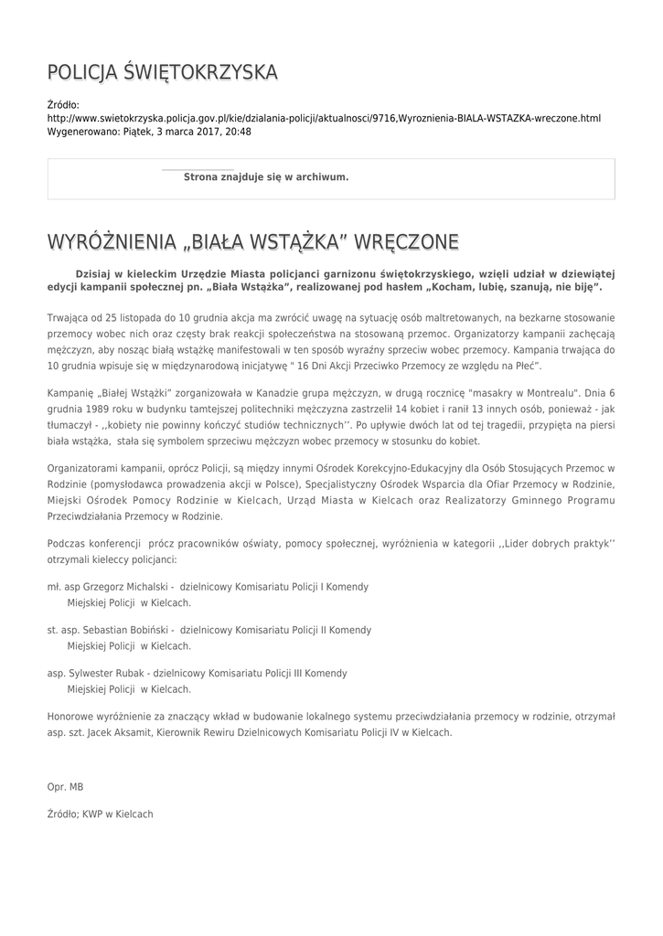 POLICJA ŚWIĘTOKRZYSKA Źródło: http://www.swietokrzyska.policja.gov.pl/kie/dzialania-policji/aktualnosci/9716,Wyroznienia-BIALA-WSTAZKA-wreczone.html Wygenerowano: Piątek, 3 marca 2017, 20:48 Strona znajduje się w archiwum. WYRÓŻNIENIA „BIAŁA WSTĄŻKA” WRĘCZONE Dzisiaj w kieleckim Urzędzie Miasta policjanci garnizonu świętokrzyskiego, wzięli udział w dziewiątej edycji kampanii społecznej pn. „Biała Wstążka”, realizowanej pod hasłem „Kocham, lubię, szanują, nie biję”. Trwająca od 25 listopada do 10 grudnia akcja ma zwrócić uwagę na sytuację osób maltretowanych, na bezkarne stosowanie przemocy wobec nich oraz częsty brak reakcji społeczeństwa na stosowaną przemoc. Organizatorzy kampanii zachęcają mężczyzn, aby nosząc białą wstążkę manifestowali w ten sposób wyraźny sprzeciw wobec przemocy. Kampania trwająca do 10 grudnia wpisuje się w międzynarodową inicjatywę " 16 Dni Akcji Przeciwko Przemocy ze względu na Płeć”. Kampanię „Białej Wstążki” zorganizowała w Kanadzie grupa mężczyzn, w drugą rocznicę "masakry w Montrealu". Dnia 6 grudnia 1989 roku w budynku tamtejszej politechniki mężczyzna zastrzelił 14 kobiet i ranił 13 innych osób, ponieważ - jak tłumaczył - ,,kobiety nie powinny kończyć studiów technicznych’’. Po upływie dwóch lat od tej tragedii, przypięta na piersi biała wstążka, stała się symbolem sprzeciwu mężczyzn wobec przemocy w stosunku do kobiet. Organizatorami kampanii, oprócz Policji, są między innymi Ośrodek Korekcyjno-Edukacyjny dla Osób Stosujących Przemoc w Rodzinie (pomysłodawca prowadzenia akcji w Polsce), Specjalistyczny Ośrodek Wsparcia dla Ofiar Przemocy w Rodzinie, Miejski Ośrodek Pomocy Rodzinie w Kielcach, Urząd Miasta w Kielcach oraz Realizatorzy Gminnego Programu Przeciwdziałania Przemocy w Rodzinie. Podczas konferencji prócz pracowników oświaty, pomocy społecznej, wyróżnienia w kategorii ,,Lider dobrych praktyk’’ otrzymali kieleccy policjanci: mł. asp Grzegorz Michalski - dzielnicowy Komisariatu Policji I Komendy Miejskiej Policji w Kielcach. st. asp. Sebastian Bobiński - dzielnicowy Komisariatu Policji II Komendy Miejskiej Policji w Kielcach. asp. Sylwester Rubak - dzielnicowy Komisariatu Policji III Komendy Miejskiej Policji w Kielcach. Honorowe wyróżnienie za znaczący wkład w budowanie lokalnego systemu przeciwdziałania przemocy w rodzinie, otrzymał asp. szt. Jacek Aksamit, Kierownik Rewiru Dzielnicowych Komisariatu Policji IV w Kielcach. Opr. MB Źródło; KWP w Kielcach Ocena: 5/5 (2) Tweetnij