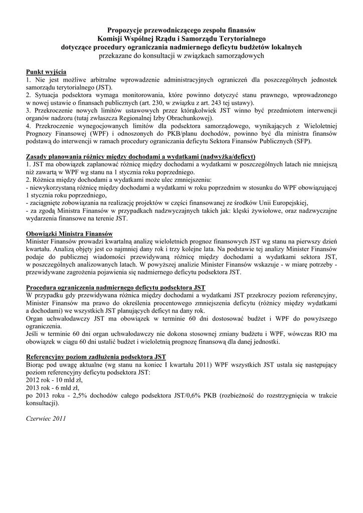 Propozycje przewodniczącego zespołu finansów Komisji Wspólnej Rządu i Samorządu Terytorialnego dotyczące procedury ograniczania nadmiernego deficytu budżetów lokalnych przekazane do konsultacji w związkach samorządowych Punkt wyjścia 1. Nie jest możliwe arbitralne wprowadzenie administracyjnych ograniczeń dla poszczególnych jednostek samorządu terytorialnego (JST). 2. Sytuacja podsektora wymaga monitorowania, które powinno dotyczyć stanu prawnego, wprowadzonego w nowej ustawie o finansach publicznych (art. 230, w związku z art. 243 tej ustawy). 3. Przekroczenie nowych limitów ustawowych przez którąkolwiek JST winno być przedmiotem interwencji organów nadzoru (tutaj zwłaszcza Regionalnej Izby Obrachunkowej). 4. Przekroczenie wynegocjowanych limitów dla podsektora samorządowego, wynikających z Wieloletniej Prognozy Finansowej (WPF) i odnoszonych do PKB/planu dochodów, powinno być dla ministra finansów podstawą do interwencji w ramach procedury ograniczania deficytu Sektora Finansów Publicznych (SFP). Zasady planowania różnicy między dochodami a wydatkami (nadwyżka/deficyt) 1. JST ma obowiązek zaplanować różnicę między dochodami a wydatkami w poszczególnych latach nie mniejszą niż zawartą w WPF wg stanu na 1 stycznia roku poprzedniego. 2. Różnica między dochodami a wydatkami może ulec zmniejszeniu: - niewykorzystaną różnicę między dochodami a wydatkami w roku poprzednim w stosunku do WPF obowiązującej 1 stycznia roku poprzedniego, - zaciągnięte zobowiązania na realizację projektów w części finansowanej ze środków Unii Europejskiej, - za zgodą Ministra Finansów w przypadkach nadzwyczajnych takich jak: klęski żywiołowe, oraz nadzwyczajne wydarzenia finansowe na terenie JST. Obowiązki Ministra Finansów Minister Finansów prowadzi kwartalną analizę wieloletnich prognoz finansowych JST wg stanu na pierwszy dzień kwartału. Analizą objęty jest co najmniej dany rok i trzy kolejne lata. Na podstawie tej analizy Minister Finansów podaje do publicznej wiadomości przewidywaną różnicę między dochodami a wydatkami sektora JST, w poszczególnych analizowanych latach. W powyższej analizie Minister Finansów wskazuje - w miarę potrzeby przewidywane zagrożenia pojawienia się nadmiernego deficytu podsektora JST. Procedura ograniczenia nadmiernego deficytu podsektora JST W przypadku gdy przewidywana różnica między dochodami a wydatkami JST przekroczy poziom referencyjny, Minister Finansów ma prawo do określenia procentowego zmniejszenia deficytu (różnicy między wydatkami a dochodami) we wszystkich JST planujących deficyt na dany rok. Organ uchwałodawczy JST ma obowiązek w terminie 60 dni dostosować budżet i WPF do powyższego ograniczenia. Jeśli w terminie 60 dni organ uchwałodawczy nie dokona stosownej zmiany budżetu i WPF, wówczas RIO ma obowiązek w ciągu 60 dni ustalić budżet i wieloletnią prognozę finansową dla danej jednostki. Referencyjny poziom zadłużenia podsektora JST Biorąc pod uwagę aktualne (wg stanu na koniec I kwartału 2011) WPF wszystkich JST ustala się następujący poziom referencyjny deficytu podsektora JST: 2012 rok - 10 mld zł, 2013 rok - 6 mld zł, po 2013 roku - 2,5% dochodów całego podsektora JST/0,6% PKB (rozbieżność do rozstrzygnięcia w trakcie konsultacji). Czerwiec 2011