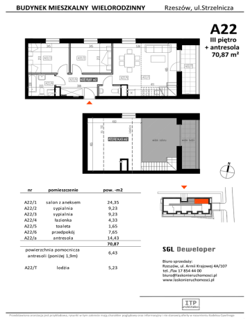 nr pomieszczenie pow. -m2 A22/1 A22/2 A22/3 A22/4 A22/5 A22/6 A22/a salon z aneksem sypialnia sypialnia łazienka toaleta przedpokój antresola 24,35 9,23 9,23 4,33 1,65 7,65 14,43 70,87 powierzchnia pomocnicza antresoli (poniżej 1,9m) 6,43 A22/T 5,23 lodżia