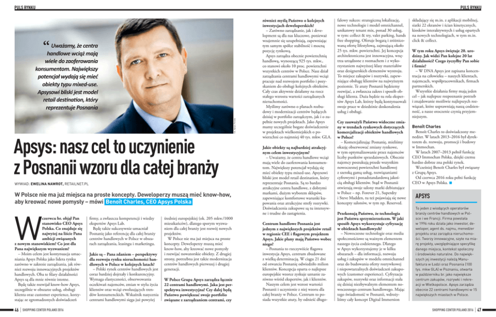 PULS RYNKU PULS RYNKU Uważamy, że centra “handlowe wciąż mają fot. Apsys Polska wiele do zaoferowania konsumentom. Największy potencjał wydają się mieć obiekty typu mixed-use. Apsysowi bliski jest model retail destination, który reprezentuje Posnania Apsys: nasz cel to uczynienie z Posnanii wzoru dla całej branży WYWIAD: EWELINA NAWROT, RETAILNET.PL W Polsce nie ma już miejsca na proste koncepty. Deweloperzy muszą mieć know-how, aby kreować nowe pomysły – mówi Benoît Charles, CEO Apsys Polska W czerwcu br. objął Pan stanowisko CEO Apsys Polska. Co znajduje się najwyżej na liście Pana ambicji związanych z nowym stanowiskiem? Co jest dla Pana największym wyzwaniem? – Moim celem jest kontynuacja umacniania Apsys Polska jako lidera rynku zarówno w zakresie zarządzania, jak również rozwoju innowacyjnych projektów handlowych. Oba te filary działalności Apsys są dla mnie równie istotne. Będę także rozwijał know-how Apsys, szczególnie w obszarze usług, obsługi klienta oraz customer experience, korzystając ze zgromadzonych doświadczeń 46 SHOPPING CENTER POLAND 2016 firmy, a zwłaszcza kompetencji i wiedzy ekspertów Apsys Lab. Będę także sukcesywnie umacniał Posnanię jako referencję dla całej branży centrów handlowych w Polsce w obszarach zarządzania, leasingu i marketingu. Jakie są – Pana zdaniem – perspektywy dla rozwoju rynku nieruchomości handlowych w Polsce w kolejnych latach? – Polski rynek centrów handlowych jest coraz bardziej dojrzały i konkurencyjny. Wymaga elastyczności, obserwowania oczekiwań najemców, zmian w stylu życia klientów oraz wciąż ewoluujących trendów konsumenckich. Wskaźnik nasycenia centrami handlowymi sięga już powyżej średniej europejskiej (ok. 205 mkw./1000 mieszkańców), dlatego sporym wyzwaniem dla całej branży jest rozwój nowych projektów. W Polsce nie ma już miejsca na proste koncepty. Deweloperzy muszą mieć know-how, aby kreować nowe pomysły i rozwijać nowatorskie obiekty. Z drugiej strony, potrzebna jest także modernizacja centrów handlowych pierwszej i drugiej generacji. W Polsce Grupa Apsys zarządza łącznie 22 centrami handlowymi. Jaka jest perspektywa inwestycyjna? Czy dalej będą Państwo powiększać swoje portfolio związane z zarządzaniem centrami, czy również myślą Państwo o kolejnych inwestycjach deweloperskich? – Zarówno zarządzanie, jak i development są dla nas kluczowe, ponieważ wzajemnie się uzupełniają, zapewniając tym samym spółce stabilność i mocną pozycję rynkową. Apsys zarządza obecnie powierzchnią handlową, wynoszącą 925 tys. mkw., co stanowi około 10 proc. powierzchni wszystkich centrów w Polsce. Nasz dział zarządzania centrami handlowymi wciąż pracuje nad rozwojem portfolio i pozyskaniem do obsługi kolejnych obiektów. Cały czas aktywnie działamy na rzecz stałego wzrostu wartości zarządzanych nieruchomości. Myślimy zarówno o planach rozbudowy i modernizacji centrów będących dzisiaj w portfolio zarządczym, jak i o zupełnie nowych projektach. Jako Apsys mamy szczególnie bogate doświadczenie w projektach wielkomiejskich o powierzchni co najmniej 40 tys. mkw. GLA. Jakie obiekty są najbardziej atrakcyjnym celem inwestycyjnym? – Uważamy, że centra handlowe wciąż mają wiele do zaoferowania konsumentom. Największy potencjał wydają się mieć obiekty typu mixed-use. Apsysowi bliski jest model retail destination, który reprezentuje Posnania. Są to bardzo atrakcyjne centra handlowe, z dobrymi markami, dużym wyborem sklepów, zapewniające komfortowe warunki kupowania oraz atrakcyjne strefy rozrywki. Doświadczenia zakupowe są tu intensywne i trudne do zastąpienia. Centrum handlowe Posnania jest jednym z największych projektów retail w regionie CEE i flagowym projektem Apsys. Jakie plany mają Państwo wobec niego? – Posnania to rzeczywiście flagowa inwestycja Apsys, centrum zbudowane z wielką determinacją. W ciągu 21 dni od otwarcia Posnanię odwiedziło milion klientów. Koncepcja oparta o najlepsze europejskie wzorce zyskuje uznanie zarówno wśród ekspertów, jak i klientów. Naszym celem jest wzrost wartości Posnanii i uczynienie z niej wzoru dla całej branży w Polsce. Centrum to posiada wszystkie atuty, by odnieść długo- falowy sukces: strategiczną lokalizację, nowe technologie i model omnichannel, unikatowy tenant mix, ponad 30 usług, w tym: collect & try, valet parking, hands free shopping. Oferuje bogatą i zróżnicowaną ofertę lifestylową, zajmującą około 25 tys. mkw. powierzchni. Jej koncepcja architektoniczna jest innowacyjna, wnętrza urządzone z rozmachem i z wykorzystaniem najwyższej klasy materiałów oraz designerskich elementów wystroju. To miejsce zakupów i rozrywki, zapewniające obsługę klientów na najwyższym poziomie. Te atuty Posnanii będziemy rozwijać, a zwłaszcza zakres i sposób obsługi klienta. Duża będzie tu rola ekspertów Apsys Lab, którzy będą kontynuowali swoje prace w dziedzinie doskonalenia usług i obsługi. Czy zauważyli Państwo widoczne zmiany w trendach rynkowych dotyczących komercjalizacji obiektów handlowych w Polsce? – Komercjalizując Posnanię, mieliśmy okazję obserwować zmiany rynkowe, w tym optymalizowanie przez najemców liczby punktów sprzedażowych. Obecnie najemcy poszukują przede wszystkim nowoczesnej powierzchni handlowej z szeroką gamą usług, rozwiązaniami cyfrowymi i ponadstandardową jakością obsługi klientów. Stąd w Posnanii otwierają swoje salony marki debiutujące w Polsce – np. Forever 21, Superdry i Steve Madden, tu też pojawiają się nowe koncepty salonów, w tym np. Reserved. Przekonują Państwo, że technologia jest Państwa sprzymierzeńcem. W jaki sposób Apsys wykorzystuje cyfryzację w obiektach handlowych? – Nowoczesne technologie oraz media społecznościowe są ważnym elementem naszego życia codziennego. Dlatego w Apsys wykorzystujemy je w kilku obsz