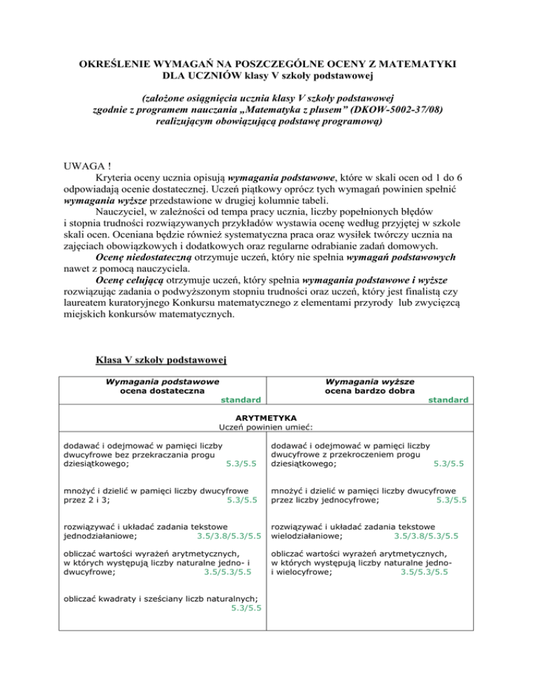 OKREŚLENIE WYMAGAŃ NA POSZCZEGÓLNE OCENY Z MATEMATYKI DLA UCZNIÓW klasy V szkoły podstawowej (założone osiągnięcia ucznia klasy V szkoły podstawowej zgodnie z programem nauczania „Matematyka z plusem” (DKOW-5002-37/08) realizującym obowiązującą podstawę programową) UWAGA ! Kryteria oceny ucznia opisują wymagania podstawowe, które w skali ocen od 1 do 6 odpowiadają ocenie dostatecznej. Uczeń piątkowy oprócz tych wymagań powinien spełnić wymagania wyższe przedstawione w drugiej kolumnie tabeli. Nauczyciel, w zależności od tempa pracy ucznia, liczby popełnionych błędów i stopnia trudności rozwiązywanych przykładów wystawia ocenę według przyjętej w szkole skali ocen. Oceniana będzie również systematyczna praca oraz wysiłek twórczy ucznia na zajęciach obowiązkowych i dodatkowych oraz regularne odrabianie zadań domowych. Ocenę niedostateczną otrzymuje uczeń, który nie spełnia wymagań podstawowych nawet z pomocą nauczyciela. Ocenę celującą otrzymuje uczeń, który spełnia wymagania podstawowe i wyższe rozwiązując zadania o podwyższonym stopniu trudności oraz uczeń, który jest finalistą czy laureatem kuratoryjnego Konkursu matematycznego z elementami przyrody lub zwycięzcą miejskich konkursów matematycznych. Klasa V szkoły podstawowej Wymagania podstawowe ocena dostateczna Wymagania wyŜsze ocena bardzo dobra standard standard ARYTMETYKA Uczeń powinien umieć: dodawać i odejmować w pamięci liczby dwucyfrowe bez przekraczania progu dziesiątkowego; 5.3/5.5 dodawać i odejmować w pamięci liczby dwucyfrowe z przekroczeniem progu dziesiątkowego; 5.3/5.5 mnożyć i dzielić w pamięci liczby dwucyfrowe przez 2 i 3; 5.3/5.5 mnożyć i dzielić w pamięci liczby dwucyfrowe przez liczby jednocyfrowe; 5.3/5.5 rozwiązywać i układać zadania tekstowe jednodziałaniowe; 3.5/3.8/5.3/5.5 rozwiązywać i układać zadania tekstowe wielodziałaniowe; 3.5/3.8/5.3/5.5 obliczać wartości wyrażeń arytmetycznych, w których występują liczby naturalne jedno- i dwucyfrowe; 3.5/5.3/5.5 obliczać wartości wyrażeń arytmetycznych, w których występują liczby naturalne jednoi wielocyfrowe; 3.5/5.3/5.5 obliczać kwadraty i sześciany liczb naturalnych; 5.3/5.5 zaznaczać liczby na osi liczbowej i odczytywać współrzędne punktów na osi; 3.6/5.5 zapisywać i odczytywać liczby do miliona; 3.6/5.3/5.5 zapisywać i odczytywać liczby do miliarda; 3.6/5.3/5.5 porównywać liczby naturalne, posługując się znakami < i > 3.6/5.5 zapisywać i odczytywać liczby naturalne w systemie rzymskim do 100 3.6/5.5 zapisywać i odczytywać liczby naturalne w systemie rzymskim do 4000; 3.6/5.5 posługiwać się zegarem i kalendarzem; 3.1/5.3/5.5 dodawać i odejmować liczby naturalne sposobem pisemnym; 3.6/5.3/5. mnożyć i dzielić liczby naturalne sposobem pisemnym przez liczby jednocyfrowe i dwucyfrowe 5.3/5.5 zamieniać jednostki typu 5 m = 500 m, 7 kg = 7000 g 5.3/5.5 zapisywać wielokrotności liczb i znajdować dzielniki liczb dwucyfrowych 3.6 rozpoznawać (bez dzielenia): liczby podzielne przez 2,3, 4, 5, 9, 10, 25, 100 3.6 rozpoznawać liczby złożone i liczby pierwsze 5.5 porównać dwie liczby całkowite 5.3/5.5 zaznaczać na osi liczbowej liczby całkowite i odczytywać współrzędne punktów 5.3/5.5 dodawać i odejmować dwie liczby całkowite 5.3/5.5 opisywać części figury za pomocą ułamka 5.3/5.5 porównywać dwa ułamki o liczniku 1 oraz dwa ułamki o jednakowych mianownikach 5.5 skracać i rozszerzać proste przykłady ułamków 5.5 porównywać dwa ułamki zwykłe 5.5 zapisywać ułamki w postaci nieskracalnej 5.5 sprowadzać ułamki do wspólnego mianownika 5.5 zamieniać liczbę mieszaną na ułamek niewłaściwy i odwrotnie 5.5 dodawać i odejmować kilka liczb całkowitych 5.3/5.5 zaznaczać ułamki zwykłe i liczby mieszane na osi liczbowej 5.5 dodawać, odejmować, mnożyć i dzielić ułamki zwykłe i liczby mieszane 5.3/5.5 zamieniać ułamki dziesiętne na zwykłe 5.3/5.5 zamienić ułamki zwykłe o mianownikach 2, 4, 5, 25 itp. na ułamki dziesiętne 5.3/5.5 porównywać dwa ułamki dziesiętne o tej samej 5.5 liczbie cyfr po przecinku zamieniać jednostki – przykłady typu 1 cm = 0,01 m, 35 g – 0,035 kg, 125 g = 0,125 kg 5.3/5.5 dodawać i odejmować w pamięci ułamki dziesiętne w przykładach typu 0,2 + 0,3, 1,7 – 0,6; 5.3/5.5 dodawać i odejmować ułamki dziesiętne 5.3/5.5 sposobem pisemnym; mnożyć ułamki dziesiętne 5.3/5.5 dzielić ułamek dziesiętny przez liczbę naturalną 5.3/5.5 dzielić ułamek dziesiętny przez ułamek dziesiętny 5.3/5.5 obliczać wartości wyrażeń jednodziałaniowych, w których występują jednocześnie ułamki zwykłe i dziesiętne 5.3/5.5 obliczać wartości wyrażeń wielodziałaniowych, w których występują jednocześnie ułamki zwykłe i dziesiętne 5.3/5.5 ELEMENTY ALGEBRY Uczeń powinien umieć; rozwiązywać równania typu x + 53 = 85, 3 x = 21( zgadując rozwiązania); 3.5/5.5 GEOMETRIA Uczeń powinien umieć: rozpoznawać proste i odcinki prostopadłe i równoległe; 5.5 rysować proste prostopadłe za pomocą ekierki; 5.5 rysować proste równoległe za pomocą linijki i ekierki; 5.5 mierzyć kąty i rysować kąty o zadanej mierze; 5.5 rozpoznawać i rysować za pomocą ekierki prostokąty i kwadraty; 3.6/5.5 rysować okrąg o danym promieniu i danej 5.5 średnicy; obliczać na podstawie mapy i planu rzeczywiste 3.5/5.3/5.5 odległości; rysować odcinki i prostokąty w skali 1: 1, 2 : 1, 1 : 2; 5.5 obliczać obwody trójkątów i czworokątów 5.3/5.5 obliczać miary kątów trójkąta, gdy dane są miary dwóch katów lub gdy dana jest miara jednego kata w trójkącie równoramiennym 5.5 obliczać pola trójkąta i czworokątów; 5.3/5.5 zamieniać jednostki pola 5.3/5.5 obliczać długości boków lub wysokości trójkątów, gdy dane jest pole i jedna z wysokości 5.3/5.5 rysować siatkę prostopadłościanu lub graniastosłupa prostego o podstaw