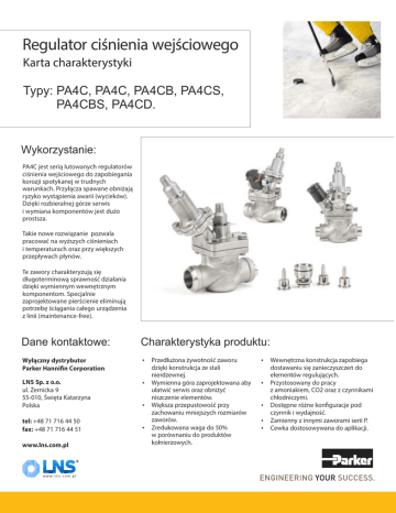 Regulator ciśnienia wejściowego Karta charakterystyki Typy: PA4C, PA4C, PA4CB, PA4CS, PA4CBS, PA4CD. Wykorzystanie: PA4C jest serią lutowanych regulatorów ciśnienia wejściowego do zapobiegania korozji spotykanej w trudnych warunkach. Przyłącza spawane obniżają ryzyko wystąpienia awarii (wycieków). Dzięki rozbieralnej górze serwis i wymiana komponentów jest dużo prostsza. Takie nowe rozwiązanie pozwala pracować na wyższych ciśnieniach i temperaturach oraz przy większych przepływach płynów. Te zawory charakteryzują się długoterminową sprawność działania dzięki wymiennym wewnętrznym komponentom. Specjalnie zaprojektowane pierścienie eliminują potrzebę ściągania całego urządzenia z linii (maintenance-free). Dane kontaktowe: Charakterystyka produktu: Wyłączny dystrybutor Parker Hanni n Corporation ź LNS Sp. z o.o. ul. Żernicka 9 55-010, Święta Katarzyna Polska ź ź tel: +48 71 716 44 50 fax: +48 71 716 44 51 ź www.lns.com.pl Przedłużona żywotność zaworu dzięki konstrukcja ze stali nierdzewnej. Wymienna góra zaprojektowana aby ułatwić serwis oraz obniżyć niszczenie elementów. Większa przepustowość przy zachowaniu mniejszych rozmiarów zaworów. Zredukowana waga do 50% w porównaniu do produktów kołnierzowych. ź ź ź ź ź Wewnętrzna konstrukcja zapobiega dostawaniu się zanieczyszczeń do elementów regulujących. Przystosowany do pracy z amoniakiem, CO2 oraz z czynnikami chłodniczymi. Dostępne różne kon guracje pod czynnik i wydajność. Zamienny z innymi zaworami serii P. Cewka dostosowywana do aplikacji. ź Zakres temperatury cieczy: -60°C do 120°C (-76°F do 248°F) ź Zakres temperatury otoczenia: -60°C do 71°C (-76°F do 160°F) ź Maksymalne ciśnienie pracy: 52 barg (754 psig) ź Minimalny spadek ciśnienia: 0.14 barg (2 psig) ź Przyłącza: 25 1” mm inch 25 1” KV CV 12.0 14.0 Typy przyłączy oraz rozmiary: mm inch 25 1” SW, BW SS ANSI 3 ⁄ 4”, 1”, 1 1 ⁄ 4” BW DIN 20, 25, 32 ź Zakres regulacji ciśnienia: Zakres A: 0.35 – 8.3 barg (5 – 120 psig) ź Maksymalna Różnica (MOPD) 20.7 bard (300 psid) ź Waga: Typ kg lbs PA4C 5.1 11.2 PA4CS 6.0 13.2 PA4CB 6.0 13.2 PA4CBS 6.4 14.0 PA4CD 7.2 15.8 PA4CZ 5.6 12.3 Napięcie cewki: 100 – 110V AC/60 Hz, 100V AC/50 Hz 120V AC/60 Hz, 110V AC/50 Hz 200 – 220V AC/60 Hz, 200V AC/50 Hz 208 – 240V AC/60 Hz 240V AC/60 Hz, 220V AC/50 Hz * Przyłącze 25mm (1’’) jest dostępne w standardzie, 75% zredukowana, 50% zredukowana oraz 25% zredukowana wtyczka. ▶ Przyłącze ź PA4CZ: Regulator Ciśnienia Wejściowego PA4CB: Regulator Ciśnienia Wejściowego z elektrycznym Bypassem PA4CS: Regulator Ciśnienia Wejściowego z elektrycznym zamknięciem ▶ ź PA4C: Regulator Ciśnienia Wejściowego Współczynnik przepływu: ▶ ź inch (1) ▶ mm ▶ Dane techniczne PA4CD: Podwójny Regulator Ciśnienia Wejściowego DS-PA4C-050114-EN