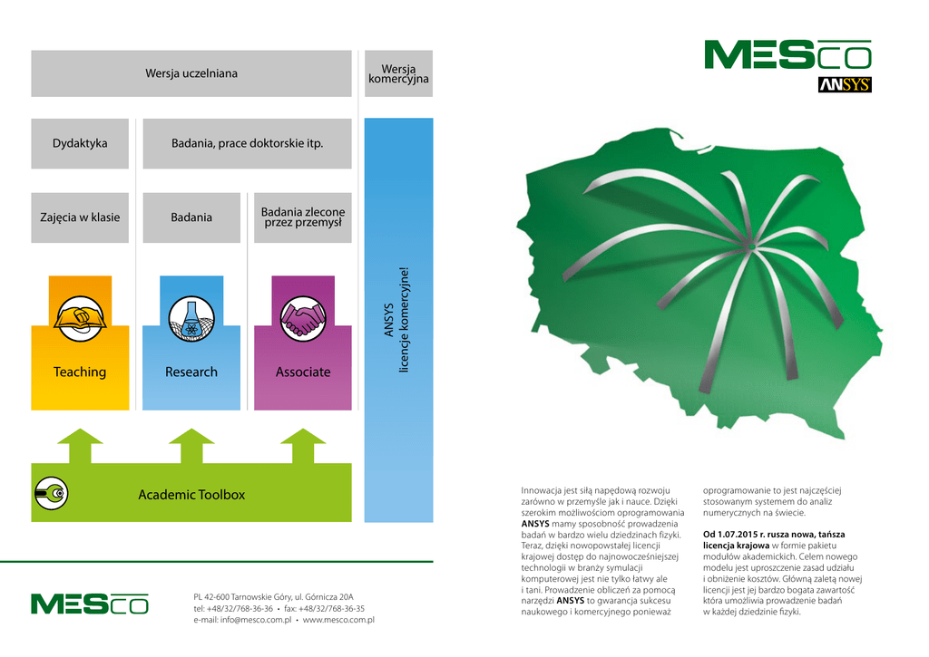 Wersja komercyjna Wersja uczelniana Badania, prace doktorskie itp. Zajęcia w klasie Badania Badania zlecone przez przemysł Teaching Research Associate Academic Toolbox PL 42-600 Tarnowskie Góry, ul. Górnicza 20A tel: +48/32/768-36-36 • fax: +48/32/768-36-35 e-mail: [email protected] • www.mesco.com.pl ANSYS licencje komercyjne! Dydaktyka Innowacja jest siłą napędową rozwoju zarówno w przemyśle jak i nauce. Dzięki szerokim możliwościom oprogramowania ANSYS mamy sposobność prowadzenia badań w bardzo wielu dziedzinach fizyki. Teraz, dzięki nowopowstałej licencji krajowej dostęp do najnowocześniejszej technologii w branży symulacji komputerowej jest nie tylko łatwy ale i tani. Prowadzenie obliczeń za pomocą narzędzi ANSYS to gwarancja sukcesu naukowego i komercyjnego ponieważ oprogramowanie to jest najczęściej stosowanym systemem do analiz numerycznych na świecie. Od 1.07.2015 r. rusza nowa, tańsza licencja krajowa w formie pakietu modułów akademickich. Celem nowego modelu jest uproszczenie zasad udziału i obniżenie kosztów. Główną zaletą nowej licencji jest jej bardzo bogata zawartość która umożliwia prowadzenie badań w każdej dziedzinie fizyki. KOSZT 750 Euro rocznie ROZPOCZĘCIE od 1.07.2015 r. Lokalizacja serwera licencji ICM, Warszawa TERMIN ZGŁASZANIA Do licencji można dołączyć w dowolnym momencie roku. Odnowienie następuje co roku pierwszego lipca. Od lipca do grudnia nowi uczestnicy płacą pełen koszt licencji (750 Euro). Od stycznia do czerwca koszt ten wynosi 350 Euro. Zgłoszenia należy przesyłać na adres [email protected]. Zawartość licencji krajowej LICENCJE DO BADAŃ NAUKOWYCH • ANSYS Academic Research Mechanical and CFD (1 task) – ANSYS Mechanical – ANSYS CFX – ANSYS FLENT • ANSYS Academic Research EM (1 task) – ANSYS Maxwell 2D/3D – ANSYS RMxprt – ANSYS PExprt – ANSYS Siplorer – ANSYS Optimetrics • ANSYS Academic Research HF (1 task) – ANSYS HFSS – ANSYS Designer – ANSYS Optimetrics – ANSY SiWave – ANSYS Q3D Extractor Informacje dodatkowe o pakietach licencyjnych Oprogramowanie w wersji akademickiej nie może być wykorzystywane do prac z zastrzeżeniem prawa własności (tzw. non-proprietary). Licencjobiorcą może być jedynie ośrodek akademicki (akademie, politechniki, uniwersytety itp.), a osoby korzystające z licencji muszą być przez nie zatrudnione. Oprogramowanie w wersji akademickiej nie może być wykorzystane do testów porównawczych lub do działalności komercyjnej, w tym doradztwa. • ANSYS Academic Research PowerArtist (1 task) – ANSYS RedHawk NX – ANSYS RedHawk SD • ANSYS Academic Research RedHawk (1 task) – ANSYS PowerArtist XP – ANSYS PowerArtist PT • ANSYS Academic Research HPC x10 • ANSYS Academic Research Electronics HPC x10 HPC LICENCJE DYDAKTYCZNE • Możliwość dokupienia dowolnej ilości licencji HPC • ANSYS Academic Teaching Mechanical and CFD (5 tasks) • ANSYS Academic Teaching EM (5 tasks) • ANSYS Academic Teaching HF (5 tasks) Szczegóły dotyczące poszczególnych modułów pakietu znajdują się na naszej stronie: www.mesco.com.pl Typy licencji akademickich: • Academic Teaching: licencje mogą być wykorzystywane wyłącznie do nauczania studentów, projektów studenckich i demonstracji studenckich. • Academic Research: może być wykorzystywany do badań (w tym do celów doktoratu) finansowanych z środków akademickich przez: stypendia, granty itp. lub bezpośrednio przez uczelnie. Może być wykorzystywany także do dydaktyki. • Academic Associate: licencja ta może być wykorzystywana do badań związanych z przemysłem (tzw. badań przemysłowych). Wyjaśnienie zastosowania oprogramowania: • Zastosowanie oprogramowania w projektach badawczych, podejmowanych wspólnie z partnerami z przemysłu, jest klasyfikowane jako „badania przemysłowe” i wymaga użycia licencji Academic Associate. • Zastosowanie oprogramowania w projektach związanych bezpośrednio z problemami dziedzin przemysłu jest klasyfikowane jako „badania przemysłowe” i wymaga użycia licencji Academic Associate. • Państwowe instytuty badawcze nie są klasyfikowane jako „obiekty akademickie” i nie są uprawnione do użytkowania licencji akademickich. Istnieje możliwość uzyskania dostępu do licencji badawczych w przypadku zakupu równoważnej ilości licencji Associate lub komercyjnych, pod warunkiem użycia licencji zgodnie z powyższymi definicjami. Takie wyjątki muszą zostać każdorazowo zatwierdzone przez firmę ANSYS Inc. • Non-proprietary oznacza, że wyniki muszą zostać opublikowane (referat, artykuł, plakat), a dodatkowo firma ANSYS może zażądać dostarczenia wyników wraz z zezwoleniem na ich użytkownie w celach marketingowych. Wszelkie prace wymagające poufności, na którymkolwiek etapie pracy, są klasyfikowane jako komercyjne i wymagają użycia licencji komercyjnych.