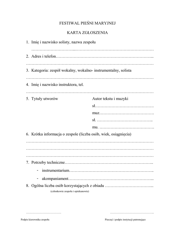 FESTIWAL PIEŚNI MARYJNEJ KARTA ZGŁOSZENIA 1. Imię i nazwisko solisty, nazwa zespołu …………………………...………………………………………………… 2. Adres i telefon……………………………………………………………... ………………………………………………………………………………… 3. Kategoria: zespół wokalny, wokalno- instrumentalny, solista ………………………………………………………………………………… 4. Imię i nazwisko instruktora, tel. ………………………………………………………………………………… 5. Tytuły utworów Autor tekstu i muzyki sł……………………………………. muz…………………………………. sł. ………………………………….. mu. …………………………………. 6. Krótka informacja o zespole (liczba osób, wiek, osiągnięcia) ………………………………………………………………………………… ………………………………………………………………………………… ………………………………………………………………………………… 7. Potrzeby techniczne……………………………………………………….. - instrumentarium…………………………………………………….. - akompaniament……………………………………………………... 8. Ogólna liczba osób korzystających z obiadu ……………………………... (członkowie zespołu i opiekunowie) …………………………………. Podpis kierownika zespołu ………………………………………….. Pieczęć i podpis instytucji patronujące