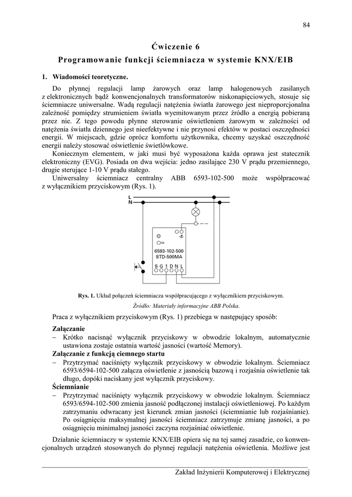 84 Ćwiczenie 6 Programowanie funkcji ściemniacza w systemie KNX/EIB 1. Wiadomości teoretyczne. Do płynnej regulacji lamp żarowych oraz lamp halogenowych zasilanych z elektronicznych bądź konwencjonalnych transformatorów niskonapięciowych, stosuje się ściemniacze uniwersalne. Wadą regulacji natężenia światła żarowego jest nieproporcjonalna zależność pomiędzy strumieniem światła wyemitowanym przez źródło a energią pobieraną przez nie. Z tego powodu płynne sterowanie oświetleniem żarowym w zależności od natężenia światła dziennego jest nieefektywne i nie przynosi efektów w postaci oszczędności energii. W miejscach, gdzie oprócz komfortu użytkownika, chcemy uzyskać oszczędność energii należy stosować oświetlenie świetlówkowe. Koniecznym elementem, w jaki musi być wyposażona każda oprawa jest statecznik elektroniczny (EVG). Posiada on dwa wejścia: jedno zasilające 230 V prądu przemiennego, drugie sterujące 1-10 V prądu stałego. Uniwersalny ściemniacz centralny ABB 6593-102-500 może współpracować z wyłącznikiem przyciskowym (Rys. 1). Rys. 1. Układ połączeń ściemniacza współpracującego z wyłącznikiem przyciskowym. Źródło: Materiały informacyjne ABB Polska. Praca z wyłącznikiem przyciskowym (Rys. 1) przebiega w następujący sposób: Załączanie Krótko nacisnąć wyłącznik przyciskowy w obwodzie lokalnym, automatycznie ustawiona zostaje ostatnia wartość jasności (wartość Memory). Załączanie z funkcją ciemnego startu Przytrzymać naciśnięty wyłącznik przyciskowy w obwodzie lokalnym. Ściemniacz 6593/6594-102-500 załącza oświetlenie z jasnością bazową i rozjaśnia oświetlenie tak długo, dopóki naciskany jest wyłącznik przyciskowy. Ściemnianie Przytrzymać naciśnięty wyłącznik przyciskowy w obwodzie lokalnym. Ściemniacz 6593/6594-102-500 zmienia jasność podłączonej instalacji oświetleniowej. Po każdym zatrzymaniu odwracany jest kierunek zmian jasności (ściemnianie lub rozjaśnianie). Po osiągnięciu maksymalnej jasności ściemniacz zatrzymuje zmianę jasności, a po osiągnięciu minimalnej jasności zaczyna rozjaśniać oświetlenie. Działanie ściemniaczy w systemie KNX/EIB opiera się na tej samej zasadzie, co konwencjonalnych urządzeń stosowanych do płynnej regulacji natężenia oświetlenia. Możliwe jest ___________________________________________________________________________ Zakład Inżynierii Komputerowej i Elektrycznej 85 również wysterowanie za pośrednictwem podzespołu sterowniczego 6197/11-500 magistrali ABB i-bus (Rys. 2). Rys. 2. Budowa ściemniacza: BCU – port magistralny; AU – element końcowy; PEI – łącze adaptacyjne; SR – rejestr przesuwny; DAC – przetwornik cyfrowo/analogowy. W czasie okresu ściemniania/rozjaśniania port magistralny zwiększa lub zmniejsza liczbową wartość natężenia oświetlenia zgodnie z ustalonym czasem regulacji. Wartość natężenia oświetlenia jest ciągle przekazywana do rejestru przesuwnego (SR) w elemencie aplikacyjnym. Dane o długości 8 bitów pozwalają zapisać 28 = 256 wartości natężenia oświetlenia. Dane są wprowadzane do przetwornika cyfrowo/analogowego (DAC), który potem generuje odpowiednie napięcie sterujące z zakresu 0 do 10 V. Elektronicznie sterowany zapłonnik używa tego napięcia do sterowania emisji światła z lamp fluoroscencyjnych. Wyłącznik obwodu mocy w elemencie końcowym jest używany do załączania (wyłączania) napięcia zasilającego. Ściemniacz współpracuje z podzespołem sterowniczym magistrali KNX/EIB (Rys. 3). Rys. 3. Układ połączeń ściemniacza współpracującego z podzespołem sterowniczym 6197/11-500 magistrali KNX/EIB: 1 – przycisk programowania, 2 – dioda sygnalizacyjna, 3 – kostka przyłączeniowa magistrali. Źródło: Materiały informacyjne ABB Polska. Zwiększenie mocy uniwersalnego ściemniacza centralnego ABB 6593-102-500 za pomocą podzespołu mocy 6594-102-500, przy współpracy z wyłącznikiem przyciskowym (Rys. 4). ___________________________________________________________________________ Elektryczne Systemy Inteligentne 86 Rys. 4. Układ połączeń ściemniacza współpracującego z podzespołem mocy 6594-102-500 zwiększającym moc. Źródło: Materiały informacyjne ABB Polska. Ściemniacz może działać realizując dwie funkcje aplikacyjne: Ściemnianie z telegramem start/stop. Ściemnianie telegramami cyklicznymi. Zgodnie z pierwszą funkcją o aktywności trybu załączania lub ściemniania decyduje czas trwania przyciśnięcia przycisku sensora załączającego. Jeżeli czas ten jest krótki (np. <500 ms), to wysyłany jest telegram załączający. W przypadku dłuższego przyciśnięcia przycisku nadawany jest telegram start ściemniania/rozjaśniania. Zwolnienie przycisku powoduje natychmiastowe wysłanie telegramu – stop ściemniania/rozjaśniania (Rys. 5). Rys. 5. Ściemnianie z telegramem start/stop: 1 – start ściemniania, długie przyciśnięcie; 2 – stop ściemniania, puszczenie ściemniającego przycisku; 3 - wyłączenie, krótkie przyciśnięcie przycisku; 4 – załączenie, krótkie przyciśnięcie przycisku; 5 – start ściemniania, długie przyciśnięcie przycisku; 6 – stop ściemniania, puszczenie przycisku. Źródło: Opracowanie własne na podstawie materiałów Stowarzyszenia KNX. ___________________________________________________________________________ Elektryczne Systemy Inteligentne 87 Zalecane jest utworzenie różnych grup adresowych realizujących osobno funkcje włączania i ściemniania/rozjaśniania. Rys. 6. Grupy adresowe ściemniacza. Rys. 7. Obiekty komunikacyjne ściemniacza. Druga funkcja jest stosowana na przykład w systemach kontrolowanych poprzez podczerwień, w których źródło może być przesłonięte poprzez przeszkodę, np. osobę przechodzącą. Żeby uniknąć sytuacji, w której ściemniacz nie otrzyma telegramu np. stop, przeważnie podczas parametryzacji ko