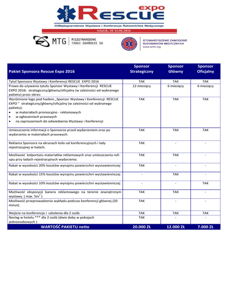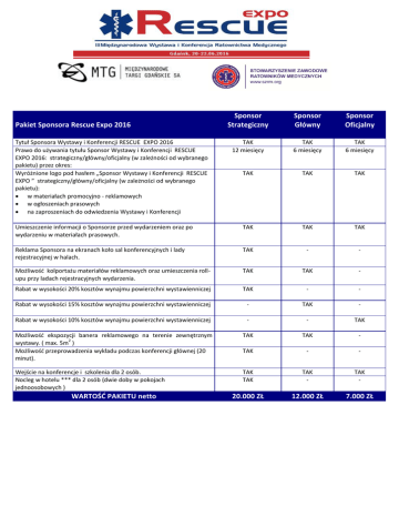 Sponsor Strategiczny Sponsor Główny Sponsor Oficjalny TAK 12 miesięcy TAK 6 miesięcy TAK 6 miesięcy TAK TAK TAK Umieszczenie informacji o Sponsorze przed wydarzeniem oraz po wydarzeniu w materiałach prasowych. TAK TAK TAK Reklama Sponsora na ekranach koło sal konferencyjnych i lady rejestracyjnej w halach. TAK - - Możliwość kolportażu materiałów reklamowych oraz umieszczenia rollupu przy ladach rejestracyjnych wydarzenia. TAK TAK - Rabat w wysokości 20% kosztów wynajmu powierzchni wystawienniczej TAK - - Rabat w wysokości 15% kosztów wynajmu powierzchni wystawienniczej - TAK - Rabat w wysokości 10% kosztów wynajmu powierzchni wystawienniczej - - TAK Możliwość ekspozycji banera reklamowego na terenie zewnętrznym 2 wystawy. ( max. 5m ) Możliwość przeprowadzenia wykładu podczas konferencji głównej (20 minut). TAK TAK - TAK - - Wejście na konferencje i szkolenia dla 2 osób. Nocleg w hotelu *** dla 2 osób (dwie doby w pokojach jednoosobowych ) TAK TAK TAK - TAK - 20.000 ZŁ 12.000 ZŁ 7.000 ZŁ Pakiet Sponsora Rescue Expo 2016 Tytuł Sponsora Wystawy i Konferencji RESCUE EXPO 2016 Prawo do używania tytułu Sponsor Wystawy i Konferencji RESCUE EXPO 2016: strategiczny/główny/oficjalny (w zależności od wybranego pakietu) przez okres: Wyróżnione logo pod hasłem „Sponsor Wystawy i Konferencji RESCUE EXPO ” strategiczny/główny/oficjalny (w zależności od wybranego pakietu): w materiałach promocyjno - reklamowych w ogłoszeniach prasowych na zaproszeniach do odwiedzenia Wystawy i Konferencji WARTOŚĆ PAKIETU netto OFERTA SPECJALNA – PARTNER WYSTAWY POJAZDÓW SPECJALISTYCZNYCH W ramach wystawy Rescue Expo 2016 na terenach zewnętrznych zorganizowana będzie wystawa pojazdów specjalistycznych. Zapraszamy producentów i dystrybutorów do prezentacji swoich pojazdów w ramach specjalnej oferty: możliwość dołączenia materiałów promocyjnych do materiałów konferencyjnych, możliwość ustawienia rollup-ów oraz dystrybucji materiałów promocyjnych udostępnienie powierzchni niezabudowanej na terenach zewnętrznych o wielkości 20 m2 Cena: 1 500 zł netto plus opłata rejestracyjna 570 zł netto.