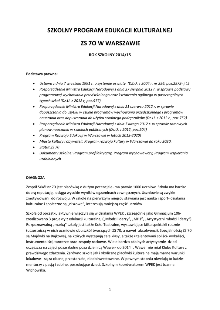 SZKOLNY PROGRAM EDUKACJI KULTURALNEJ ZS 7O W WARSZAWIE ROK SZKOLNY 2014/15 Podstawa prawna: Ustawa z dnia 7 września 1991 r. o systemie oświaty. (DZ.U. z 2004 r. nr 256, poz.2572- j.t.) Rozporządzenie Ministra Edukacji Narodowej z dnia 27 sierpnia 2012 r. w sprawie podstawy programowej wychowania przedszkolnego oraz kształcenia ogólnego w poszczególnych typach szkół (Dz.U. z 2012 r, poz.977) Rozporządzenie Ministra Edukacji Narodowej z dnia 21 czerwca 2012 r. w sprawie dopuszczania do użytku w szkole programów wychowania przedszkolnego i programów nauczania oraz dopuszczania do użytku szkolnego podręczników (Dz.U. z 2012 r., poz.752) Rozporządzenie Ministra Edukacji Narodowej z dnia 7 lutego 2012 r. w sprawie ramowych planów nauczania w szkołach publicznych (Dz.U. z 2012, poz.204) Program Rozwoju Edukacji w Warszawie w latach 2013-2020) Miasto kultury i obywateli. Program rozwoju kultury w Warszawie do roku 2020. Statut ZS 70 Dokumenty szkolne: Program profilaktyczny, Program wychowawczy, Program wspierania uzdolnionych DIAGNOZA Zespół Szkół nr 70 jest placówką o dużym potencjale- ma prawie 1000 uczniów. Szkoła ma bardzo dobrą reputację, osiąga wysokie wyniki w egzaminach zewnętrznych. Uczniowie są zwykle zmotywowani do rozwoju. W szkole na pierwszym miejscu stawiana jest nauka i sport- działania kulturalne i społeczne są „niszowe”, interesują mniejszą część uczniów. Szkoła od początku aktywnie włączyła się w działania WPEK , szczególnie jako Gimnazjum 106zrealizowano 3 projekty z edukacji kulturalnej („Młodzi liderzy”, „MP1”, „Artystyczni młodzi liderzy”). Rozpoznawalną „marką” szkoły jest także Koło Teatralne, wystawiające kilka spektakli rocznie (uczestniczą w nich uczniowie obu szkół tworzących ZS 70, a nawet absolwenci). Specjalnością ZS 70 są Majówki na Bajkowej, na których występują całe klasy, a także utalentowani soliści- wokaliści, instrumentaliści, tancerze oraz zespoły rockowe. Wiele bardzo zdolnych artystycznie dzieci uczęszcza na zajęci pozaszkolne poza dzielnicą Wawer- do 2014 r. Wawer nie miał Klubu Kultury z prawdziwego zdarzenia. Zarówno szkoła jak i okoliczne placówki kulturalne mają marne warunki lokalowe- są za ciasne, przestarzałe, niedoinwestowane. W pewnym stopniu niwelują to ludziementorzy z pasją i zdolne, poszukujące dzieci. Szkolnym koordynatorem WPEK jest Joanna Wichowska. 1 CELE 1. Kształtowanie i rozwijanie postaw prokulturowych- wrażliwości, pro aktywności, gotowości do twórczej ekspresji 2. Podnoszenie kompetencji kulturowych- znajomości kultury polskiej i światowej 3. Przygotowanie uczniów do aktywnego uczestnictwa w kulturze 4. Tworzenie warunków do rozwijania aktywności twórczej uczniów 5. Wzmacnianie tożsamości warszawskiej-większa orientacja w możliwościach warszawskiej kultury, duma z miasta. Główne zadania 1. Kształcenie w obszarze kulturowym i artystycznym, realizowane na zajęciach artystycznych oraz na przedmiotach humanistycznych i na zajęciach 2. Organizacja i udział w wydarzeniach szkolnych , dzielnicowych i miejskich – ścisła współpraca z Wawerskim Centrum Kultury 3. Udział w przedsięwzięciach (imprezy, konkursy) miejskich, krajowych i międzynarodowych w ramach współpracy z Biurem Edukacji, programów unijnych (Erasmus+) i in. 4. Udział w sieciach dotyczących kultury 5. Realizacja projektów edukacji kulturalnej (m.in. w ramach gimnazjalnych projektowi edukacyjnych) 6. Szerokie informowanie społeczności szkolnej o działaniach kulturalnych w szkole i dzielnicy, rekomendowanie wydarzeń miejskich 7. Doskonalenie kadry nauczycielskiej (m.in.WCIES) , inspirowanie nauczycieli do aktywnego udziału w kulturze (kontynuacja wspólnych wyjść do teatru) Odbiorcy programu Odbiorcami programu jest cała społeczność szkolna- głównie uczniowie i nauczyciele, a także rodzice. Realizatorzy Realizatorami programu są nauczyciele ZS 70- zespół humanistyczny oraz wychowawcy. Do współpracy zaproszenie zostaną także instruktorzy z Wawerskiego Centrum Kultury Spodziewane efekty programu Zwiększony udział uczniów w kulturze warszawskiej- więcej o 50 proc. wycieczek do muzeów, placówek kultury itp. Większa o 50 proc. ilość projektów z edukacji kulturalnej Inspirowanie twórczej ekspresji uczniów- zorganizowanie wspólnego z Wawerskim Centrum Kultury przedsięwzięcia aktywizującego uczniów gimnazjum 2 Ewaluacja W czerwcu 2015 r. zostanie przeprowadzona ewaluacja SzPEK, typowymi narzędziami ewaluacyjnymi. Wyniki zostaną przedstawione Radzie Pedagogicznej na sierpniowej radzie podsumowującej. Podmioty współpracujące Wawerskie Centrum Kultury Stowarzyszenie Rodzina 19. Pułku Ułanów Wołyńskich Finansowanie Większość działań szkoła będzie finansować z własnych środków; dopuszcza się ubieganie o dofinansowanie u Rady Rodziców i Urzędu Dzielnicy Oprac. Joanna Wichowska Program uzyskał akceptację Rady Pedagogicznej, Rady Rodziców oraz Samorządu Uczniowskiego Warszawa, 10.09.2014 r. 3