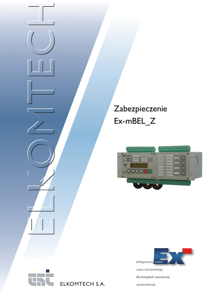 Zabezpieczenie Ex-mBEL_Z Zabezpieczenie Ex-mBEL_Z Przeznaczenie Zabezpieczenie Ex-mBEL_Z przeznaczone jest do pracy w polach rozdzielni SN i nn. Sterownik jest przedstawicielem nowej grupy urządzeń Ex-mBEL, która uzupełnia gamę zabezpieczeń i telemechanik produkowanych przez firmę ELKOMTECH. Zabezpieczenia Ex-mBEL_Z mają zastosowanie wszędzie tam, gdzie nie jest wymagana duża ilość wejść i wyjść binarnych i rozbudowane funkcje zabezpieczeniowe, a istotne znaczenie mają niewielkie rozmiary obudowy, niski pobór mocy i redukcja kosztów. Ex-mBEL_Z pełni także funkcję telemechaniki - monitoruje stany łączników, wysyła pomiary oraz wykonuje sterowania wyłącznikiem. Od strony programowo-interfejsowej urządzenie jest w pełni zintegrowane z systemem Ex-SCADA. - kontrola zazbrojenia napędu, - wyjścia Alarm, AW, UP. Automatyka SPZ Sterownik realizuje automatykę SPZ – do 3 załączeń z możliwością pobudzania i blokowania automatyki dowolnym stopniem dowolnego modułu zabezpieczeniowego oraz sygnałem stykowym z zewnętrznego urządzenia. Możliwość zdalnego blokowania i odblokowywania automatyki. Automatyka SCO i SPZ po SCO Dedykowane wejścia do współpracy z automatyką SCO i SPZ po SCO. Także realizacja na drodze informatycznej po magistrali CAN. Funkcje telemechaniczne - Telesygnalizacja – wykrywanie zmian z rozdzielczością czasową 5ms 1; wysyłanie zdarzeń z lokalnie nadawaną cechą czasu; generowanie sekwencji zdarzeń (SOE). Lokalny zegar czasu rzeczywistego synchronizowany z koncentratora. Zegar ma podtrzymanie bateryjne. - Telesterowania – sterowanie wyłącznikiem, telekasowanie zabezpieczenia oraz zdalna blokada/odblokowanie automatyki SPZ; telesterowanie innymi skonfigurowanymi łącznikami. - Telepomiary – pomiary prądów fazowych. - Diagnostyka związana z działaniem zabezpieczenia. Ex-mBEL_Z w wersji z rozszerzeniem Funkcje zabezpieczeniowe Zabezpieczenie Ex-mBEL_Z w zależności od wykonania mierzy: - trzy prądy w zakresie do 20In oraz napięcie U0, - dwa prądy fazowe w zakresie do 20In, napięcie U0 oraz prąd I0 z przekładnika Ferrnatiego w zakresie 1,2A lub 6A. W wariancie z pomiarem trzech prądów fazowych I0 jest wyliczane na drodze programowej. W wariancie z pomiarem 2 prądów fazowych i I0, trzeci prąd fazowy może być wyliczony. W oparciu o te pomiary sterownik realizuje: - czterostopniowe zabezpieczenie nadprądowe na prądach fazowych, - zabezpieczenie nadprądowe zależne, - dwustopniowe zabezpieczenie nadprądowe ziemnozwarciowe, - zabezpieczenie ziemnozwarciowe kierunkowe, - zabezpieczenie ziemnozwarciowe admitancyjne i konduktancyjne, - możliwość filtracji krótkotrwałych pobudzeń zabezpieczeń ziemnozwarciowych, - współpraca stykowa z zabezpieczeniami zewnętrznymi (także pobudzanie SPZ), - układ rezerwy wyłącznikowej – w polu odpływowym rezerwa w trybie prądowym lub wyłącznikowym; w polu zasilającym wyłączenie po czasie z uwzględnieniem lub bez uwzględnienia pobudzenia stopni nadprądowych, - blokada zabezpieczenia szyn zbiorczych – wyjście blokady w polu odpływowym, wejście blokujące trzeci stopień I> w polu zasilającym, Budowa Obudowa zabezpieczenia jest wykonana z profili aluminiowych. Zabezpieczenie może być wykonane w wersji podstawowej (obudowa jednomodułowa) lub w wersji rozszerzonej (obudowa składa się z modułu podstawowego i modułu rozszerzenia). Zasoby wersji podstawowej: - pakiet sterownika mikroprocesorowego; - pakiet zasilacza PS z 3 wyjściami przekaźnikowymi i 5 wejściami dwustanowymi; - wielofunkcyjny pakiet CMB3 z 4 wyjściami przekaźnikowymi, 8 wejściami dwustanowymi, wejściem pomiaru napięcia U0 lub CMB4 z 4 wyjściami przekaźnikowymi, 7 wejściami dwustanowymi podzielonymi na dwie grupy, wejściem pomiaru napięcia U0 - pakiet przekładników prądowych TRF, - interfejs komunikacyjny - pakiet wyświetlacza z klawiaturą i programowalnymi diodami LED. W wersja rozszerzonej dodatkowo występują: - pakiet wejść dwustanowych BI – 16 wejść podzielonych na 2 grupy, każda ze wspólnym zaciskiem. - pakiet wyjść przekaźnikowych BO – 8 wyjść, 3 przekaźniki ze stykiem przełącznym, 5 przekaźników ze stykiem zwiernym 1 w wersji bez rozszerzenia 1ms Obwody wejściowe i wyjściowe Wejścia dwustanowe mogą być pobudzane napięciem stałym lub zmiennym: - pobudzanie napięciem stałym – napięcie wejściowe w zależności od wykonania od =24V do =220V z wymuszeniem przepływu prądu 5mA przez styki sygnalizacyjne; - pobudzanie napięciem zmiennym – standardowe napięcie ~230V, rozdzielczość czasowa 20 ms. Typ napięcia sygnalizacji (AC/DC) wybiera się na drodze programowej (konfiguracja). W obu przypadkach czas filtrowania sygnałów jest ustawiany programowo. Obwody sterownicze – w wersji podstawowej 2 przekaźniki do sterowania wyłącznikiem, 1 przekaźnik ze stykami przełącznymi oraz 4 przekaźniki sygnalizacyjne ze stykami zwiernymi; w wersji rozszerzonej dodatkowo 8 wyjść przekaźnikowych Obwody pomiarowe – 3 wejścia prądowe, w każdym pomiar dwuzakresowy dla zwiększenia dokładności w obszarze znamionowym; izolacja transformatorowa; wejście pomiaru napięcia U0 – izolacja wysokoomowa. Zakres pomiarowy prądów fazowych regulowany ilością zwojów przeprowadzonych przez okno wejściowego przekładnika prądowego (1 zwój – zakres 100A, 5 zwojów – 20A). Łączność Sterownik jest wyposażony w kanał diagnostyczny oraz w dwa kanały łączności szeregowej. Możliwe interfejsy komunikacyjne to: - PFO światłowody plastikowe, - kanał inżynierski z interfejsem PFO, - GFO światłowody szklane (złącza ST) - CAN, - RS 485/422, - RS 232, - Ethernet 100Base-TX, - Ethernet na światłowodach plastikowych 100Mb/s – złącze SC-RJ. Wszystkie interfejsy są izolowane galwanicznie. Ex-mBEL_Z w wersji z interfejsem Ethernet i RS485 - widok zabezpieczenia z boku Obsługiwane protokoły Sterownik może być wypo