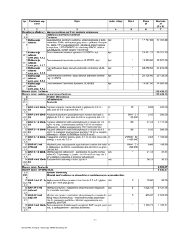 Lp. Podstawa wyceny Opis Jedn. miary Ilość 1 2 3 4 5 Kosztorys ofertowy - Wersja sieciowa na 2 km zaslanie miejscowe 1 Instalacja alarmowa Centrum 1.1 Centrum 1 Kalkulacja WyposaŜenie centrum systemu, układ zasilacza z bufo- kpl 1 d.1. własna rowaniem 65Ah, stół operacyjny wraz z półkami i koryta1 mi, szafa 19" z wyposaŜeniem, obudowa przemysłowa komputera, UPS1000APC do obudowy RACK, tablica synoptyczna, switch lokalny 10x10/100 2 Kalkulacja Zainstalowanie serwera systemu ULISSES - kpl. kpl 1 d.1. własna 1 zam. poz. 1.1.3 3 Kalkulacja Zainstalowanie terminala systemu ULISSES - kpl. kpl 1 d.1. własna 1 zam. poz. 1.1.3 4 Kalkulacja Przygotowanie bazy danych jednostki centralnej ULIS- kpl 1 d.1. własna SES 1 zam. poz. 1.1.8 5 Kalkulacja Uruchomienie serwera i bazy danych jednostki central- kpl 1 d.1. własna nej ULISSES 1 zam. poz. 1.1.3 6 Kalkulacja Uruchomienie Terminala Systemu ULISSES kpl 1 d.1. własna 1 zam. poz. 1.1.3 Razem dział: Centrum Razem dział: Instalacja alarmowa Centrum 2 System Obwodnica 2.1 Infrastruktura 2.1. Zasilanie 1 7 KNR 2-01 0701- Ręczne kopanie rowów dla kabli o głębok.do 0.6 m i m 50 d.2. 04 szer.dna do 0.6 w gruncie kat. I-II 1.1 8 KNR 2-01 0702- Kopanie koparkami podsiębiernymi rowów dla kabli o m 50+110 = d.2. 03 głębok.do 0.8 m i szer.dna do 0.6 m w gruncie kat. I-II 160.000 1.1 9 KNR 5-10 0103- Ręczne układanie kabli wieloŜyłowych o masie do 1.0 m 110 d.2. 02 kg/m na nap. znamionowe poniŜej 110 kV w rowach 1.1 kablowych - Kabel energetyczny YKY 5x16 0,6/1kV 10 KNR 5-10 0103- Ręczne układanie kabli wieloŜyłowych o masie do 0.5 m 110 d.2. 01 kg/m na napięcie znamionowe poniŜej 110 kV w rowach 1.1 kablowych - Kabel XzTKMXpw 3x2x0,8 mm2 11 KNR 5-10 0301- Nasypanie warstwy piasku grub. 0.1 m na dno rowu kab- m 2*(100+110) d.2. 02 lowego o szer.do 0.6 m = 420.000 1.1 12 KNR-W 2-01 Mechaniczne zasypywanie spycharkami rowów dla kabli m 110+110 = d.2. 0705-03 o głębokości do 0.8 m i szerokości dna do 0.6 m w grun220.000 1.1 cie kat. I-II 13 KNR 5-10 0604- MontaŜ głowic kablowych - zarobienie na sucho końca szt. 1 d.2. 01 kabla Cu 3-Ŝyłowego o przekr. do 16 mm2 na nap. do 1 1.1 kV o izolacji i powłoce z tworzyw sztucznych 14 KNR 4-03 1203- Badanie linii kablowej o ilości Ŝył do 4 odc. 1 d.2. 01 1.1 Razem dział: Zasilanie Razem dział: Infrastruktura 2.2 System alarmowy 2.2. MontaŜ szaf systemu na obwodnicy z podstawowym wyposaŜeniem 1 15 KNR 2-01 0312- Wykopanie dołów o powierzchni dna do 0.2 m2 i głębo- dół. 5 d.2. 10 kości do 1.0 m (kat.gr.III) 2.1 16 KNR-W 5-08 MontaŜ skrzynek i rozdzielnic skrzynkowych stojących szt. 5 d.2. 0404-07 do montaŜu osprzętu. 2.1 17 KNR-W 5-08 MontaŜ skrzynek i rozdzielnic skrzynkowych o masie do szt. 5 d.2. 0404-07 10kg wraz z konstrukcją - mocowanie przez przykręce2.1 nie do gotowego podłoŜa - MontaŜ wyposaŜenia rozdzielnicy EMITER 18 KNR 5-06 1602- Zainstalowanie dodatkowych urządzeń SAP na got. pod- szt. 1 d.2. 09 łoŜu z podłączeniem - zasilacz buforowy 2.1 -1- Norma PRO Wersja 4.19 Licencja: 14141 dla Stekop SA Cena zł 6 Wartość zł (5 x 6) 7 17 767.88 17 767.88 29 321.25 29 321.25 19 925.00 19 925.00 34 212.50 34 212.50 20 125.00 20 125.00 14 087.50 14 087.50 135 439.13 135 439.13 9.94 497.00 2.45 392.00 37.43 4 117.30 5.35 588.50 2.64 1 108.80 0.68 149.60 31.44 31.44 36.23 36.23 6 920.87 6 920.87 19.80 99.00 1 625.43 8 127.15 465.97 2 329.85 1 105.71 1 105.71 Lp. Podstawa wyceny Opis Jedn. miary 1 2 3 4 19 KNR AL-01 MontaŜ akumulatora bezobsługowego o poj. do 130 Ah - szt. d.2. 0109-02 kpl na zasilanie 48V 4szt. 2.1 Razem dział: MontaŜ szaf systemu na obwodnicy z podstawowym wyposaŜeniem 2.2. Czujnik doziemny HF400 2 20 KNR AL-01 MontaŜ sterownika HF400 (kpl. złącza, terminale, kable szt d.2. 0604-01 nieczułe) na najgorszym testowym odcinku obwodnicy 2.2 analogia 21 KNR 5-06 0710- MontaŜ złączy na kablach współosiowych o średnicy do szt. d.2. 06 10 mm 2.2 22 KNR 2-01 0701- Ręczne kopanie rowów dla kabli o głębokości do 0.6 m i m d.2. 0101 szer. dna do 0.4 m w gruncie kat. I-II - 2 wykopy po 2.2 7200m 23 KNR 5-10 0101- Ręczne układanie kabli jednoŜyłowych o masie do 0.5 m d.2. 01 kg/m na napięcie znamionowe poniŜej 110 kV w rowach 2.2 kablowych 24 KNR 2-01 0704- Ręczne zasypywanie rowów dla kabli o głębokości do m d.2. 0101 0.6 m i szer. dna do 0.4 m w gruncie kat. I-II 2.2 25 Kalkulacja Uruchomienie sterownika HF400 kpl d.2. własna 2.2 26 Kalkulacja Kalibracja, praca próbna strefy detekcji HF400 kpl d.2. własna 2.2 27 KNR 5-06 1614- Sprawdzenie i uruchomienie linii dozorowych o 10 punk- szt. d.2. 01 tach 2.2 Razem dział: Czujnik doziemny HF400 Razem dział: System alarmowy Razem dział: System Obwodnica 3 Prace uzupełniające 28 Dokumentacja powykonawcza kpl d.3 analiza indywidualna 29 Aktualizacja mapy sytuacyjno-wysokościowej oraz wyko- kpl d.3 analiza indywi- nanie inwentaryzacji geodezyjnej powykonawczej dualna 30 Rozruch i uruchomienie systemów /w tym prace wstęp- kpl d.3 analiza indywi- ne/ dualna 31 Przeszkolenie obsługi i dostarczenie instrukcji obsługi kpl d.3 analiza indywidualna Razem dział: Prace uzupełniające Ilość Cena zł 5 6 1 771.51 1 Wartość zł (5 x 6) 7 1 771.51 13 433.22 5 45 115.72 225 578.60 16*5 = 80.000 39.59 3 167.20 2*2000 = 4000.000 6.62 26 480.00 2*2000 = 4000.000 23.31 93 240.00 2*2000 = 4000.000 3.04 12 160.00 5 2 012.50 10 062.50 5 14 051.59 70 257.95 5 32.67 163.35 441 109.60 454 542.82 461 463.69 1 4 025.00 4 025.00 1 4 025.00 4 025.00 1 6 037.50 6 037.50 1 2 012.50 2 012.50 16 100.00 PODSUMOWANIE RAZEM RAZEM 501 033.54 Robocizna 110 146.97 CAŁY KOSZTORYS Materiały Sprzęt 390 483.34 403.23 Koszty pośrednie [Kp] 75% od (R, S) 82 939.72 82 637.08 302.64 RAZEM 583 973.26 192 784.05 Zysk [Z] 15% od (R+Kp(R), S+Kp(S)) 29 029.56 28 923.42 390 483.34 705.87 106.14 RAZEM 613 002.82 221 707.47 390 483.34 812.01 VAT [V] 22% od (Σ(R+Kp(R)+Z(R), M, S+Kp(S)+Z(S))) 134 860.62 48 7
