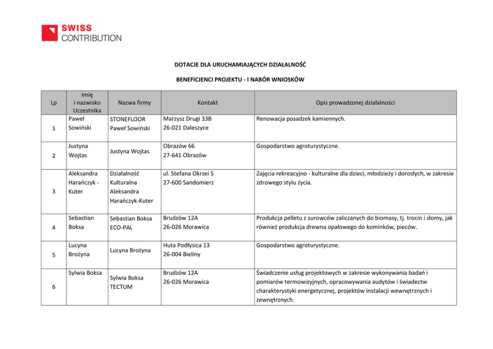 DOTACJE DLA URUCHAMIAJĄCYCH DZIAŁALNOŚĆ BENEFICJENCI PROJEKTU - I NABÓR WNIOSKÓW 1 Imię i nazwisko Uczestnika Paweł Sowiński 2 Justyna Wojtas Działalność Kulturalna Aleksandra Harańczyk-Kuter ul. Stefana Okrzei 5 27-600 Sandomierz Zajęcia rekreacyjno - kulturalne dla dzieci, młodzieży i dorosłych, w zakresie zdrowego stylu życia. 3 Aleksandra Harańczyk Kuter 4 Sebastian Boksa Sebastian Boksa ECO-PAL Brudzów 12A 26-026 Morawica Produkcja pelletu z surowców zaliczanych do biomasy, tj. trocin i słomy, jak również produkcja drewna opałowego do kominków, pieców. Lucyna Brożyna Huta Podłysica 13 26-004 Bieliny Gospodarstwo agroturystyczne. 5 Lucyna Brożyna Brudzów 12A 26-026 Morawica Świadczenie usług projektowych w zakresie wykonywania badań i pomiarów termowizyjnych, opracowywania audytów i świadectw charakterystyki energetycznej, projektów instalacji wewnętrznych i zewnętrznych. Lp Sylwia Boksa 6 Nazwa firmy Kontakt Opis prowadzonej działalności STONEFLOOR Paweł Sowiński Marzysz Drugi 33B 26-021 Daleszyce Renowacja posadzek kamiennych. Justyna Wojtas Obrazów 66 27-641 Obrazów Gospodarstwo agroturystyczne. Sylwia Boksa TECTUM Janusz Radek Janusz Radek RADEX OIL Trzcianka 37 26-006 Nowa Słupia Powstanie studia artystycznych produkcji muzycznych. Robert Salwa Robert Salwa Zakład Usług Stolarskich Luźny Sęk Goleniawy 59 26-050 Zagnańsk Pracownia wyrobów drewnianych, tj. przedmiotów ozdobnych, renowacja domów drewnianych, drewniane meble domowe i ogrodowe. Huta Podłysica 16 26-004 Bieliny Gospodarstwo agroturystyczne. Wiącka 29 26-010 Bodzentyn Warsztat mechaniki pojazdowej w miejscowości Wiącka, gmina Bodzentyn. 7 8 Joanna Róg 9 10 11 12 13 14 Joanna Róg Maciej Nowak Auto - Klinika Maciej Nowak Anna Anna Ruszkowiec 45 Pokrzywnicka Pokrzywnicka 27-580 Sadowie Decoris Pracownia ceramiki artystycznej oraz usługo artystyczne Kostomłoty Pierwsze Łukasz Toporek Łukasz ul. Starowiejska 30 LTSTAL Toporek 26-085 Miedziana Góra Helena Słaba Helena Słaba Szymanowice Dolne 3 27-640 Klimontów Ewelina Gdak Ewelina Gdak ul. Ogrodowa 1 GDAK Studio 26-052 Zgórsko Produkcja artystycznych wyrobów ceramicznych oraz usługi dekoratorskie. Spawalnictwo - spawanie z materiałów powierzonych z obróbka, wg projektu klienta. Gospodarstwo agroturystyczne. Projekty przestrzeni i terenów zielonych. Agata Chodorek P.P. H. U. GUMBORO Agata Chodorek Baranówek 37 27-552 Baćkowice Pasieka wędrowna. Zapylanie roślin przez pszczoły. Sylwester Łukawski Sylwester Łukawski Zbigniewice Wieś 1 27-660 Koprzywnica Gospodarstwo agroturystyczne. 16 Justyna Dachowska Sędek 27 26-025 Łagów Gospodarstwo agroturystyczne. 17 Justyna Dachowska 27-650 Szewce 43 18 Mariusz Guźla STYL - MAR Mariusz Guźla Produkcja artykułów tekstylnych dla hoteli, restauracji oraz klientów indywidualnych. Daniel Siarek Krajno Drugie 148 26-008 Górno Produkcja i montaż bram i metalowych ogrodzeń kutych. ul. Władysława Jasińskiego 39 27-660 Koprzywnica Piekarnia. Stobiec 95 27-570 Stobiec ul. Suchedniowska 71 26-010 Bodzentyn ul. Kielecka 32 26-060 Chęciny Hodowla pszczół i pozyskiwanie produktów pszczelich. 15 19 20 21 22 23 Centrum Spawalnicze "SPAWIK" Andrzej Floras Piekarnia u Jędrusia Andrzej Floras Robert Pasieka Leśna Brodawka Robert Brodawka Grzegorz "Wrona" F.H.U. Wrona Grzegorz Wrona Tomasz EKO - LOGIKA Fąfara Tomasz Fąfara Produkcja mebli do sypialni, garderoby, oraz zabudowy wnęk. Wdrażanie technologii i pozyskiwanie energii z odnawialnych źródeł. 24 25 26 Marcin Wasik MW Soft Marcin Wasik Jolanta Jolanta Osojca Osojca "Zdrowa Kasza" Marek ART. GARDEN Gościniewicz MAREK GOŚCINIEWICZ Piotrów Gułaczów 43 26-025 Łagów Przybysławice 6 27-530 Ożarów Górno 6F 26-008 Górno Tworzenie oprogramowania dla mikro i małych przedsiębiorstw. Produkcja kaszy jaglanej. Usługi ogrodnicze.