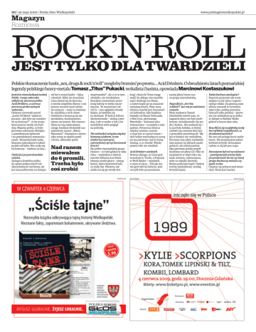 20 | 29 maja 2009 | Polska Głos Wielkopolski www.polskagloswielkopolski.pl Magazyn Rozmowa ROCK’N’ROLL JESTTYLKODLATWARDZIELI Polskietłumaczeniehasła„sex,drugs&rock’n’roll”mogłobybrzmiećpoprostu...AcidDrinkers.Odwudziestulatachpoznańskiej legendypolskiegoheavy-metaluTomasz „Titus”Pukacki,wokalistaibasista,opowiadaMarcinowi Kostaszukowi Jesteście równolatkami wolnej Polski. 7 maja 1989 roku odbyła się pierwsza próba Acid Drinkers, 4 czerwca pierwsza próba wolnych wyborów... Ostatnio norweski portal „Lords Of Metal” zadał mi pytanie: „Jak żyło się muzykowi za komuny?”. A my muzykami jeszcze wtedy nie byliśmy. Majowa próba, to było pierwsze uderzenie dźwięku z prawdziwymi bębnami i na prawdziwych wzmacniaczach. Wcześniej były radia, klepanie pałeczkami w jakieś puszki od farby. Nie czuło się tej komuny – miałem 22 lata... I byłeś już po peerelowskim wojsku. Zastępca dowódcy pułku do spraw politycznych był zdecydowanie czerwony, ale już nasz polityczny na kompa- nii był z nowej kadry – fajny człowiek. Kilka lat wcześniej Litza dostał się do Jarocina z swoim zespołem Slavoy i oni jeszcze musieli nosić teksty do cenzury – mnie to śmieszyło, mieliśmy z nich ubaw. Osobiście z komuną się nie spotkałem, kombatantem zatem nie jestem. Nie zwracaliśmy na nią najmniejszej uwagi, bardziej obchodził nas najnowszy numer „Metal Hammera”. Pamiętam z dziennika scenę ze zjazdu partii i słowa „Sztandar partii Nad ranem miewałem do 6 promili. Trzeba było coś zrobić wyprowadzić”, ale o co w tym chodziło, nie wiedziałem. Zostałem nastawiony przez moją babcię w wieku szczenięcym. To musiał być rok 72/73 – ona oglądała obrady Sejmu, ja bawiłem się na dywanie. W końcu babcia skomentowała – siedzą i pierdzą. I tak w wieku 4 lub 5 lat wyrobiłem sobie pogląd na politykę. Nie widziałeś związku między komuną a faktem, że nie miałeś na czym grać, a prawdziwy sprzęt kosztował krocie? Na próbie swarzędzkiej grupy Heaven – to było gdzieś w 1983 roku – widziałem z dwóch metrów Gibsona Les Paula (słynny model gitary – przyp. kosta), który kosztował tyle, co mały fiat. Niestety, nie udało mi się go wtedy dot0294610/00 knąć. (śmiech) Teraz mogę wejść do sklepu 200 metrów stąd i dotknąć Les Paula, a nawet kupić go za znacznie mniejszą kwotę. Więc tutaj różnica czasów jest rzeczywiście kolosalna. Gdy kupiłem bodajże od Henia Tomczaka z Non Iron, pierwszego Marshalla – kolumny plus wzmacniacz – to prawie z nim spałem. Potworna różnica między tamtym czasem a teraz jest w czymś innym – dziś ludzie wychodzą na scenę po raz pierwszy i już w miarę wiedzą, o co chodzi. Wtedy prawie nikt nie wiedział. Acid Drinkers wiedzieli. Pewnie dlatego, że Litza grał wcześniej w Turbo, a Popcorn w Wolf Spider – wiedzieli, z czym to się je... Tak jak my, nie grał nikt na świecie, jeszcze pół roku po premierze OGŁOSZENIE naszej płyty brano nas za grupę amerykańską. Nagraliście „Are You A Rebel?!” już rok po założeniu zespołu. Nasz wydawca Tomek Dziubiński mówił nam, że nagranie płyty nie było problemem, wynajmowało się studio i koniec. Ale wydanie jej – tu już była kolejka, w której czekało się czasami dwa lata z powodów przeróżnych! My już w kolejce nie czekaliśmy. Pierwsze trzy płyty wydawaliśmy jeszcze na płytach analogowych, ale równocześnie jako pierwszy polski zespół mieliśmy też płytę CD. Nikt ze znajomych w 1990 roku nie miał, niestety, odtwarzacza, żeby to odpalić (śmiech). Mama poleciała kupić i byłem trochę zawiedziony: analog brzmiał lepiej. Dalej słuchasz analogów? Popcorn pożyczył ode mnie adapter 12 lat temu i zapomniał go oddać. Za granicą nasz album wyszedł 10 września 1990 roku, polska premiera była pół roku później – pierwszy raz widziałem ją na półce w sklepie w Bielsku-Białej gdzieś w lutym 1991 roku. Rzuciliście się nagłęboką wodę bez refleksji iwątpliwości, co do własnej wartości? Na tym też polega bycie małolatem. Nie przyjmujesz jakiejkolwiek krytyki. Entuzjazm należy ci się jak psu zupa. Entuzjazm był też na widowni – pamiętam jak ważna była przynależność do tej czy innej grupy słuchaczy metalu czy punk-rocka. Chętnie się pchano pod sztandary. Teraz jest inaczej. 0291052/01